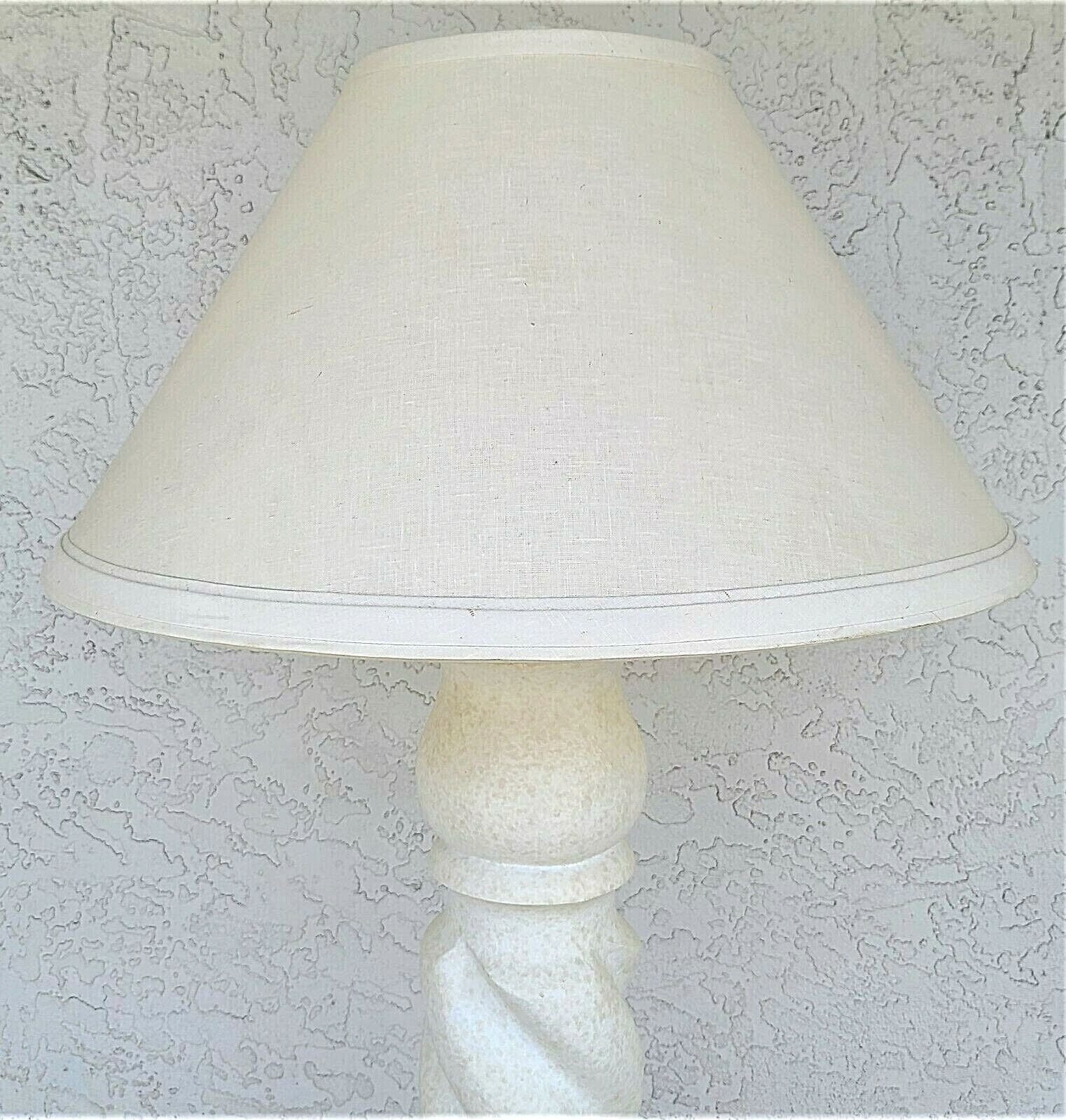 Made of hardened plaster with a subtle speckled pattern and extra long cords.