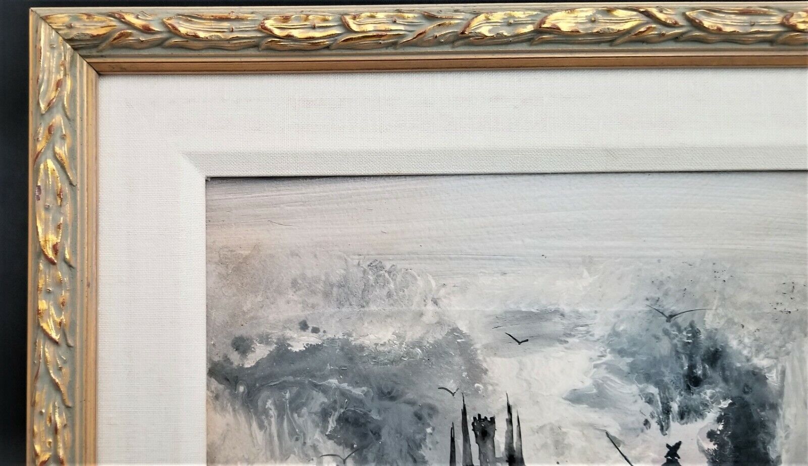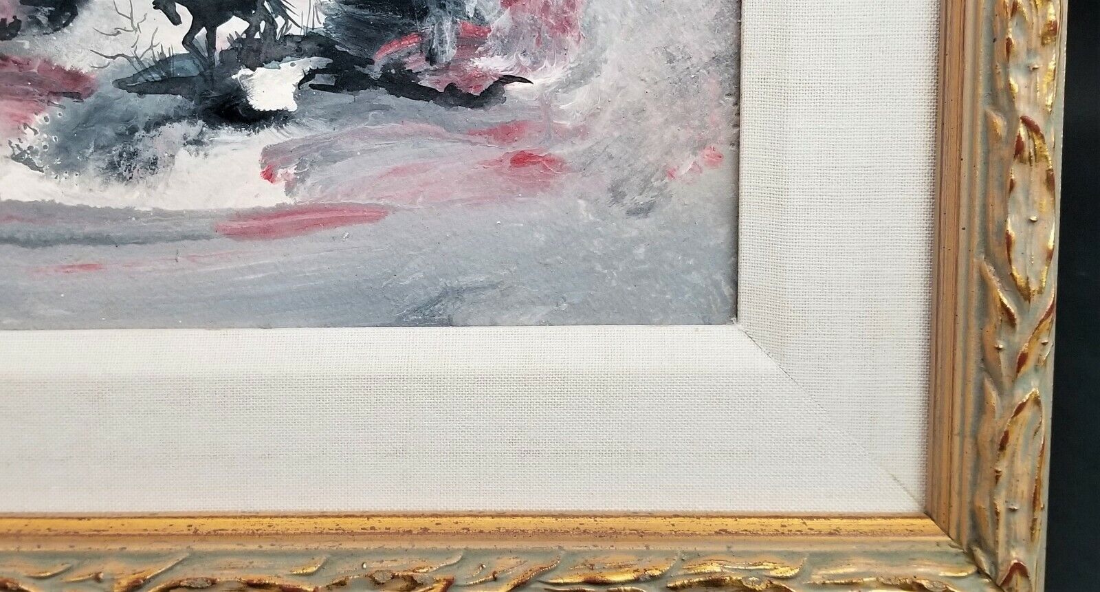 Painting and wood frame are in good condition with no notable damage. Linen matting has foxing spots throughout as shown.