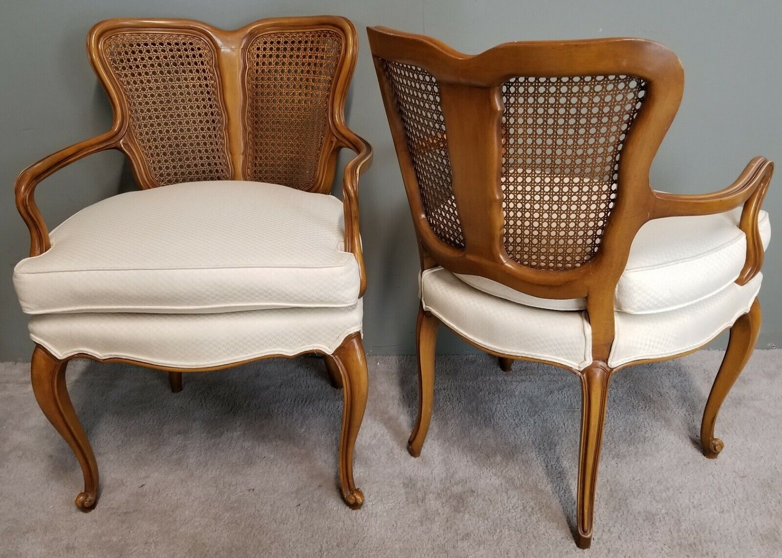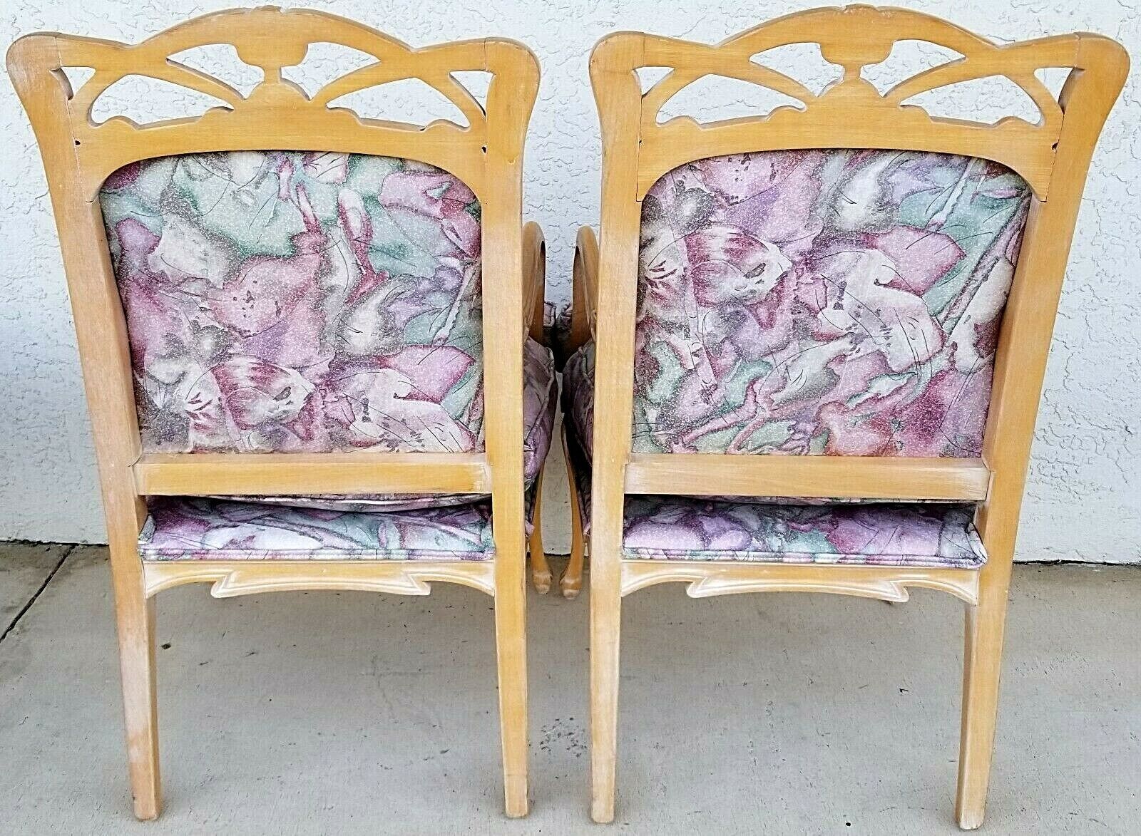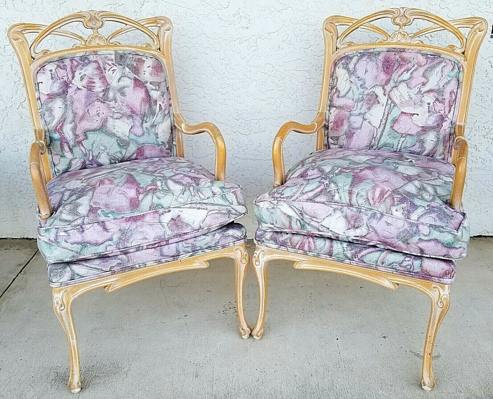 (2) French Provincial Fauteuil Carved Wood Upholstered Accent Chairs Armchairs
