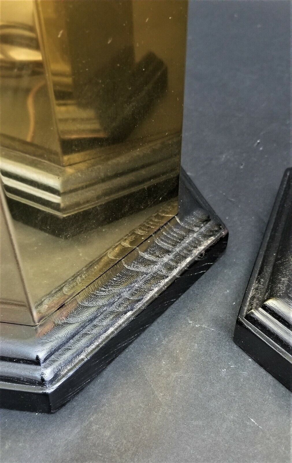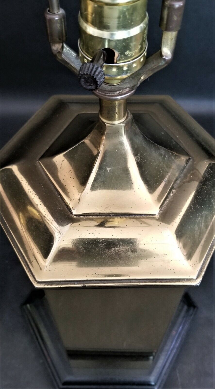 (2) Vintage Brass Asian Chinoiserie Hexagon Cannister Ginger Jar Table Lamps on wood bases.