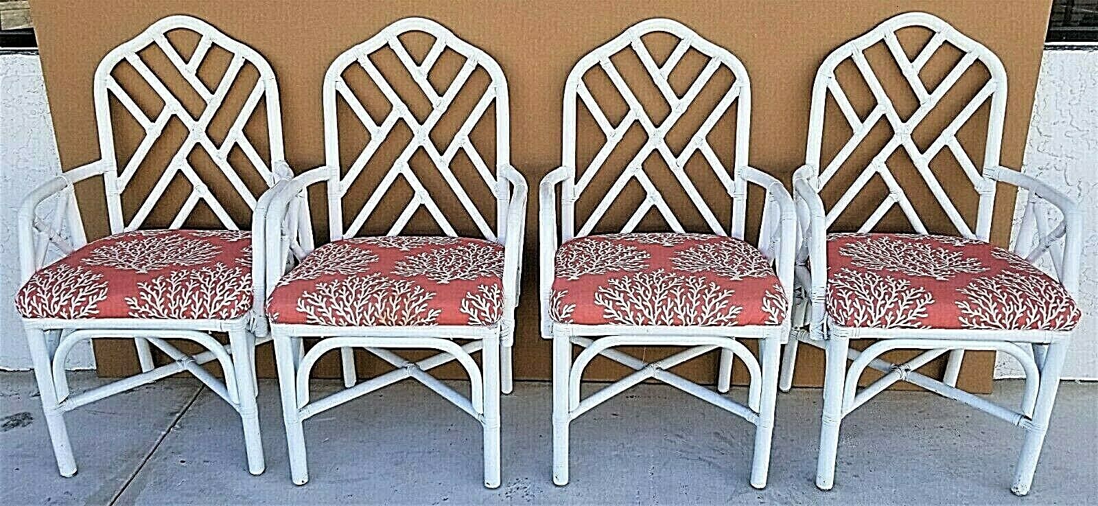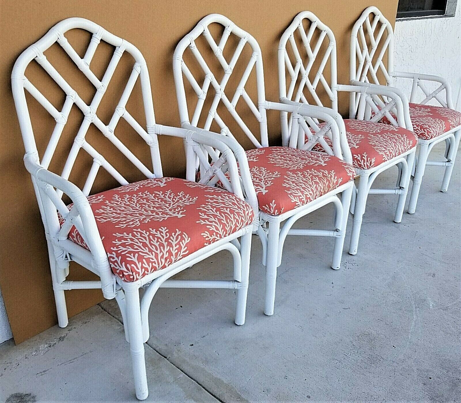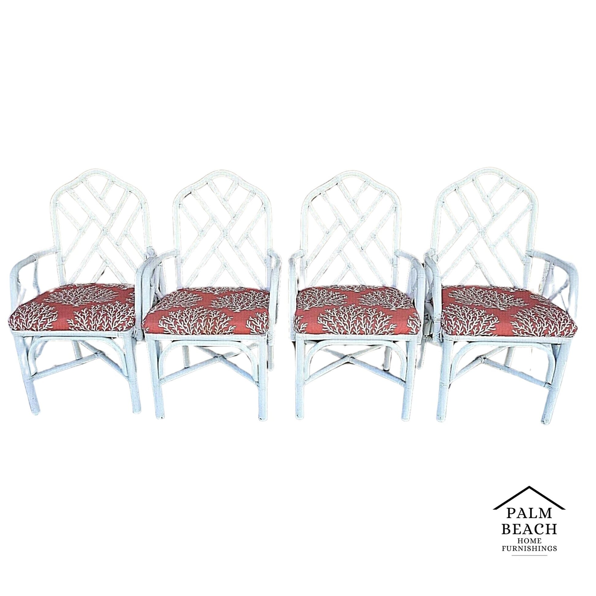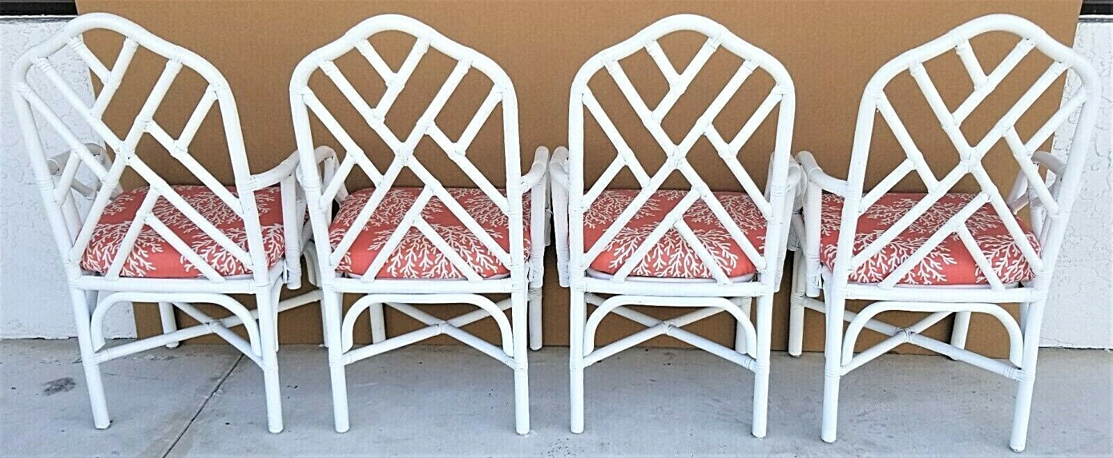 Set of (4) McGuire Style Chippendale Style Coastal MCM Bamboo Rattan Dining Armchairs in White