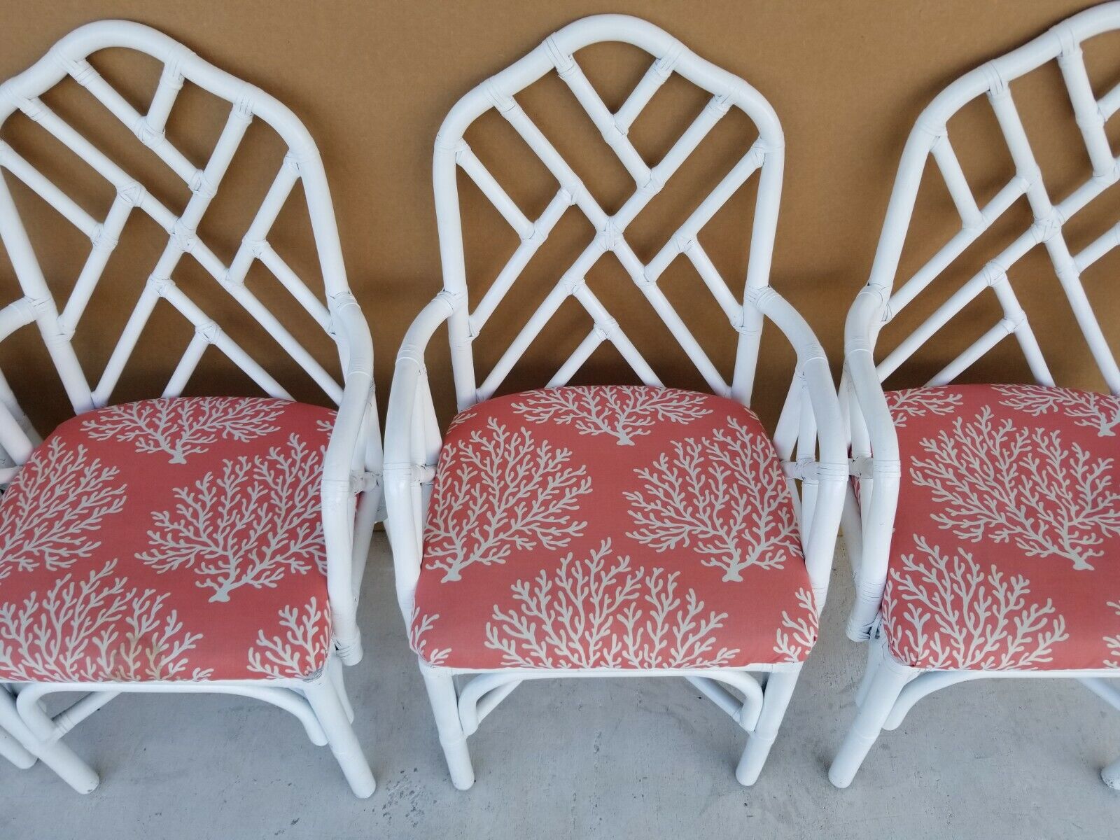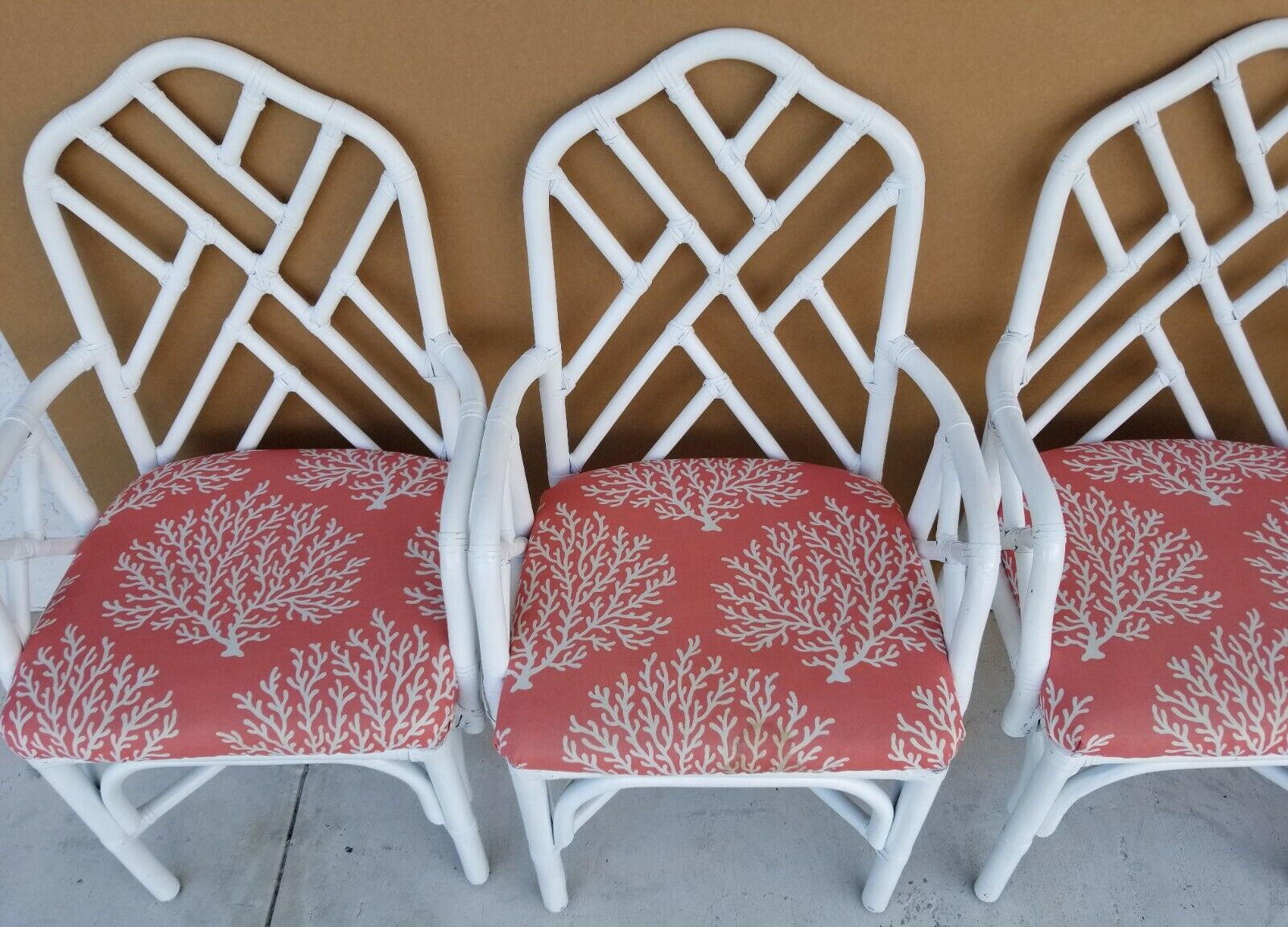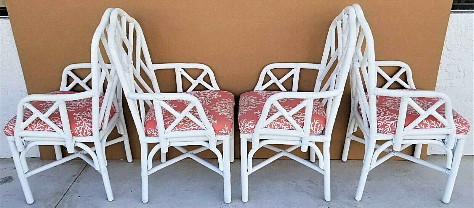 Set of (4) McGuire Style Chippendale Style Coastal MCM Bamboo Rattan Dining Armchairs in White