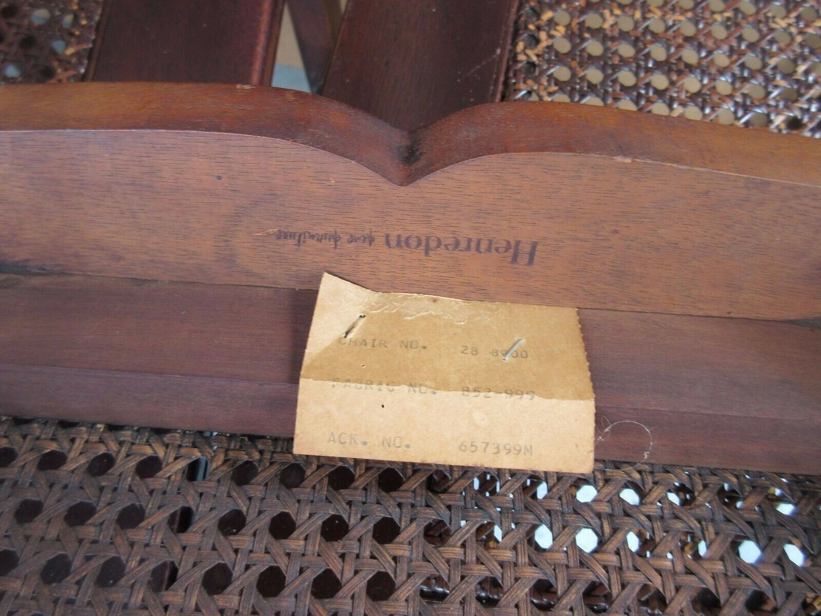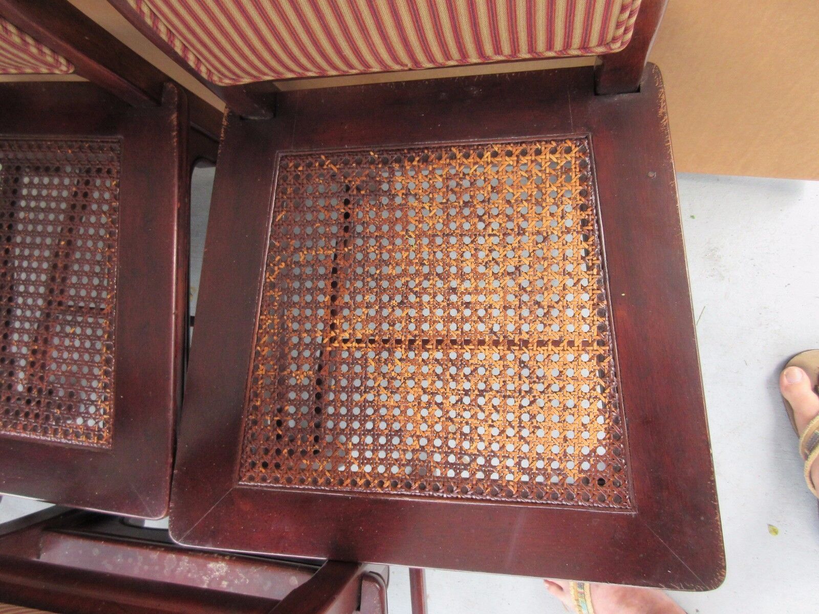 Structurally sound and sturdy with no damage to caning on seats except some wear to finish/color. No rips or tears to upholstery with a stain on one. Have nicks, dings, and scratches as shown.