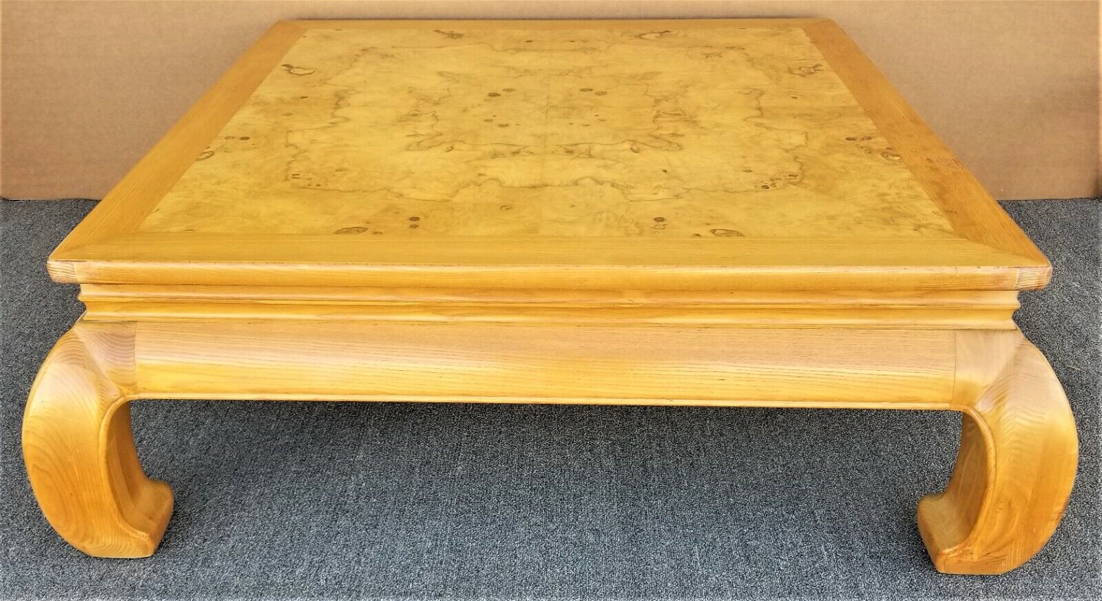 Two Olive Burl Wood Ming Asian Style Coffee Cocktail Table, as shown in last 2 photos.