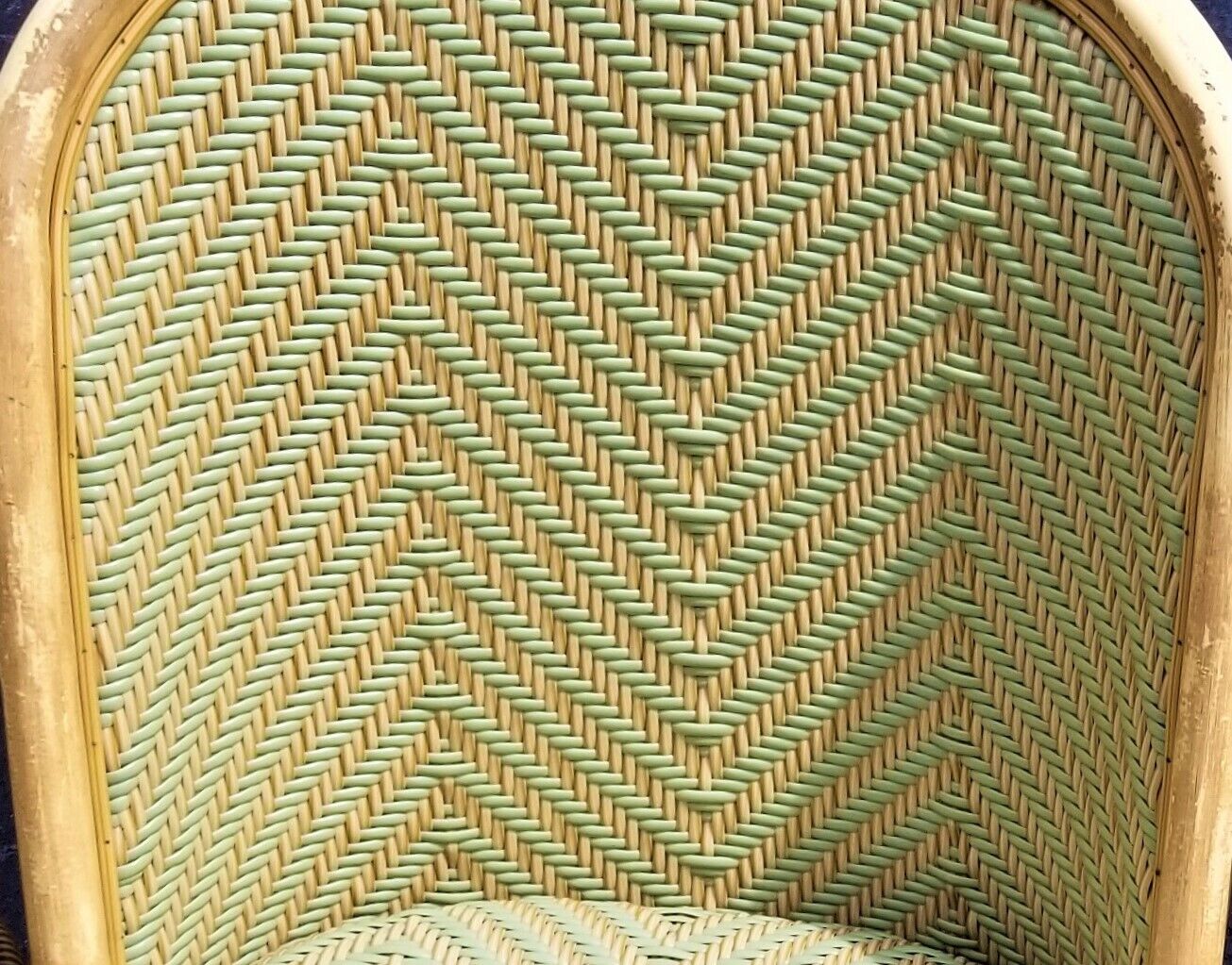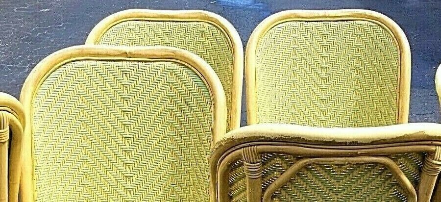 Virtually indestructible chairs. There is no notable damage to the woven strapping. There may be some dings and scratches to the faux bamboo aluminum frames mostly on the legs. They could use a thorough cleaning and will need foot protectors if used on a floor that is scratchable. There are 2 coatings on the aluminum frames. The first coating is a bamboo-like color and the second is a stain coating on top of that which makes it look more like bamboo. The top coating is worn in varying degrees on some of the tops of the chairs where you grab the chair to move it as shown. All of the coatings can be easily removed/cleaned off with just alcohol as shown in the last photo. Some of the plastic caps on the bottoms of the legs are missing so they will need to be replaced if your floor scratches easily.