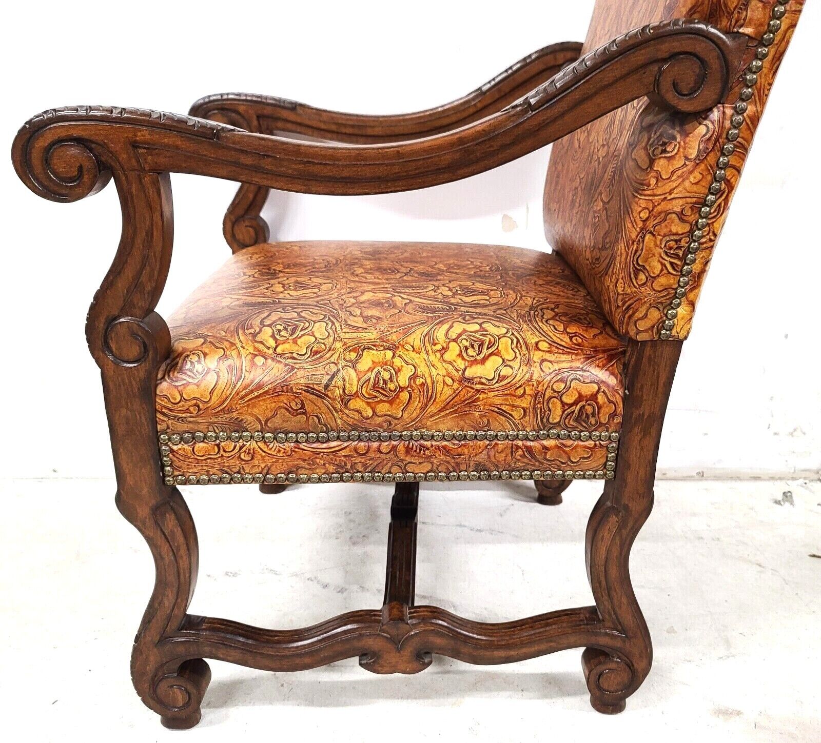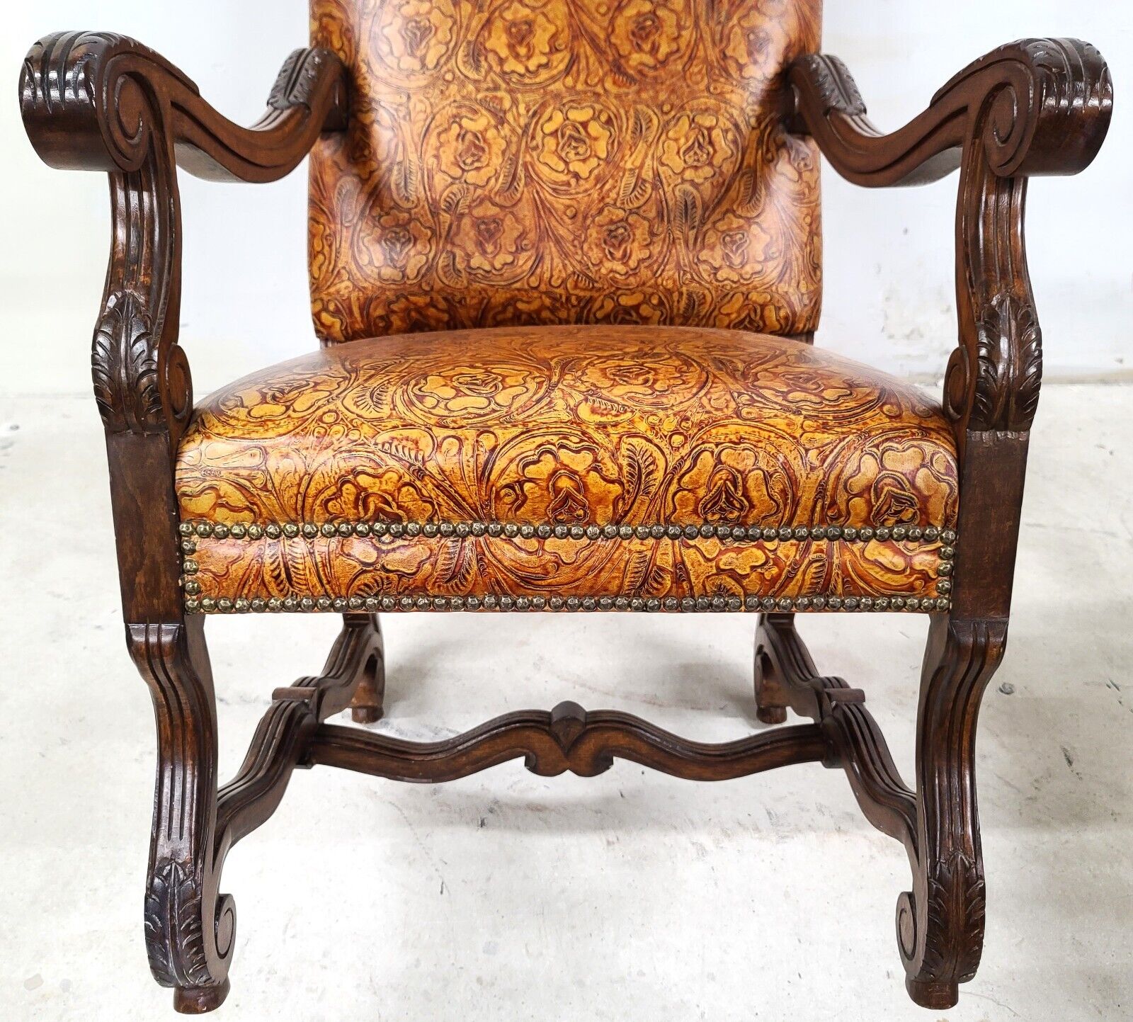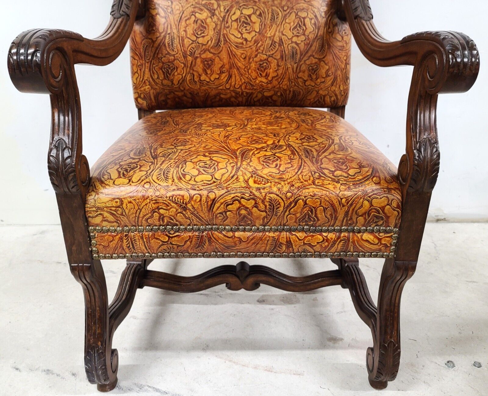 Antique French Hand Colored Tooled Leather Throne Armchair