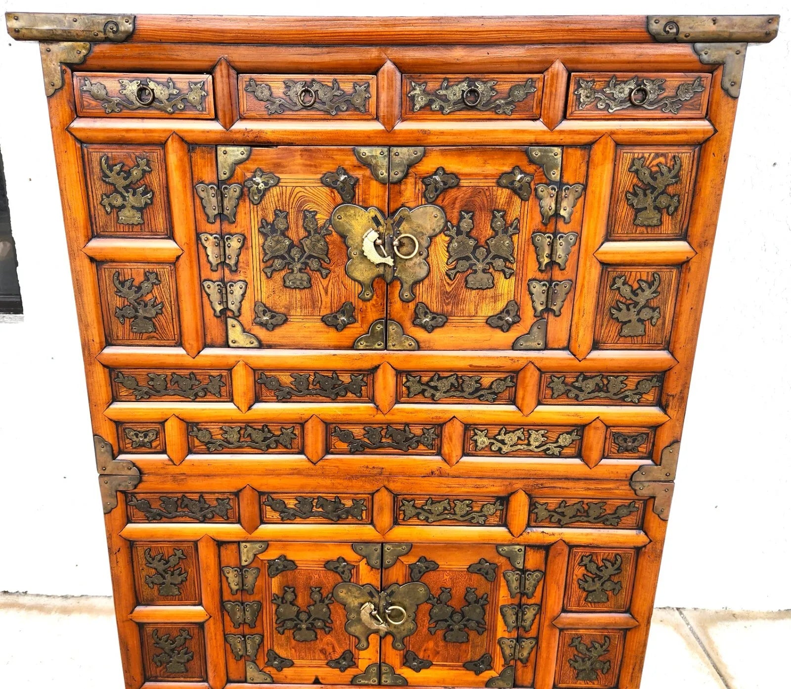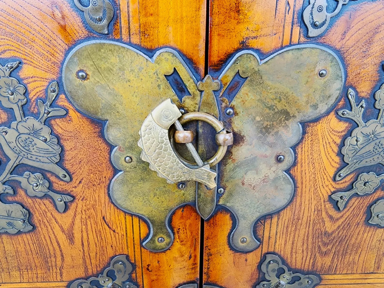 Early 19th century Korean Tansu Nong Bandaji highboy wedding chest or cabinet made of elmwood and featuring ornate brass floral, butterfly, bird accents, and 2 brass fish locks.