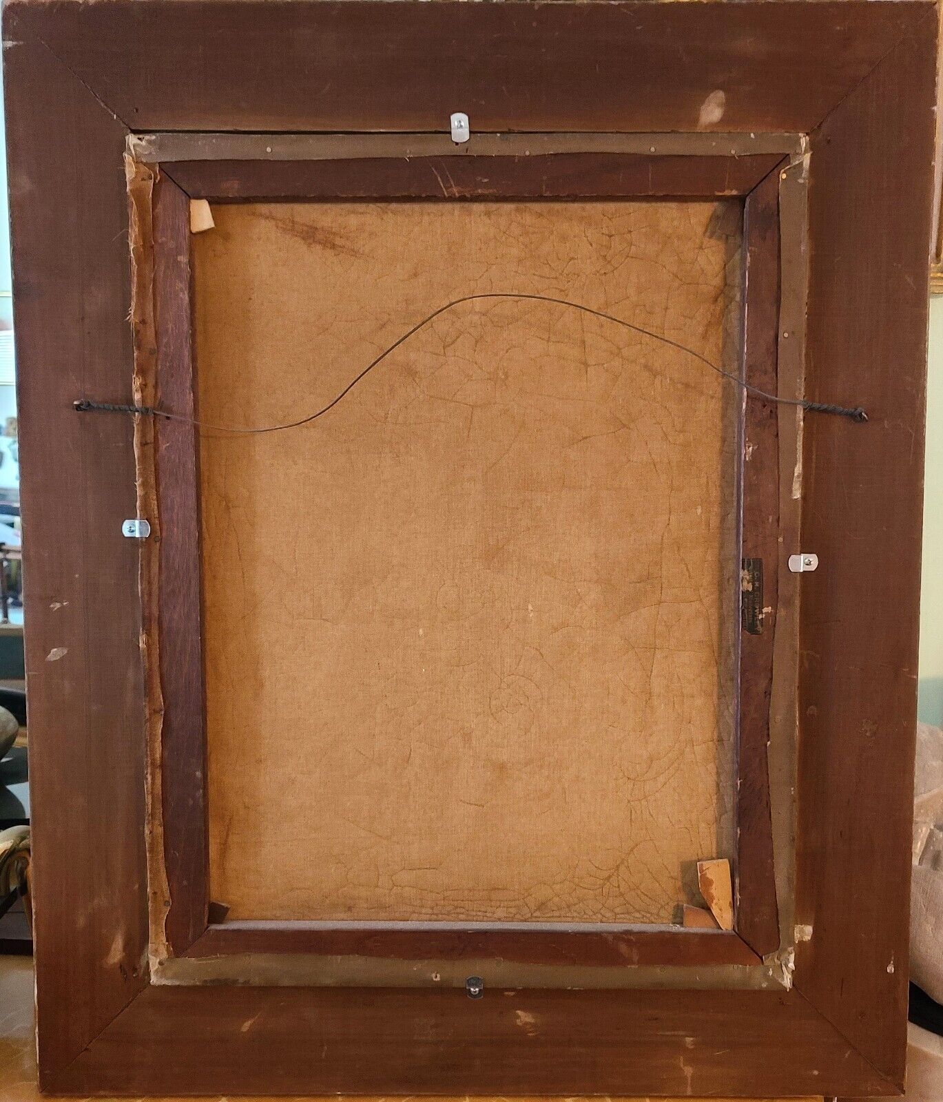 In good condition with notable damage to canvas or frame other than normal wear consistent with age and use for a 100-year-old painting. Frame has a small chip on the upper left hand corner. The photos are an important part of the item description and condition so please use the zoom feature to view them closely.