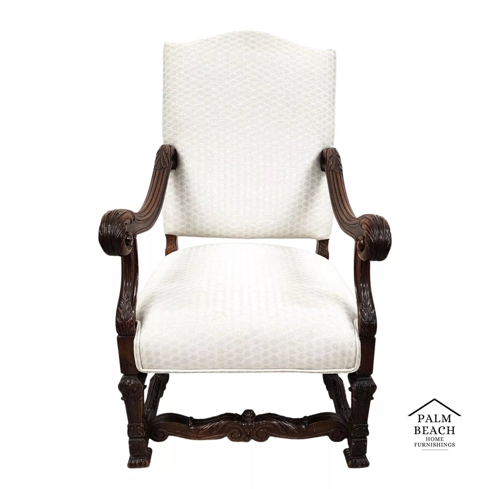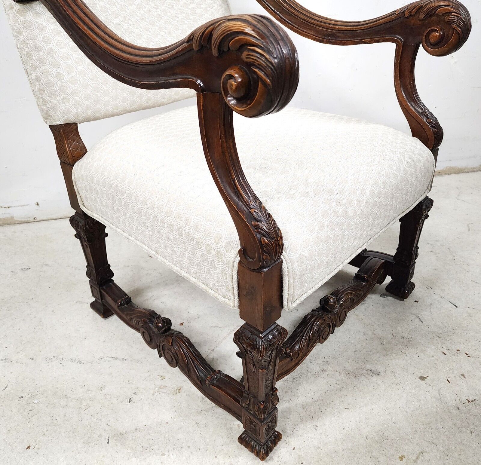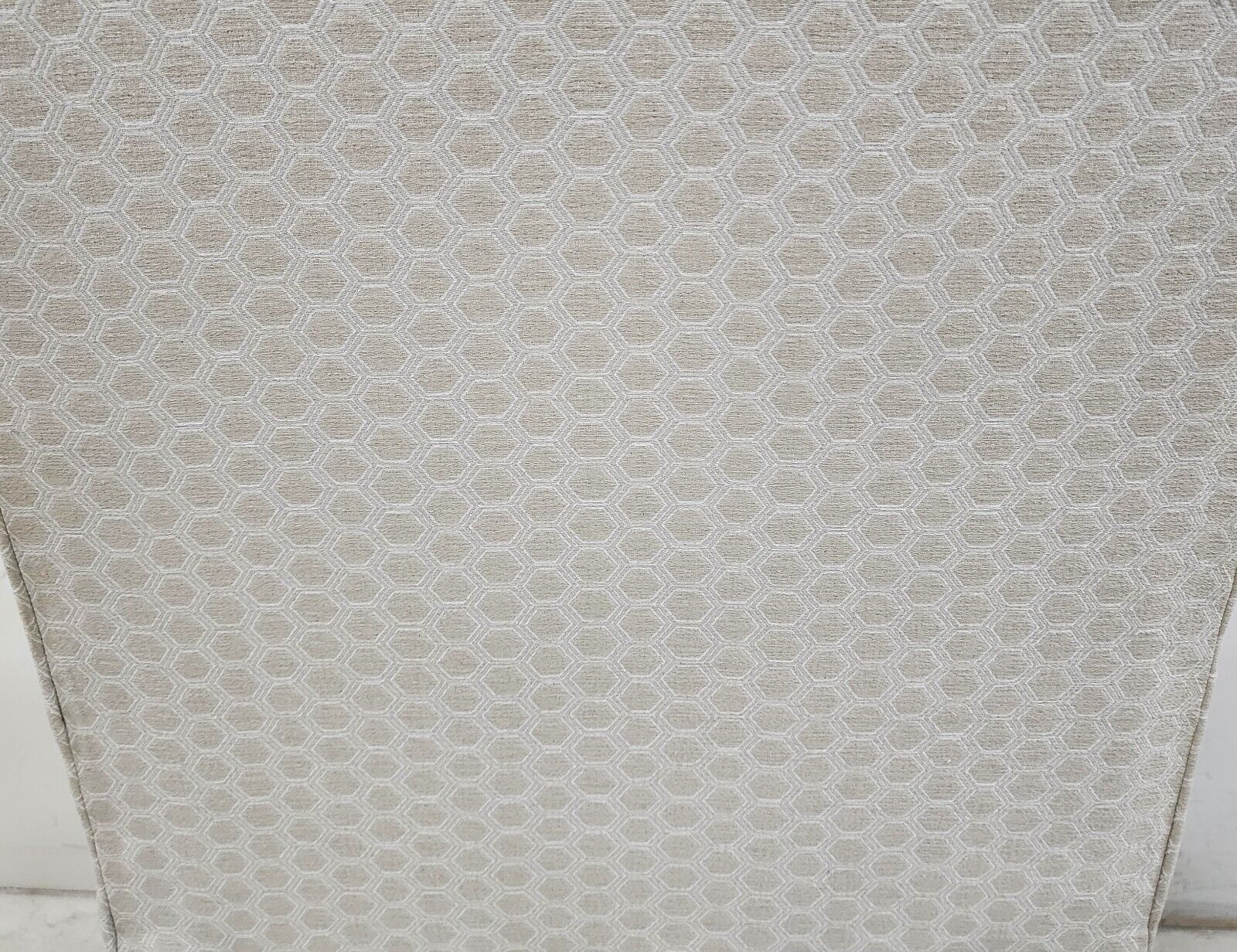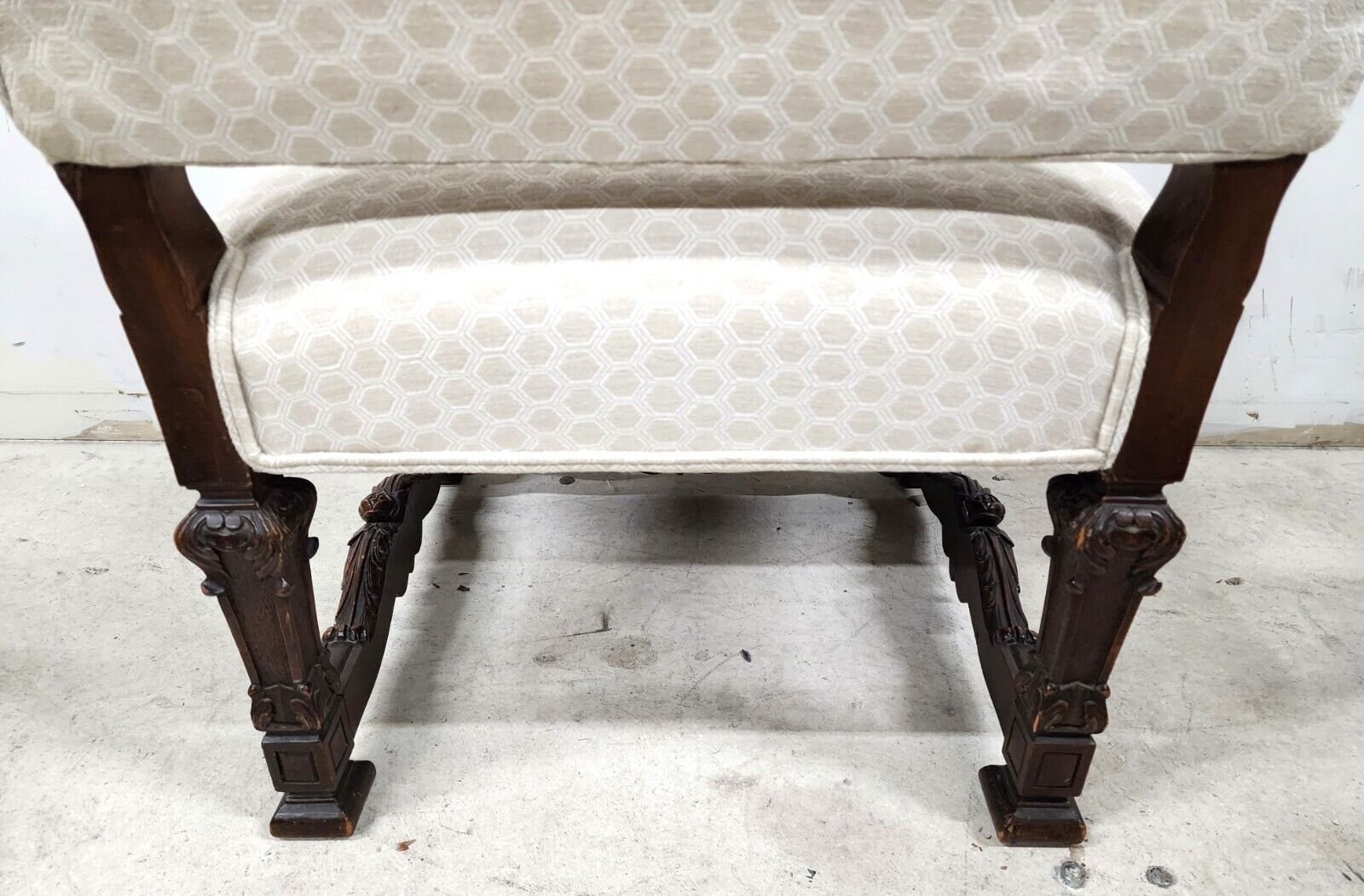 Chair is in good, structurally sound, and sturdy condition with no notable damage to the wood frame. The fabric has no stains or smells but has some light soiling on the back top as shown. We photograph our pieces in photography lights but any soiling is much less visible in normal room lighting. The photos are an important part of the item description and condition so please use the zoom feature to view them closely.