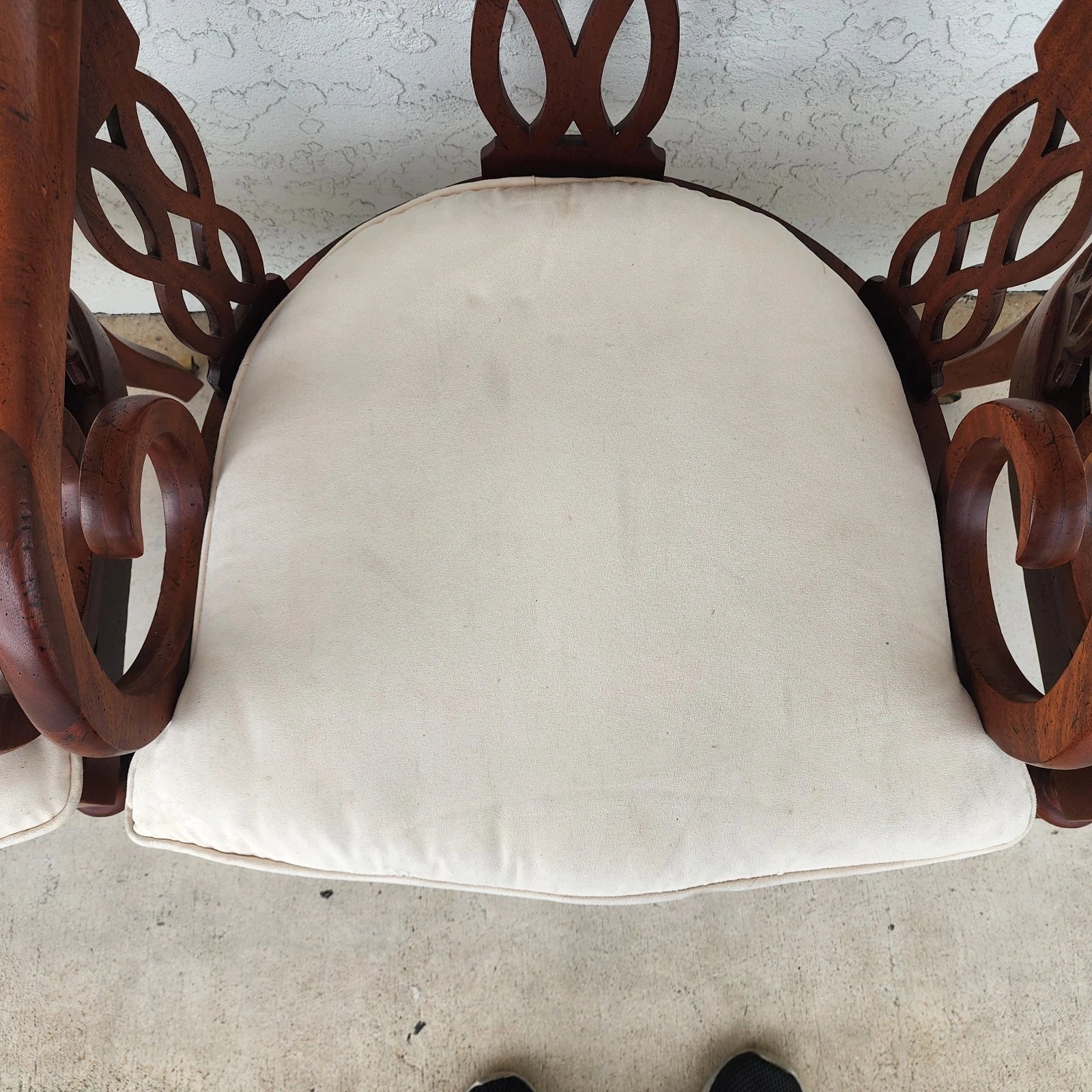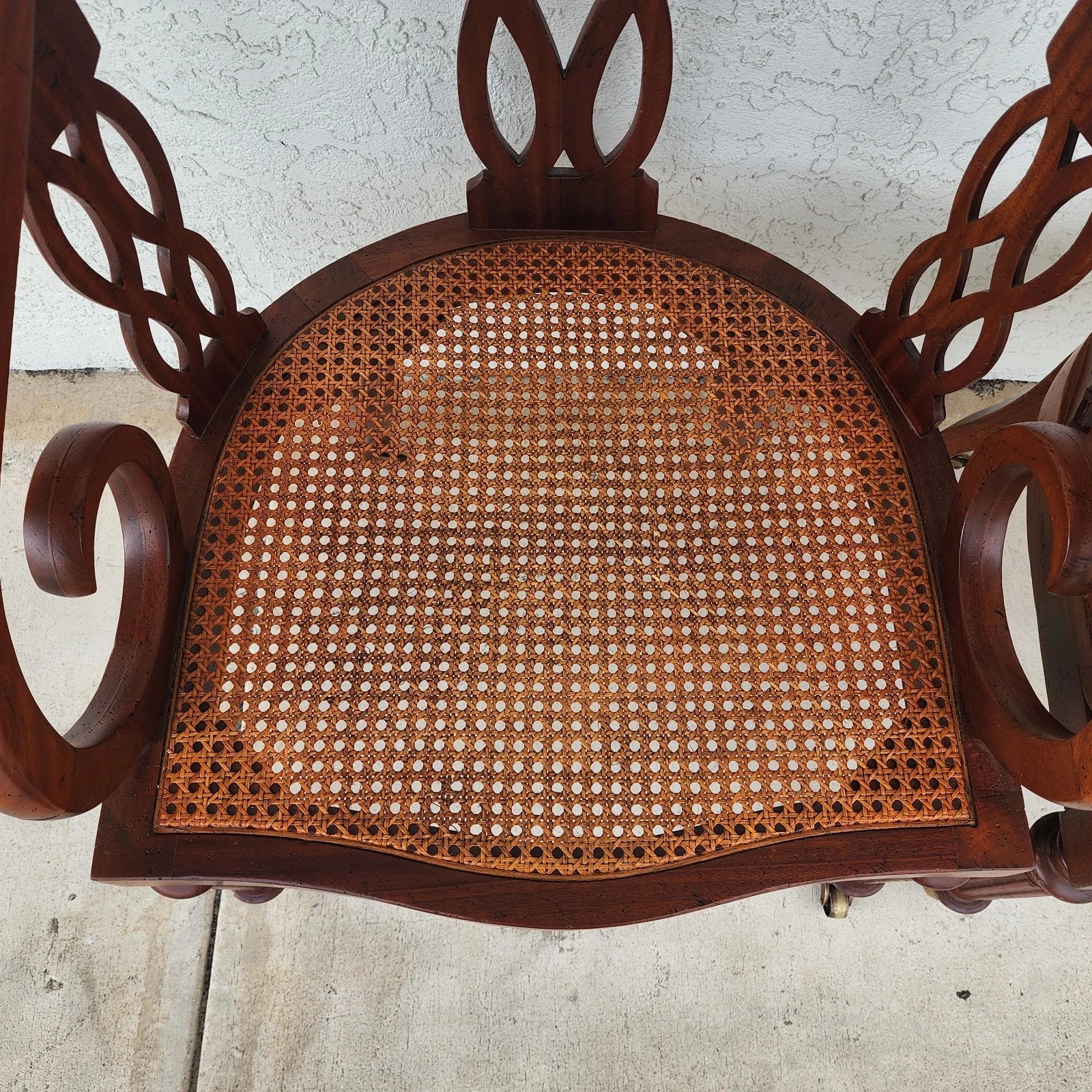 In good, structurally sound, and sturdy condition. 1 chair has a small repair to the cane seat (last photo), and there are some stains on the washable, reversible cushions. The best chair and cushion will be the 1st to be sold. The photos and video are an important part of the item description and condition so please use the zoom feature to view them closely.