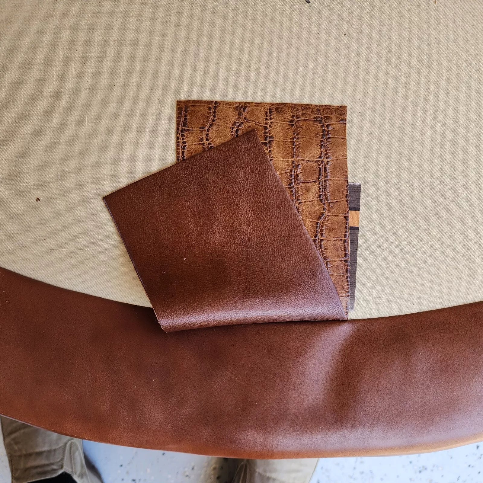 Featuring English tufted roll arms and backs, Leather panel trim below the seat, Embossed Reptile Leather on the front of the arms, and High Density foam cushions surrounded by Down Feathers for maximum comfort without sagging.
