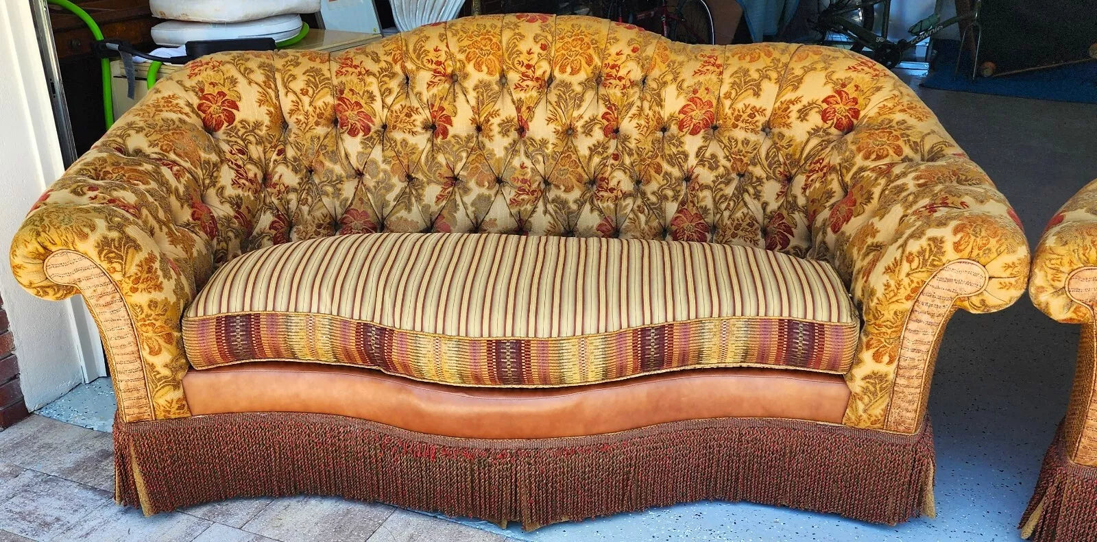 Featuring English tufted roll arms and backs, Leather panel trim below the seat, Embossed Reptile Leather on the front of the arms, and High Density foam cushions surrounded by Down Feathers for maximum comfort without sagging.