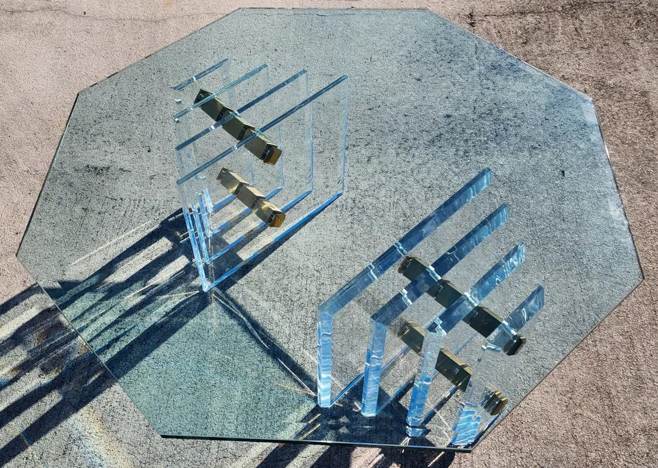Lucite & Brass Pedestal Bases with Original Beveled Octagonal Glass Top