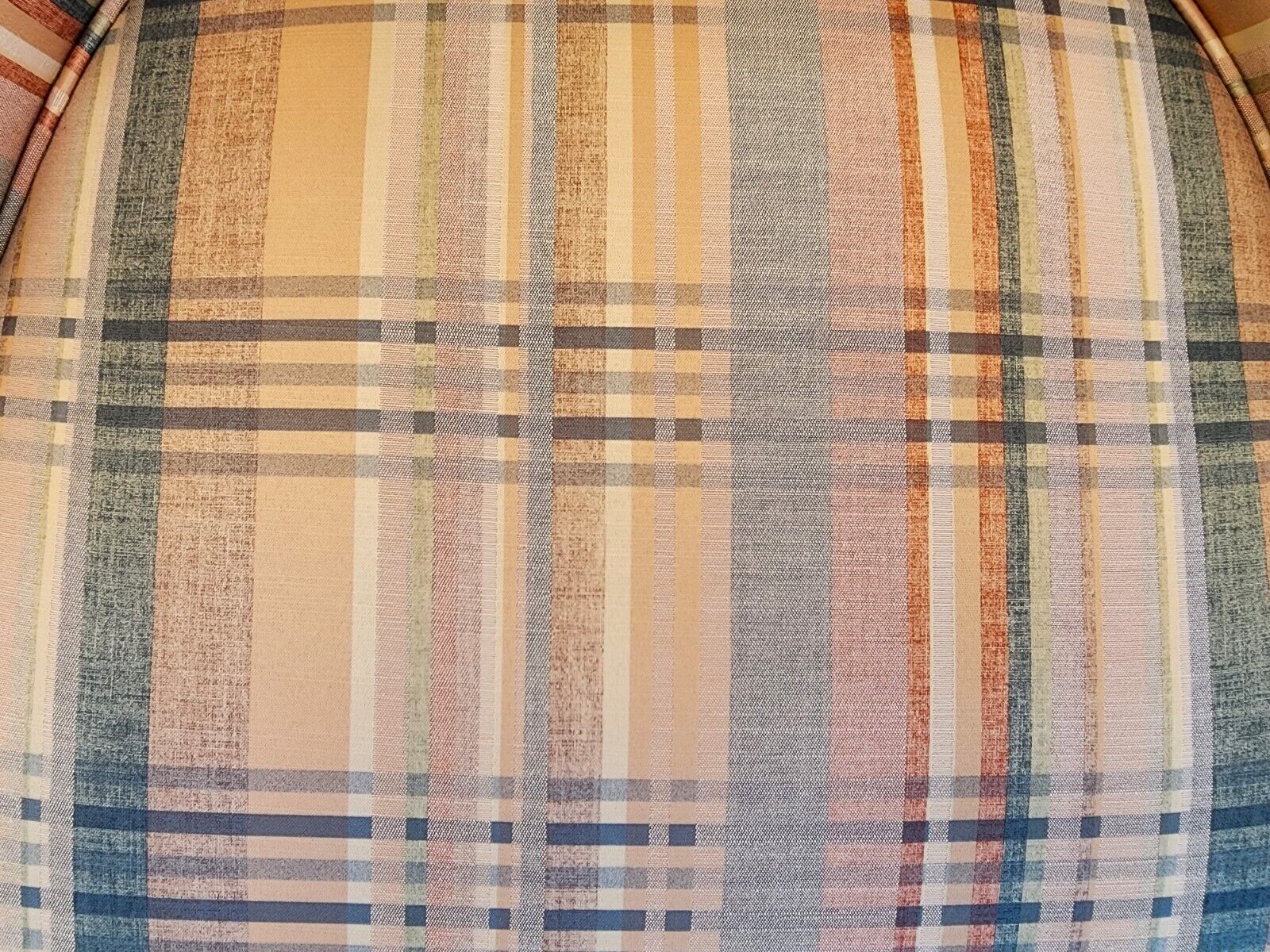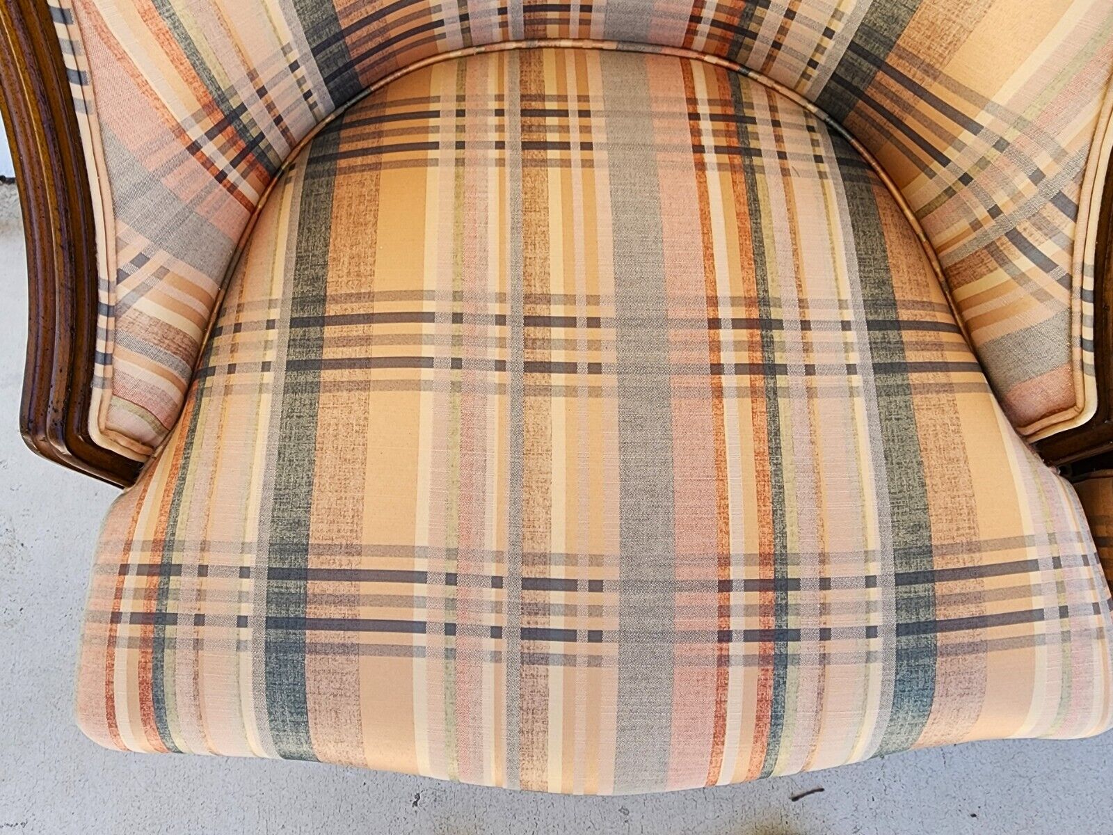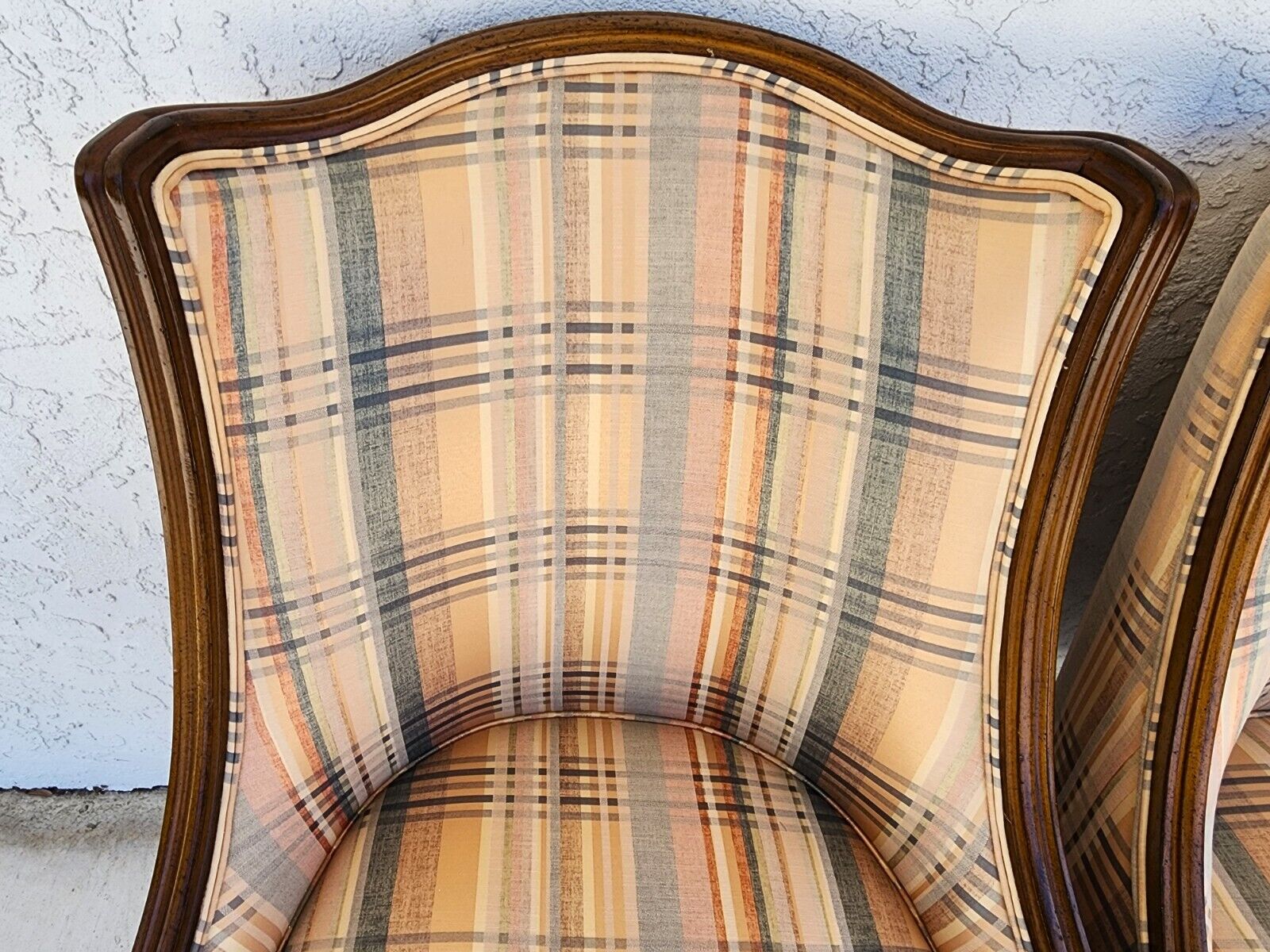 In good, structurally sound, and sturdy condition. No notable damage to the wood frames. Fabric is clean with no fading, smells or other notable damage EXCEPT both chairs have a small, faint stain on their left front sides of the seats, and a small spot on the back of 1 chair as shown in the last 3 photos. The photos are an important part of the item description and condition so please use the zoom feature to view them closely.