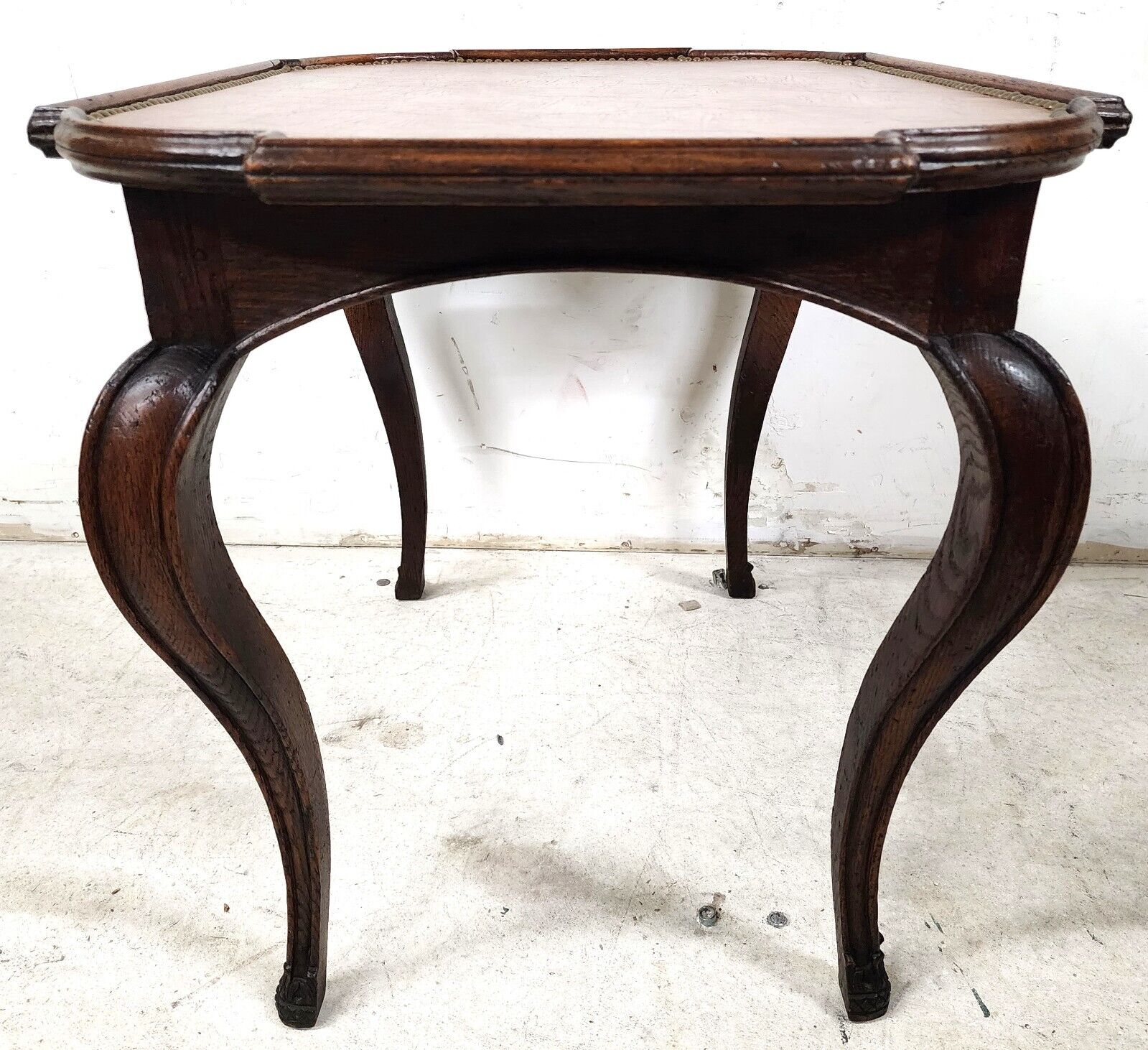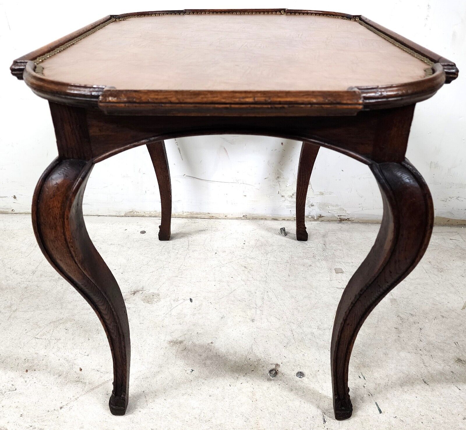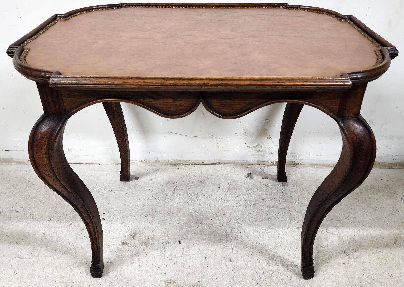 Antique Country French Oak Side End Center Table with Leather Top and Brass Nail Trim