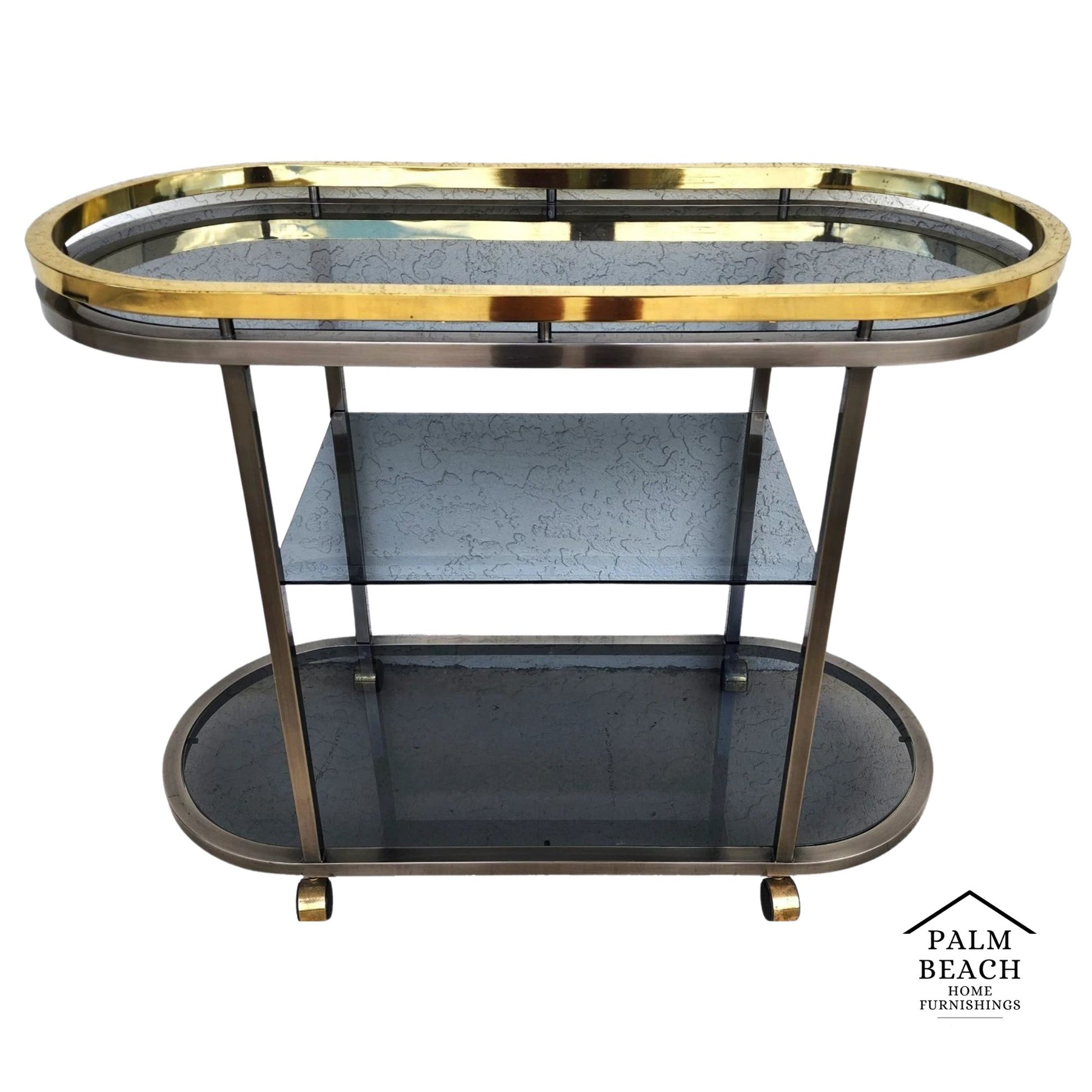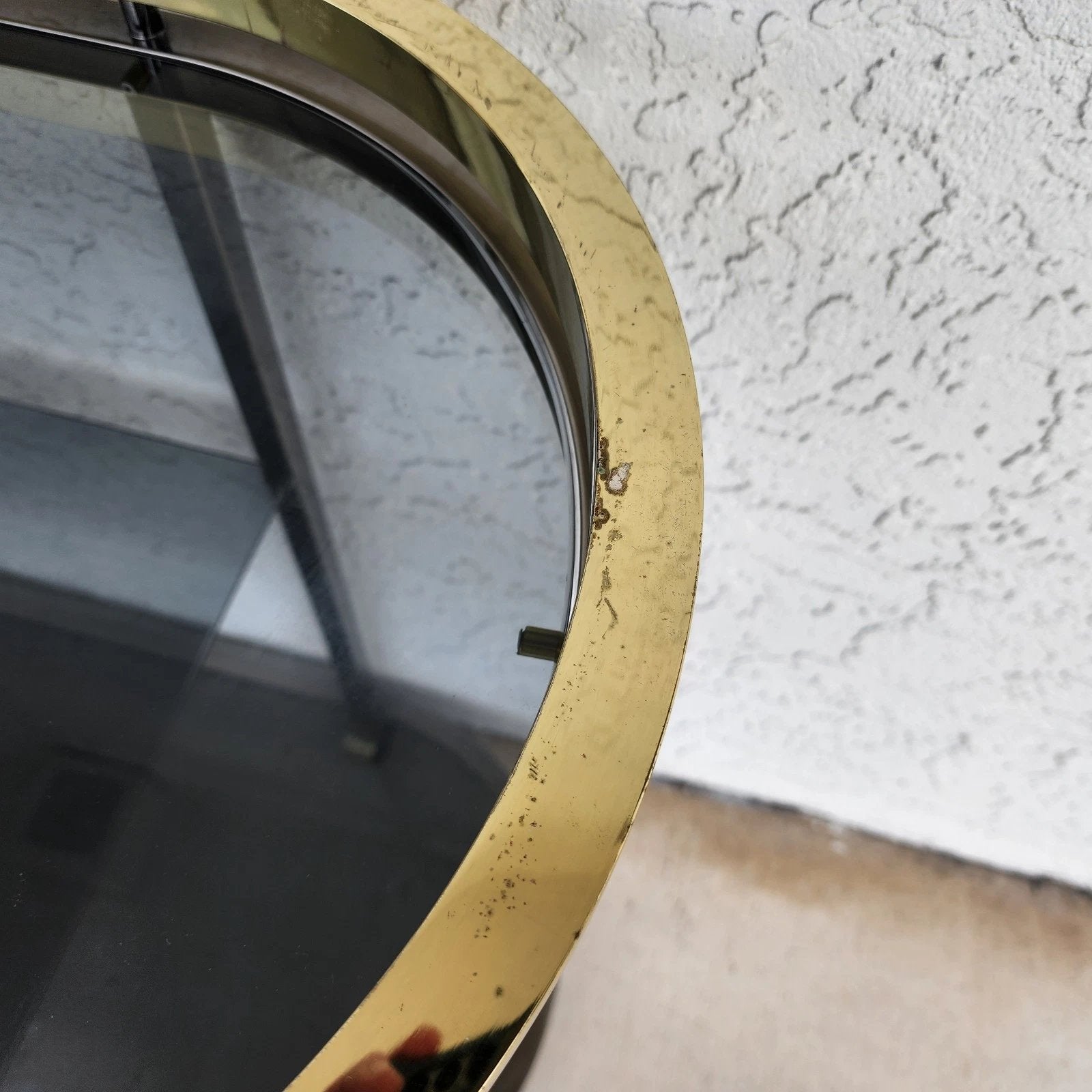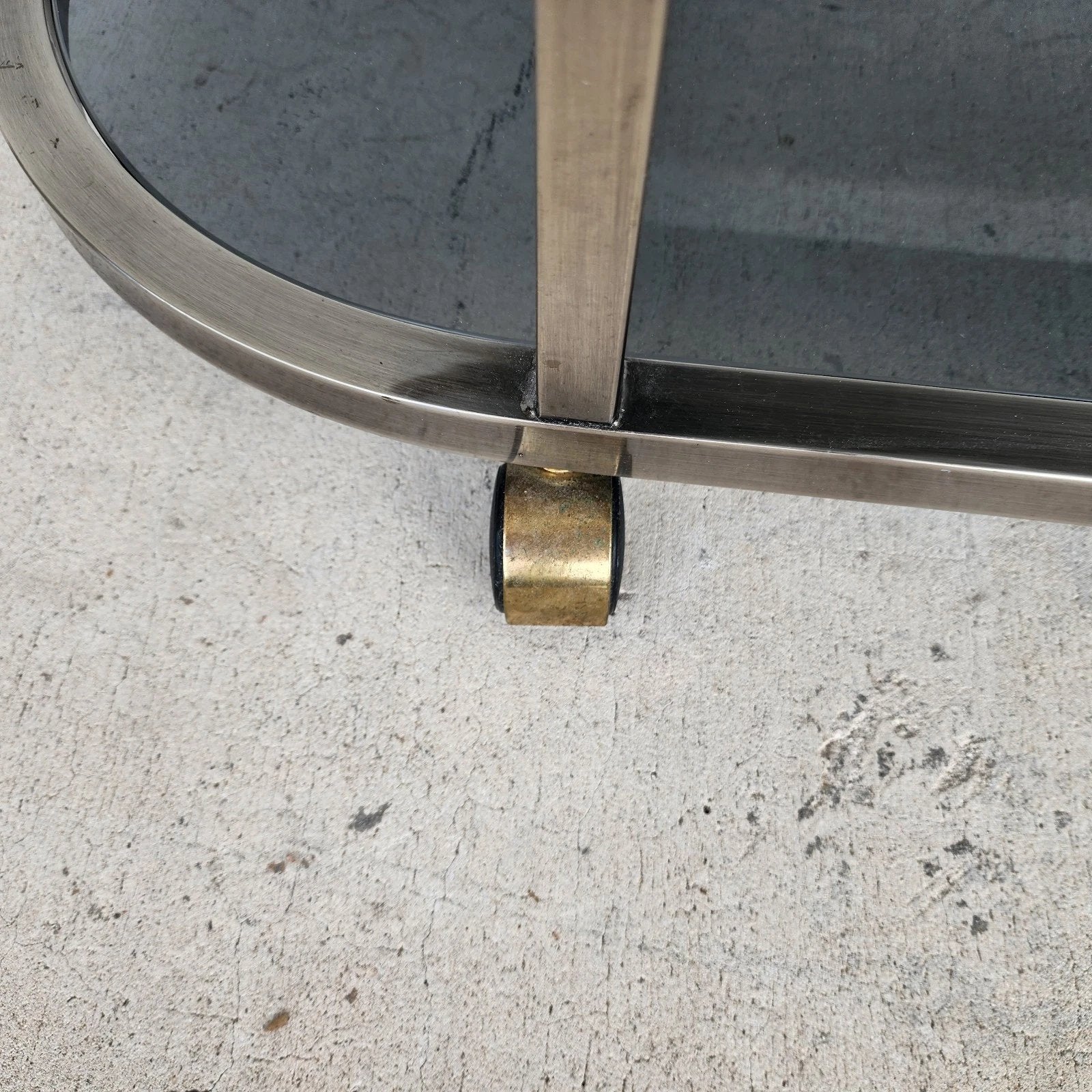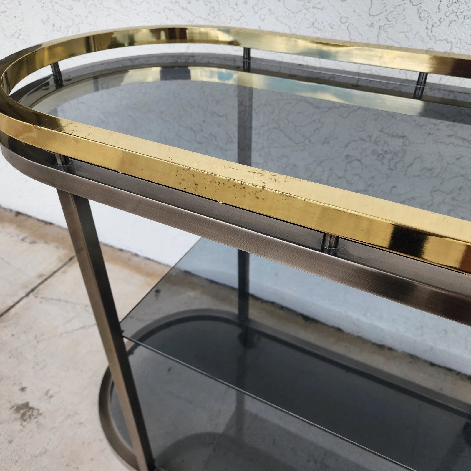 In good, structurally sound condition with all new smoked glass. There is some wear on the top rail as shown in the last 5 photos and video. The brass finish on the top rail can be polished off, removing these imperfections. The photos and video are an important part of the item description and condition so please use the zoom feature to view them closely.