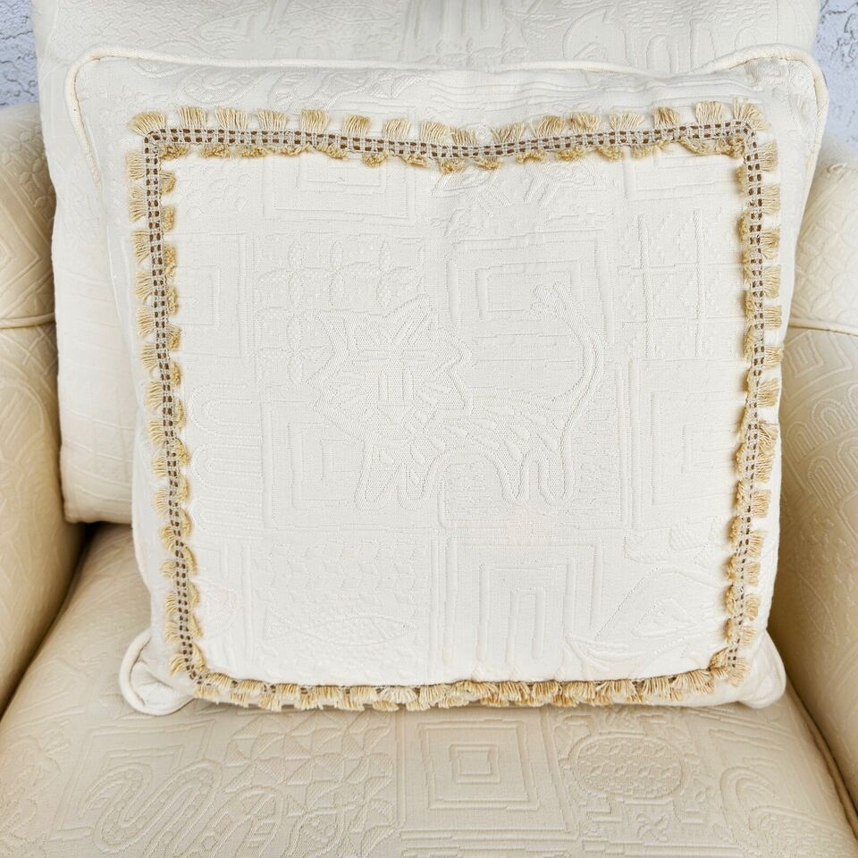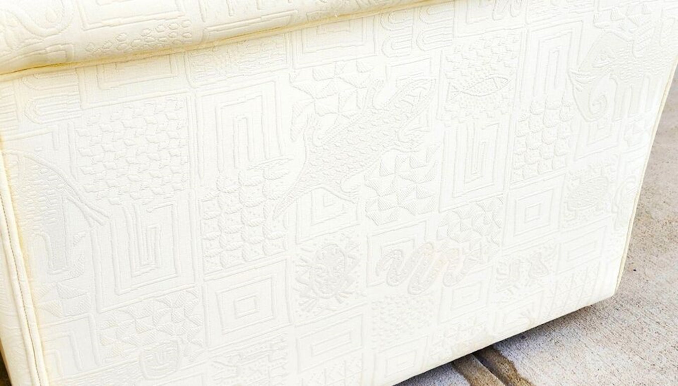 Rarely have we offered such a magnificent set of chairs. They are upholstered in a fun, whimsical very heavy 100% cotton with subtle Hieroglyphic style images of Elephants, Lions, and other Animals.