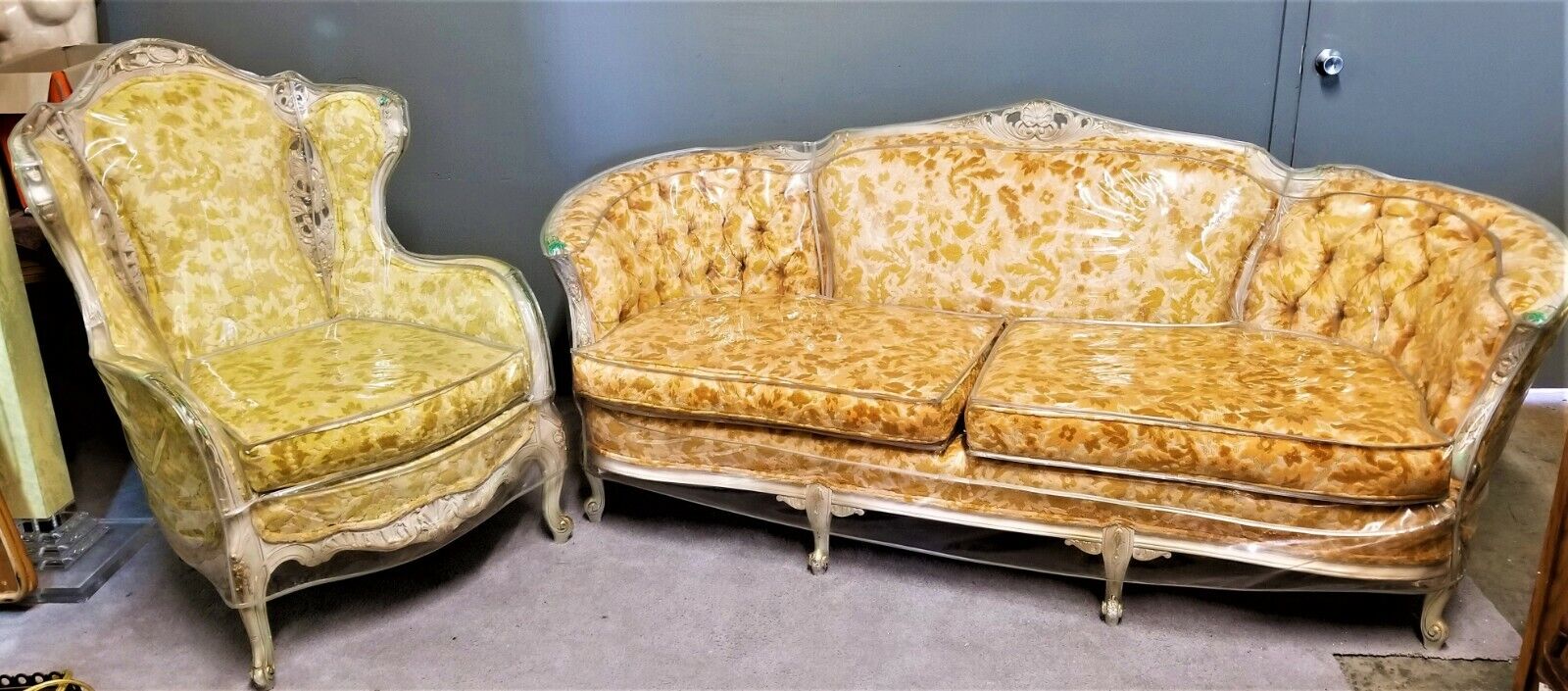 It has always been covered in custom made plastic covers (which will be included when delivered) so there are no stains, fading or other notable damage to fabric or wood. Velvet fabric appears to be lighter in areas but this is because the way and angle light hits them.