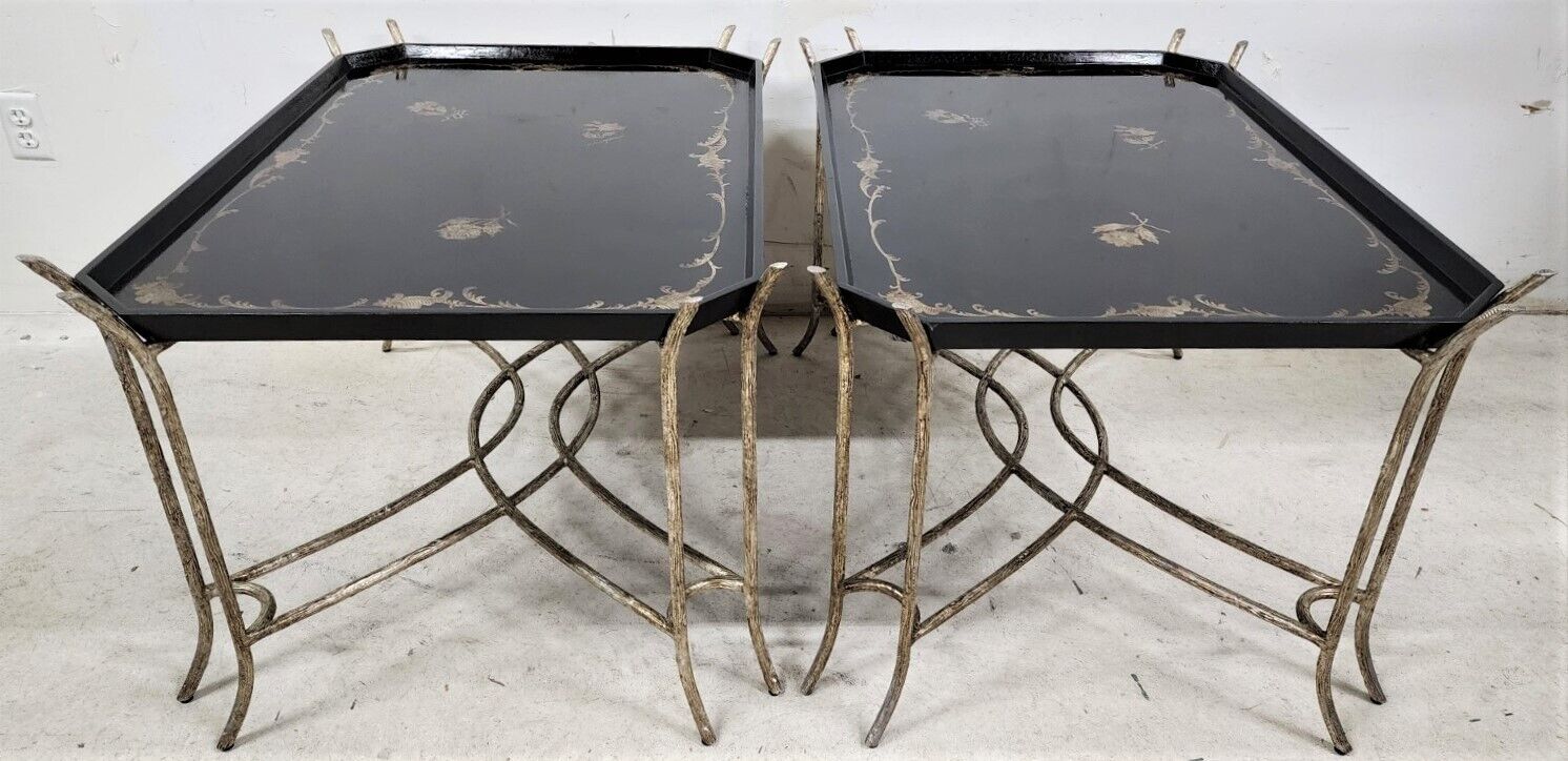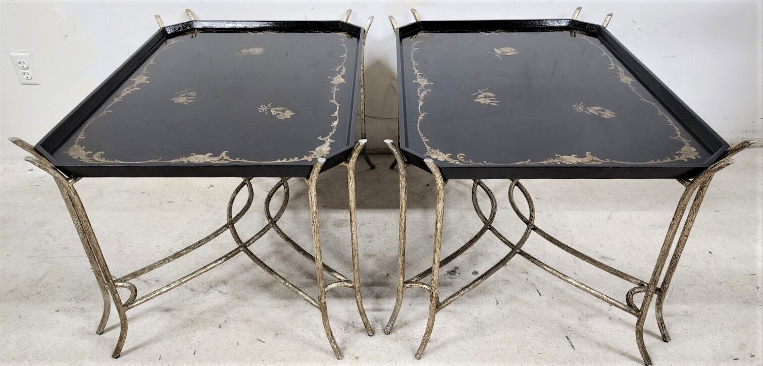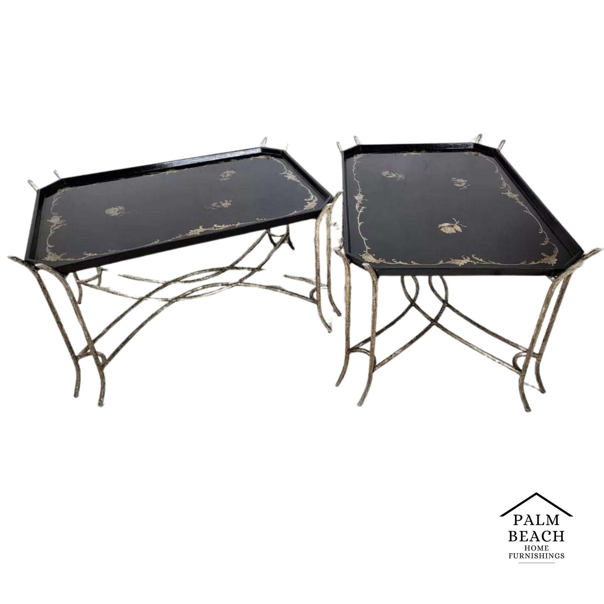 Featuring silver leafed faux bois cast iron frames and lacquered black top trays.