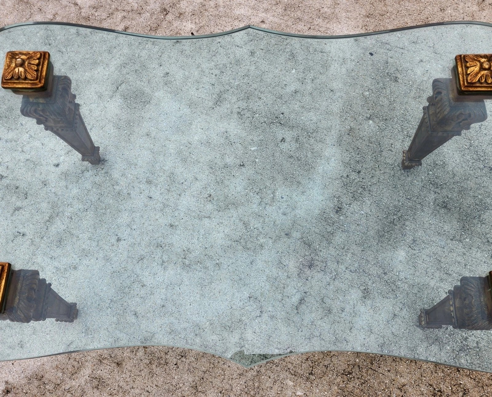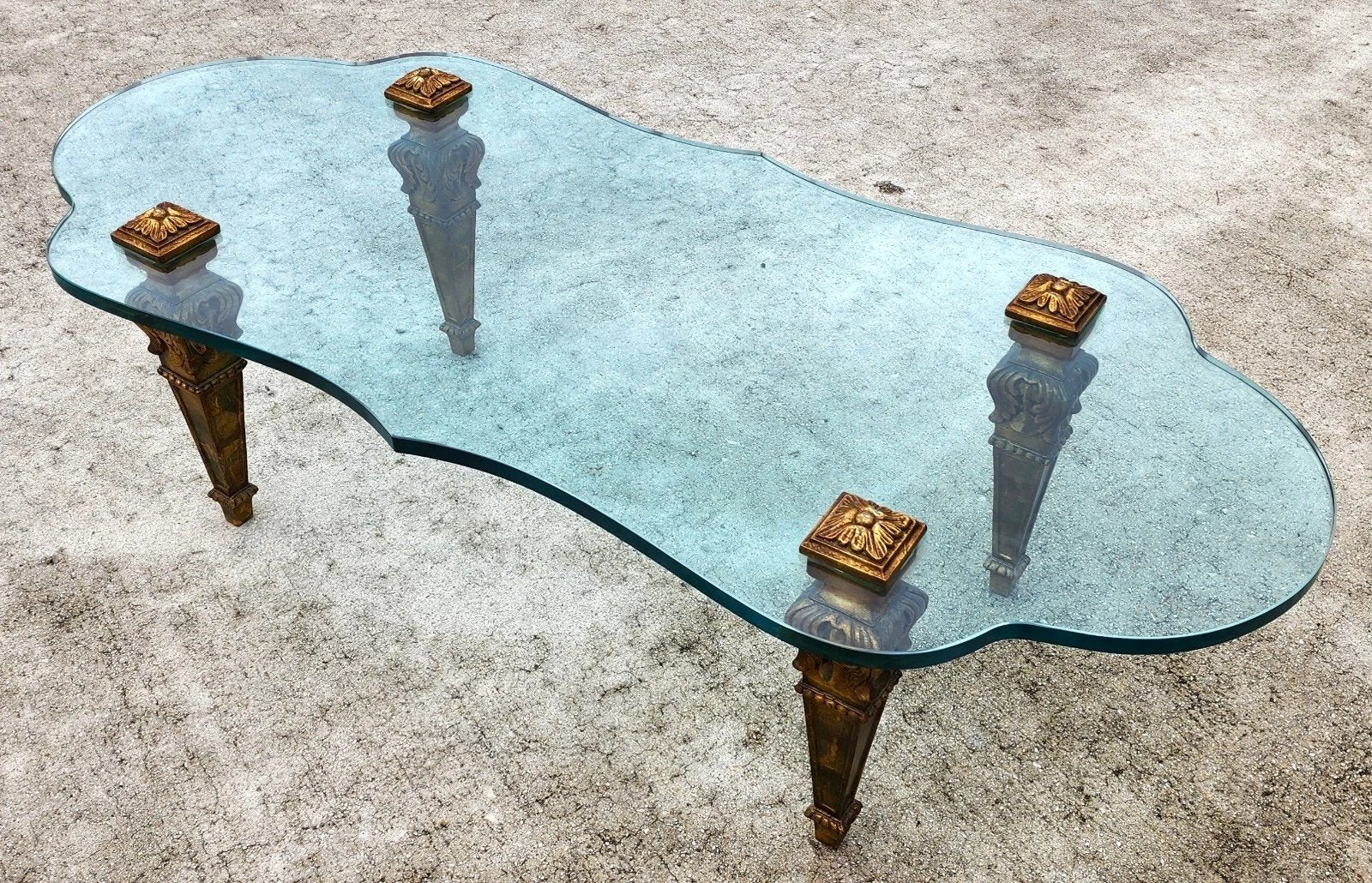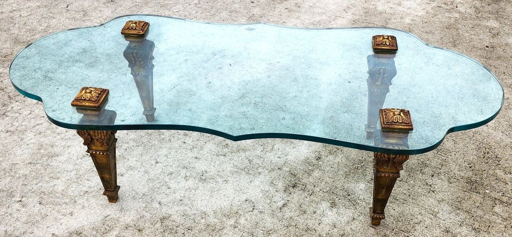 In good, structurally sound, and sturdy with no chips, nicks, or other notable damage to the glass. Carved solid giltwood leg supports have some minor spots of wear. The photos and video are an important part of the item description and condition so please use the zoom feature to view them closely.