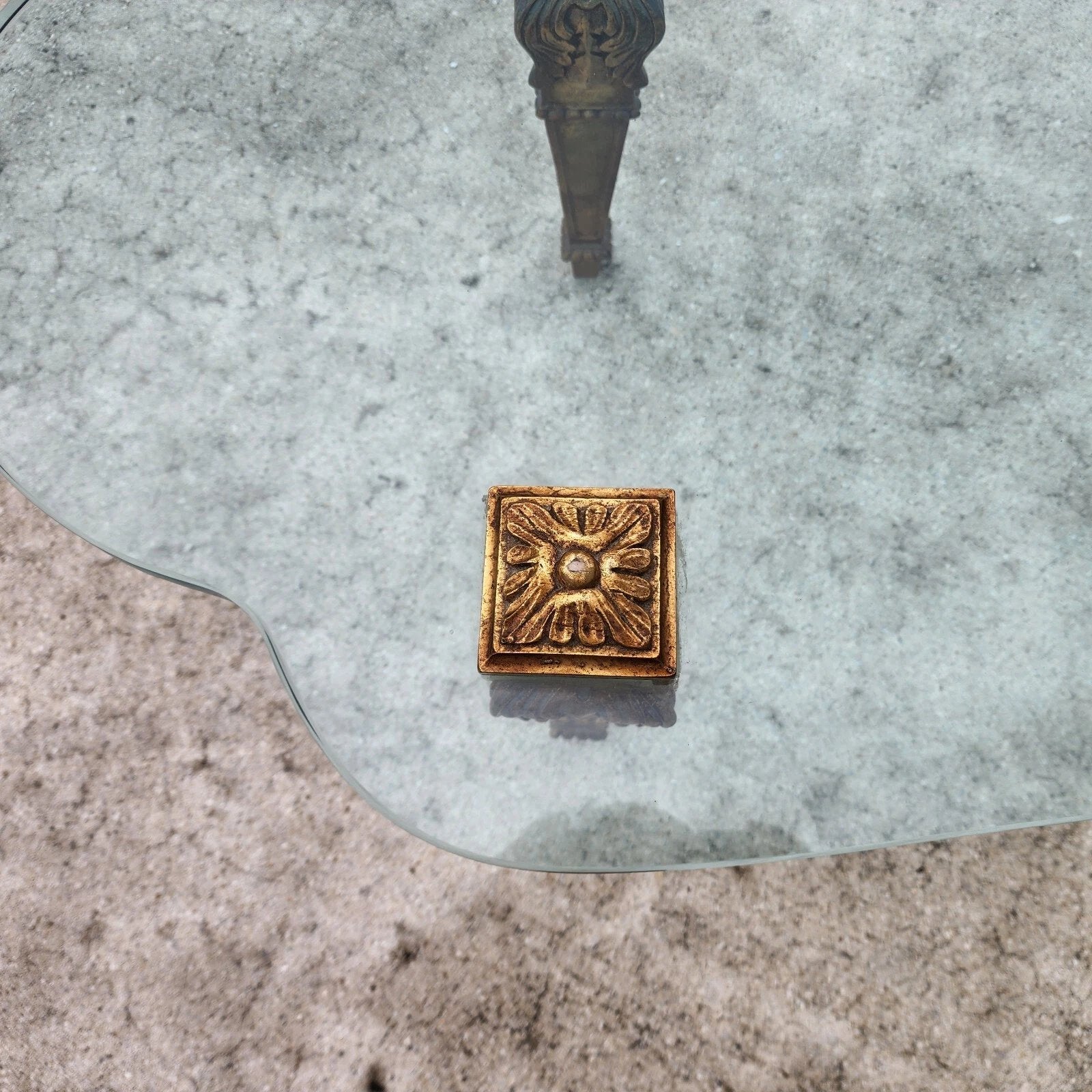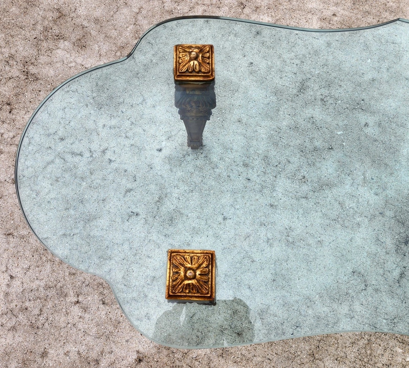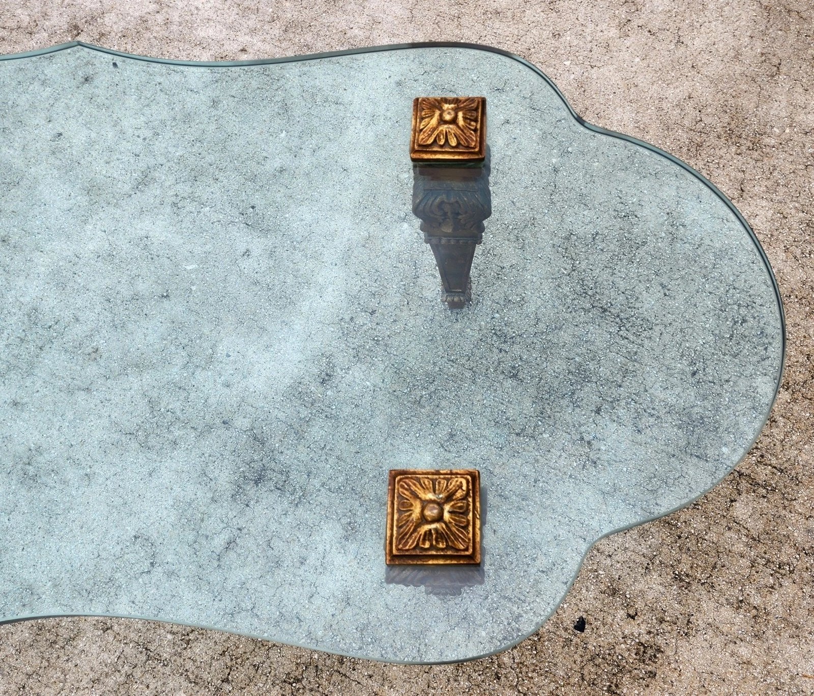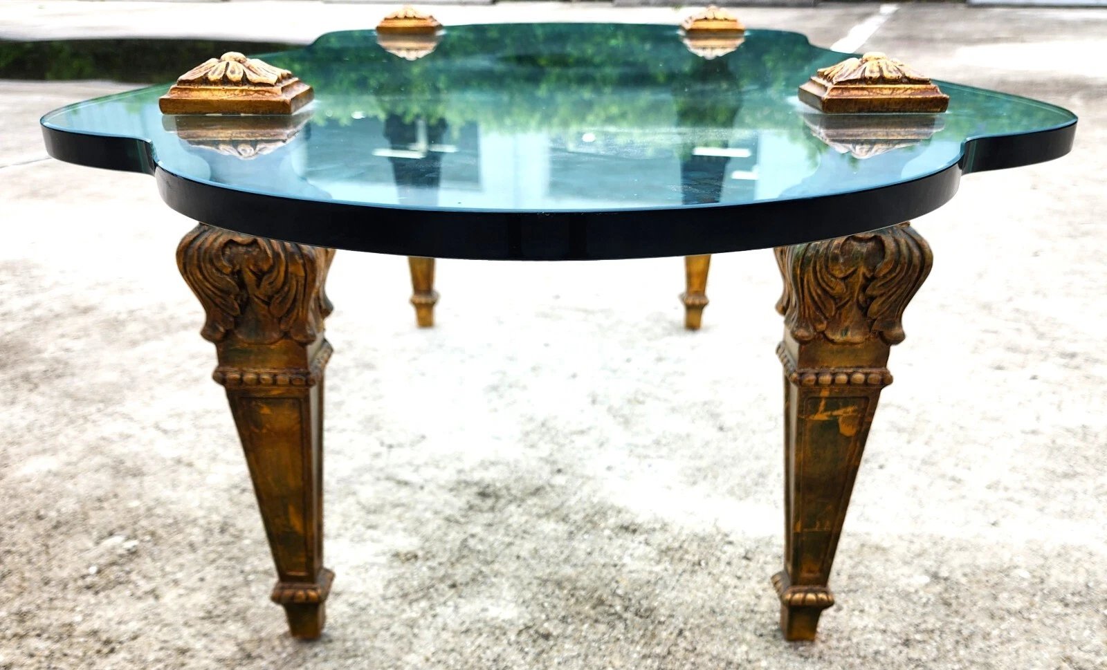 In good, structurally sound, and sturdy with no chips, nicks, or other notable damage to the glass. Carved solid giltwood leg supports have some minor spots of wear. The photos and video are an important part of the item description and condition so please use the zoom feature to view them closely.
