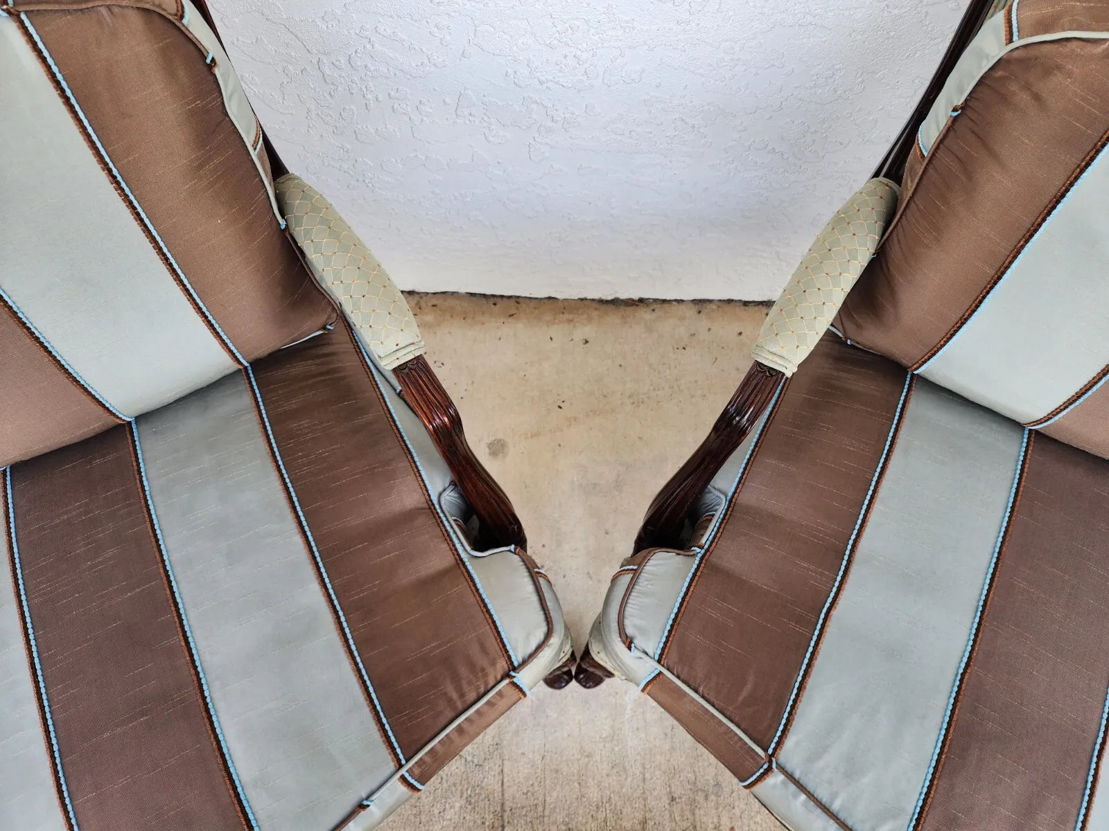 In good, structurally sound, and sturdy condition with no notable damage to the wood frames. Reversible cushions have some faint stains which are less noticeable in normal indoor lighting. We photographed them outdoors. The photos and video are an important part of the item description and condition so please use the zoom feature to view them closely.
