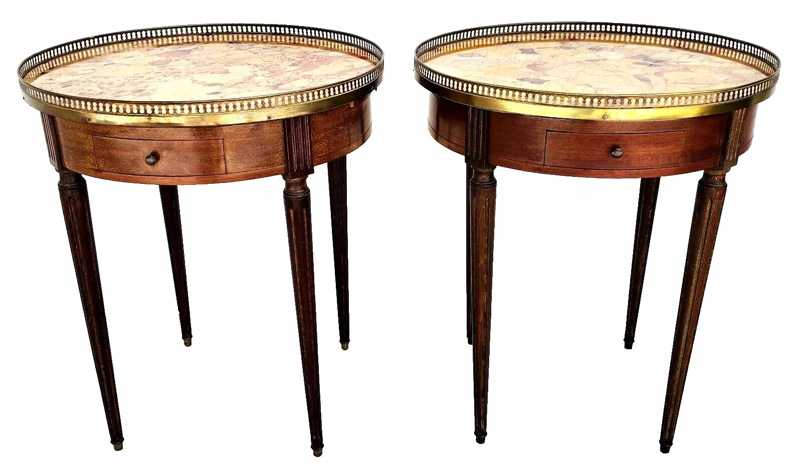 Bouillotte occasional table, having a round top of Breche d'Alep marble, surrounded by a pierced gallery of brass, on mahogany table base, with double frieze drawers, and leather-clad slides, raised on round, tapering, and fluted legs.
