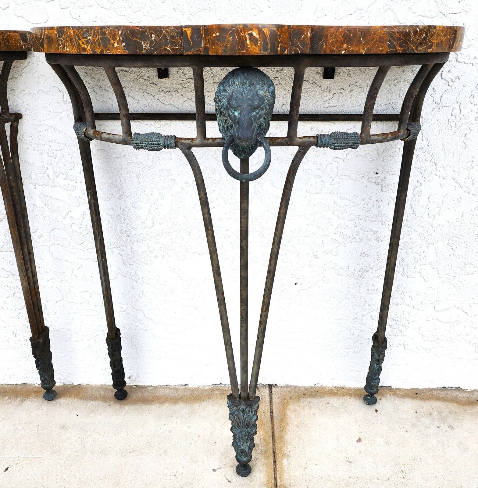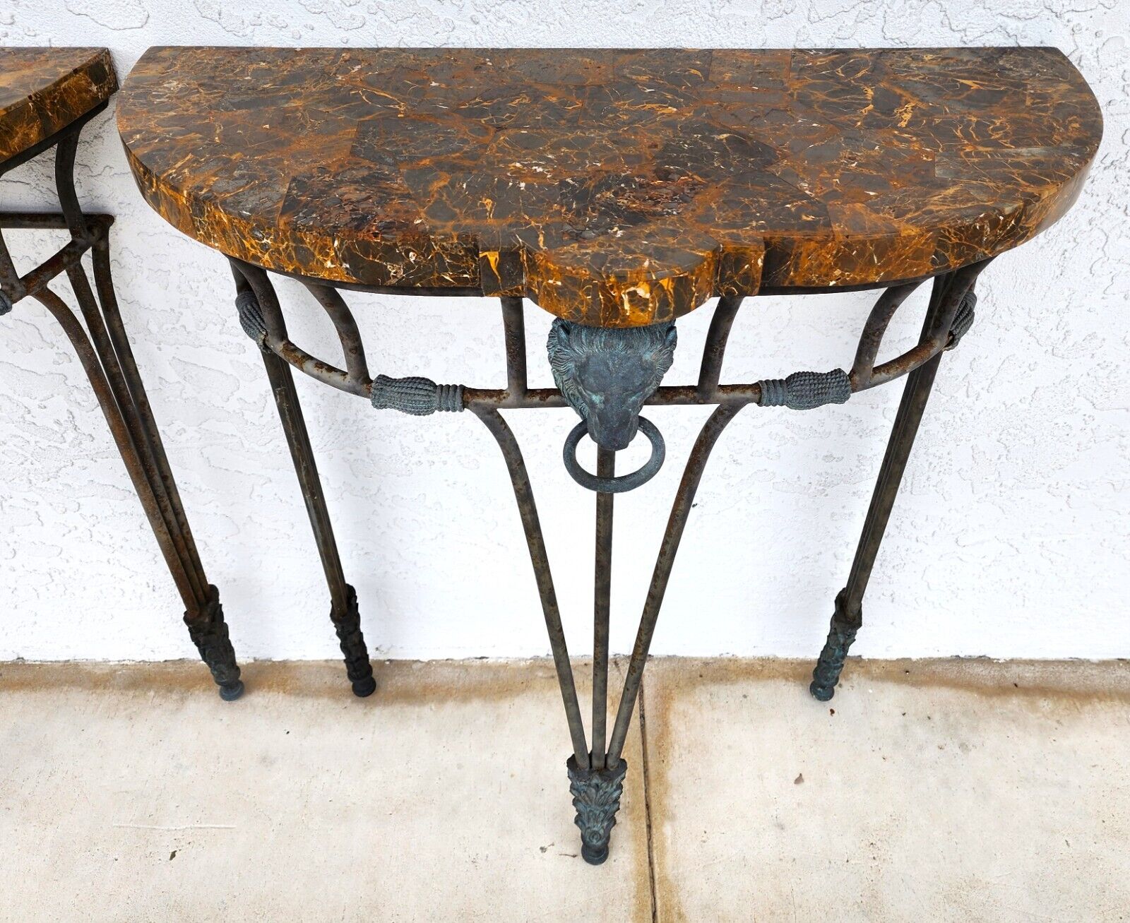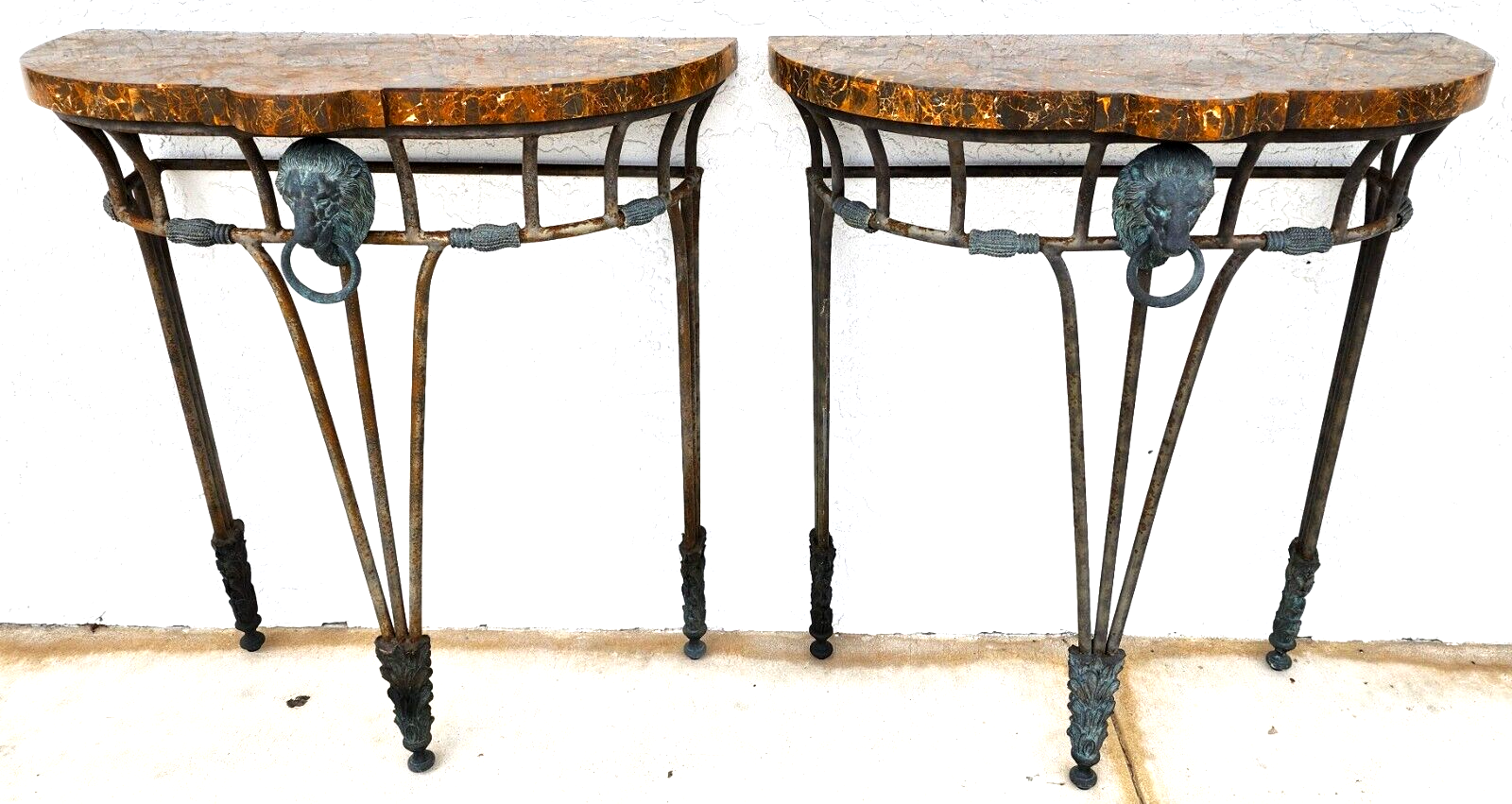 Both are in good, structurally sound condition. There is some oxidation on the iron portions and a few spots of very light wear on the marble top surfaces. The photos are an important part of the item description and condition so please use the zoom feature to view them closely.