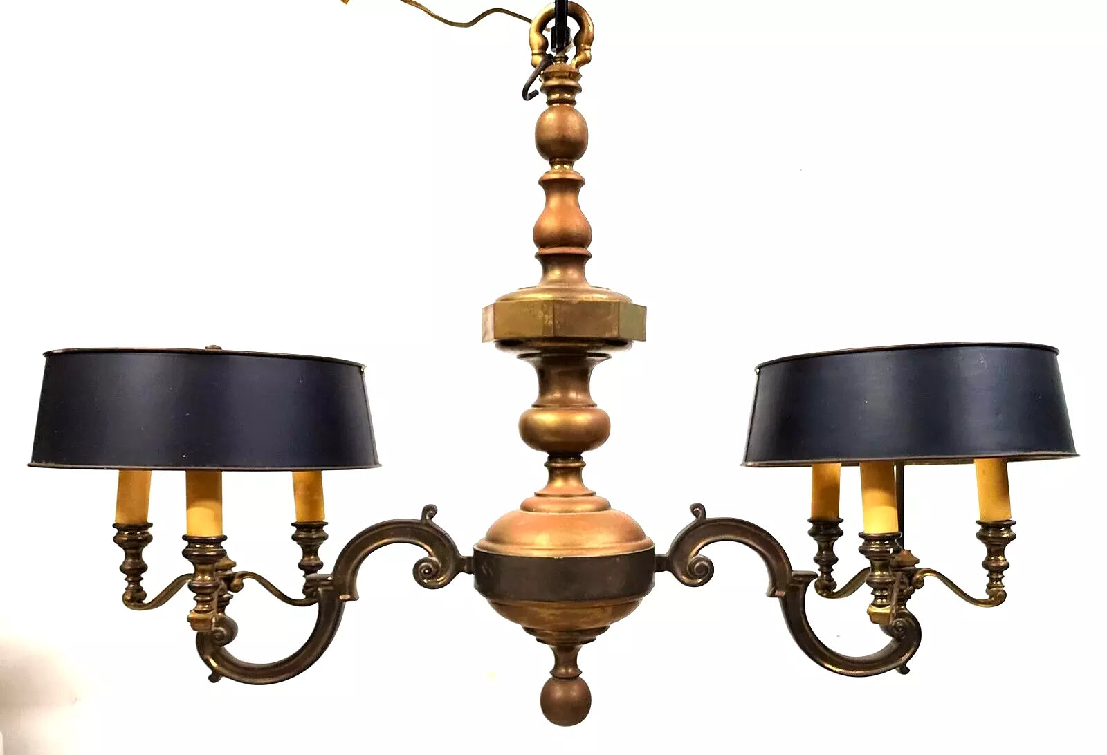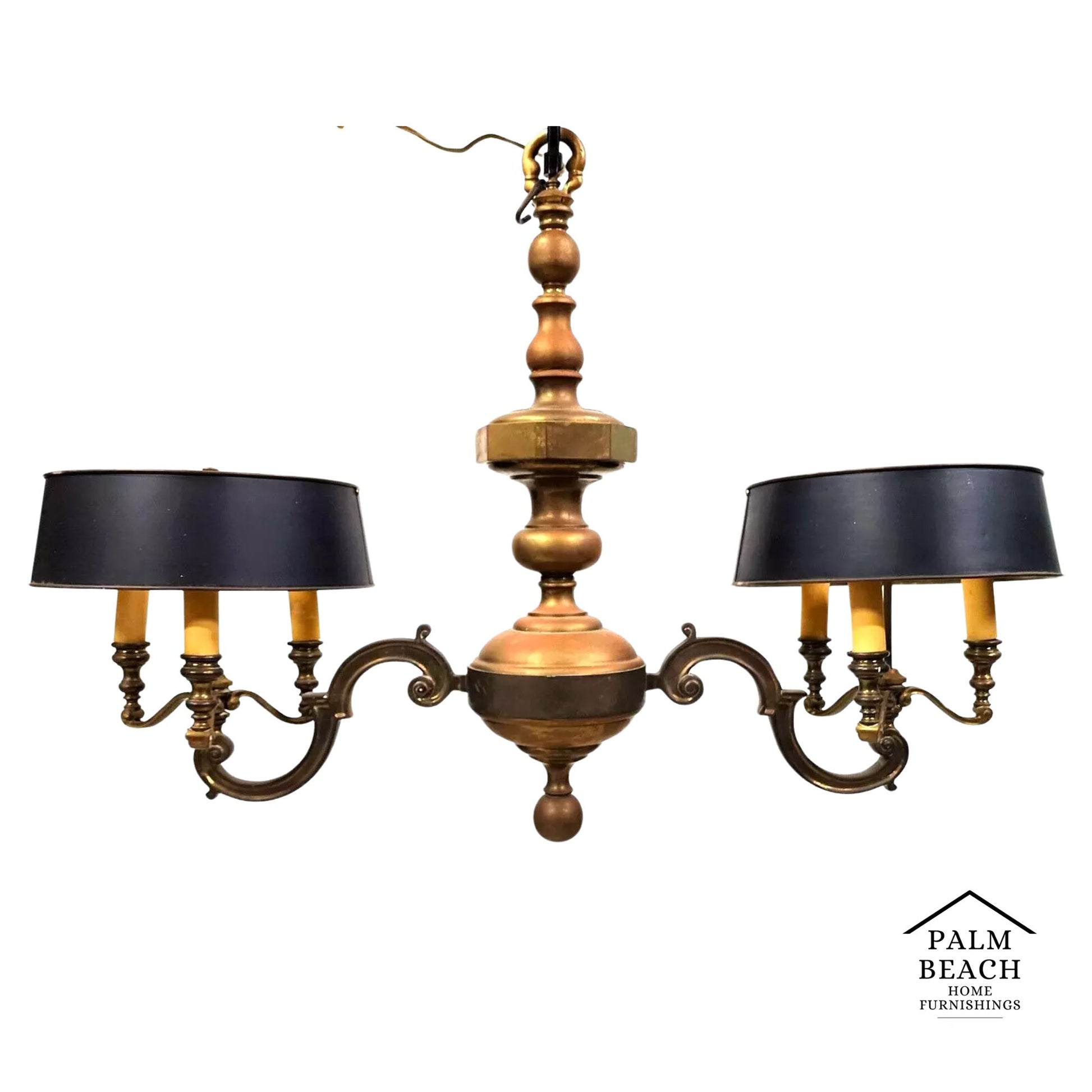 Antique French Double Bouillotte 6 Light Solid Brass Chandelier with Black Tole Metal Shades