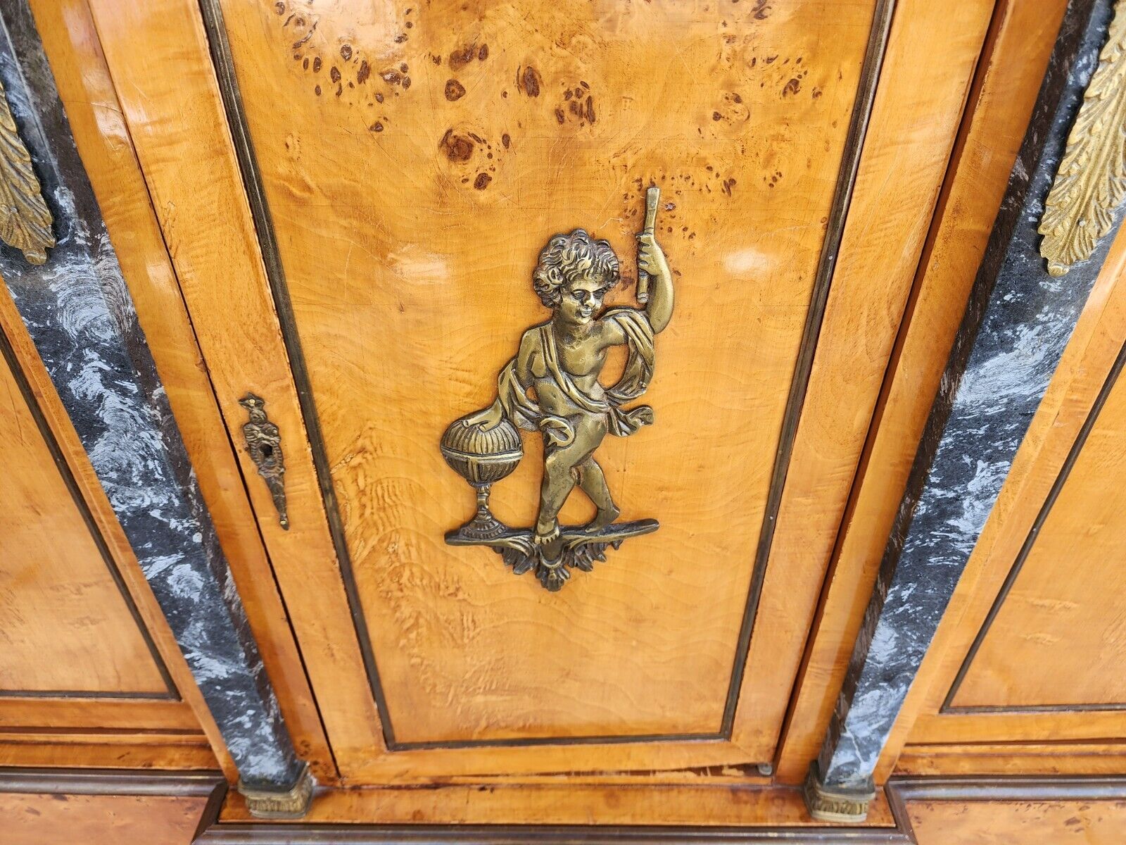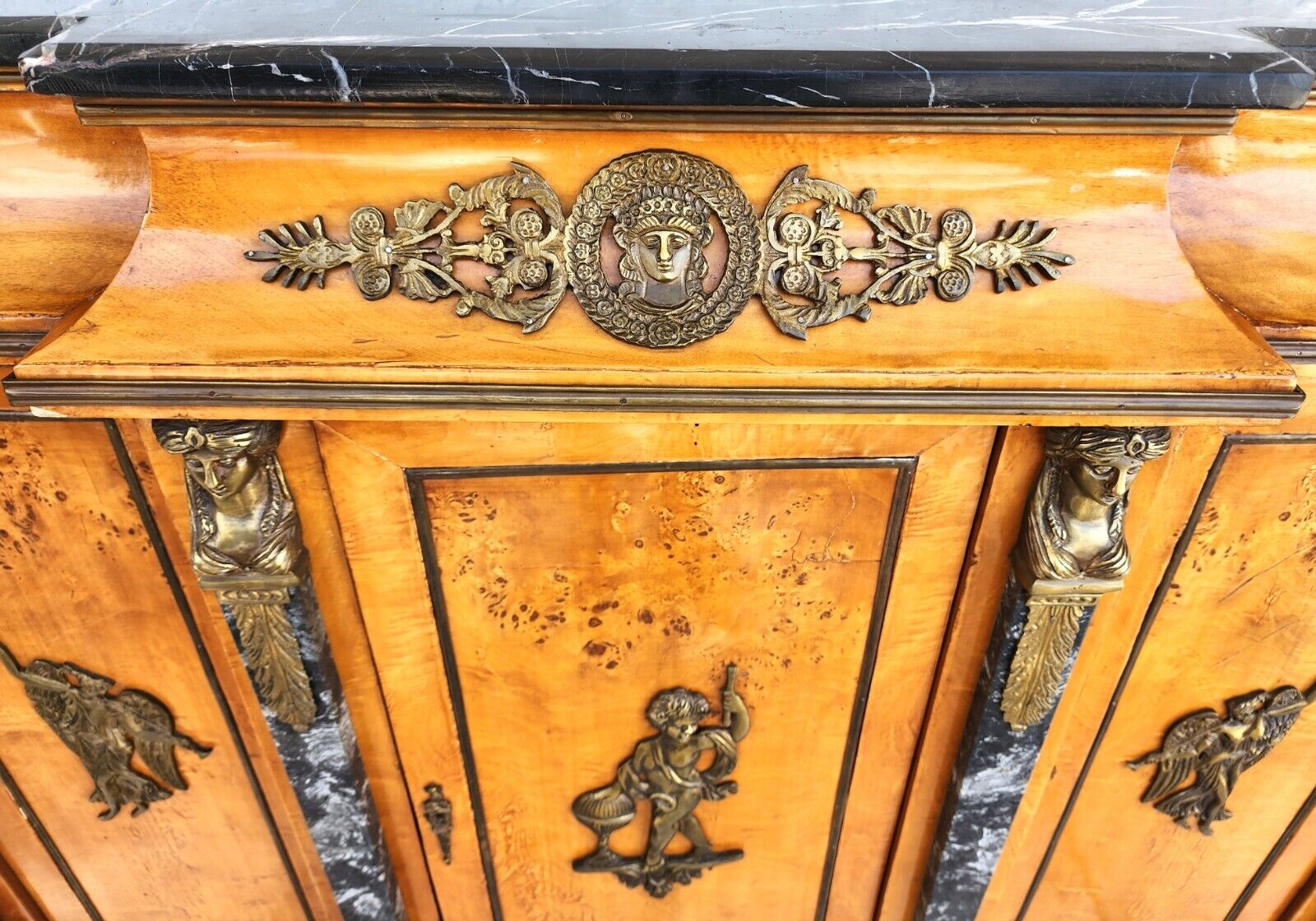 Adorned with Bronze Ormolu Mounts and Bronze paw feet, a Black Marble top and front pillars, and 3 front cabinet doors.