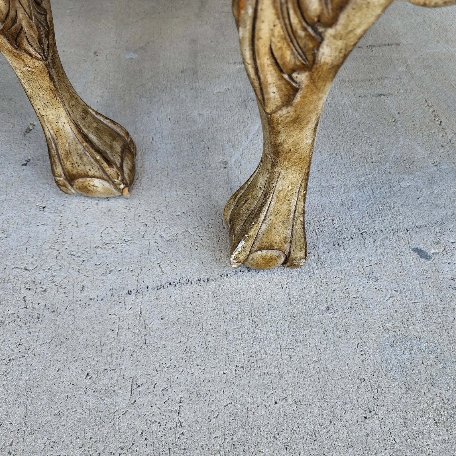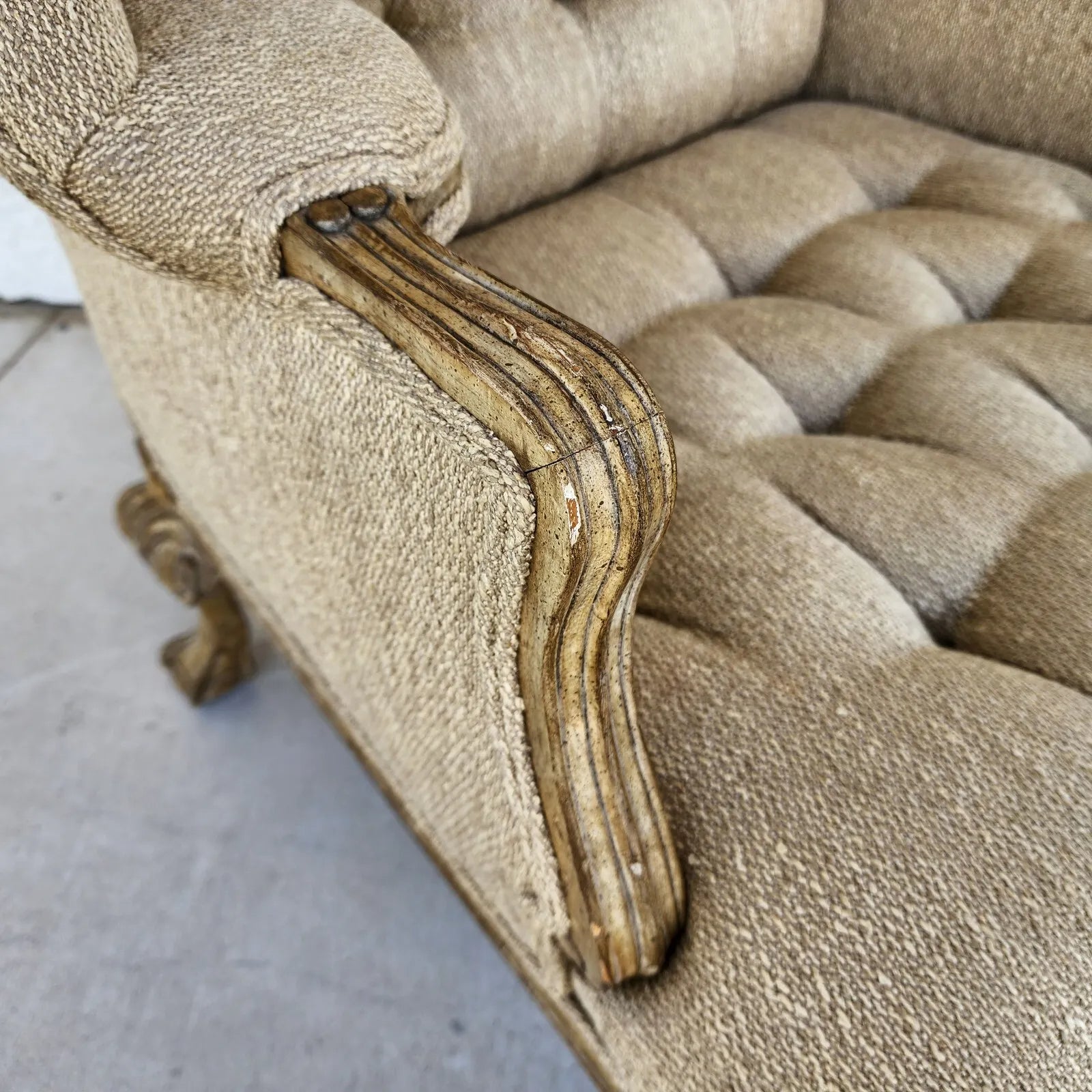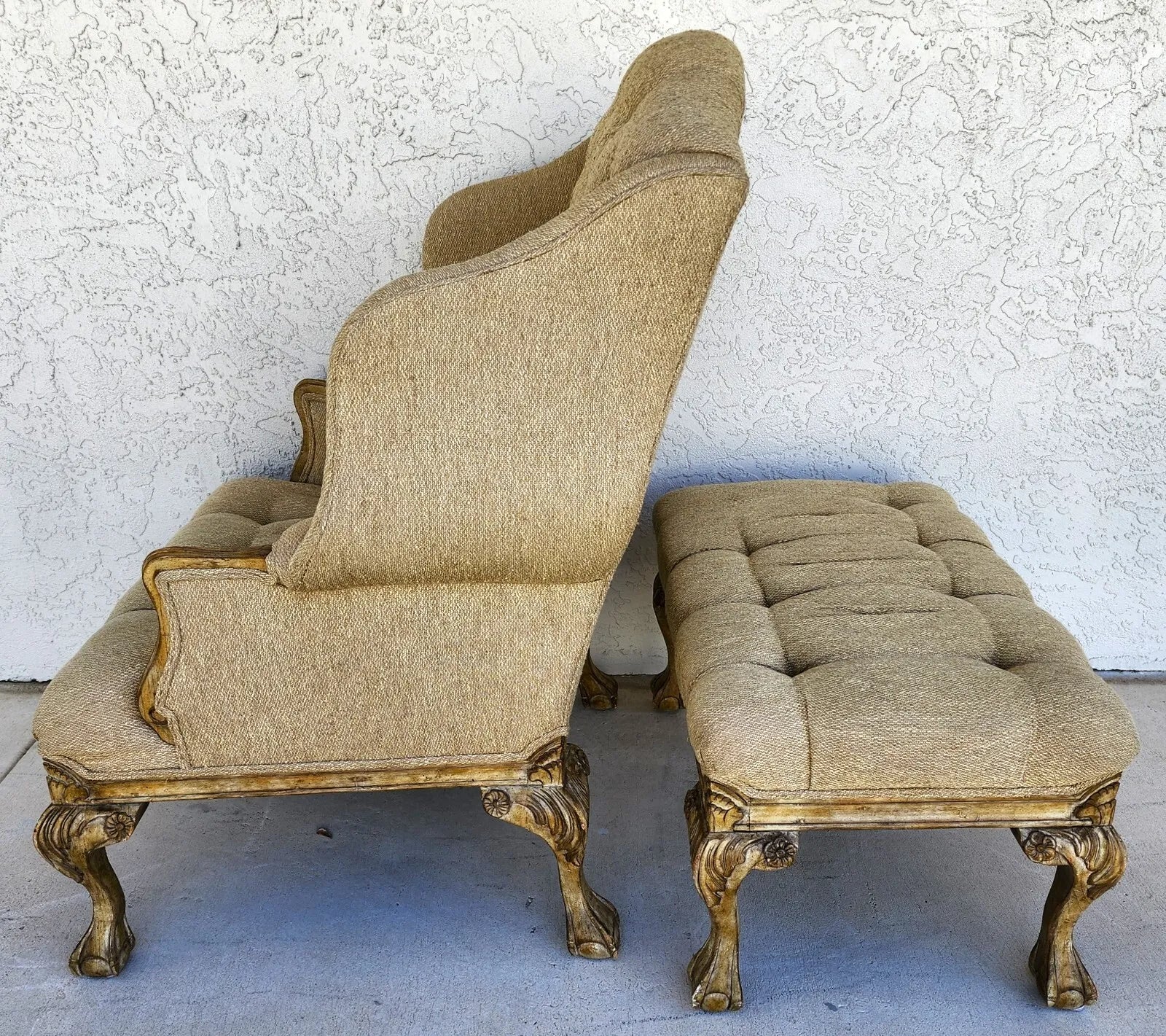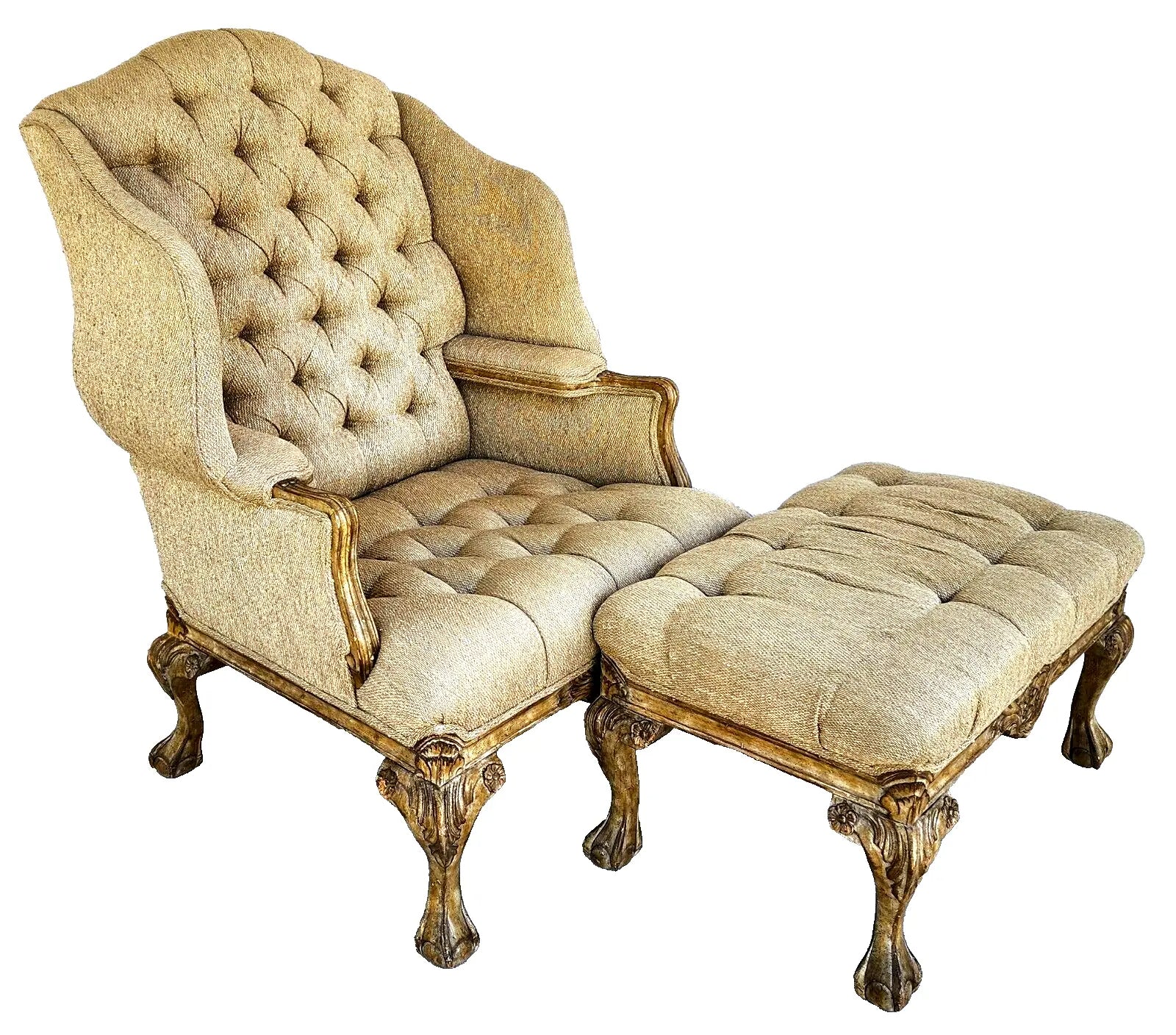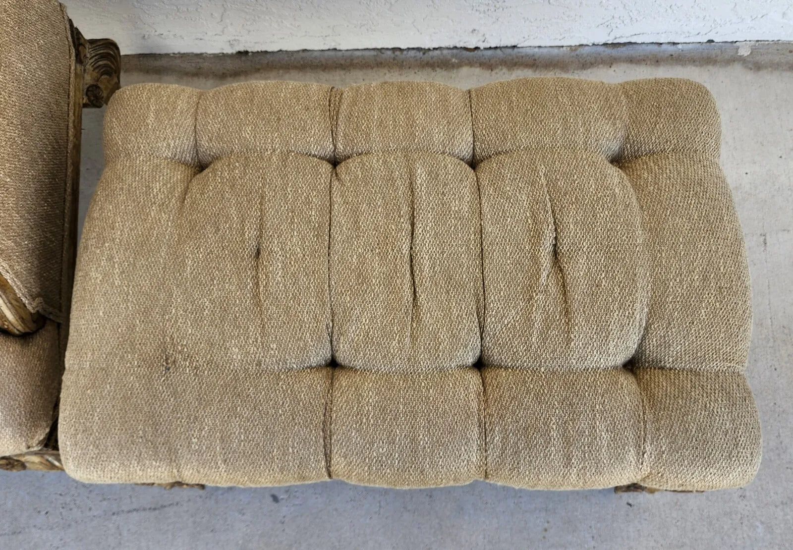 Chair is in good, structurally sound, and sturdy condition with no notable damage to fabric. There are some chips and dings on the wood frames the worst of which are shown in the photos and video. Some of the tufting buttons are missing from the ottoman. The photos and video are an important part of the item description and condition so please use the zoom feature to view them closely.