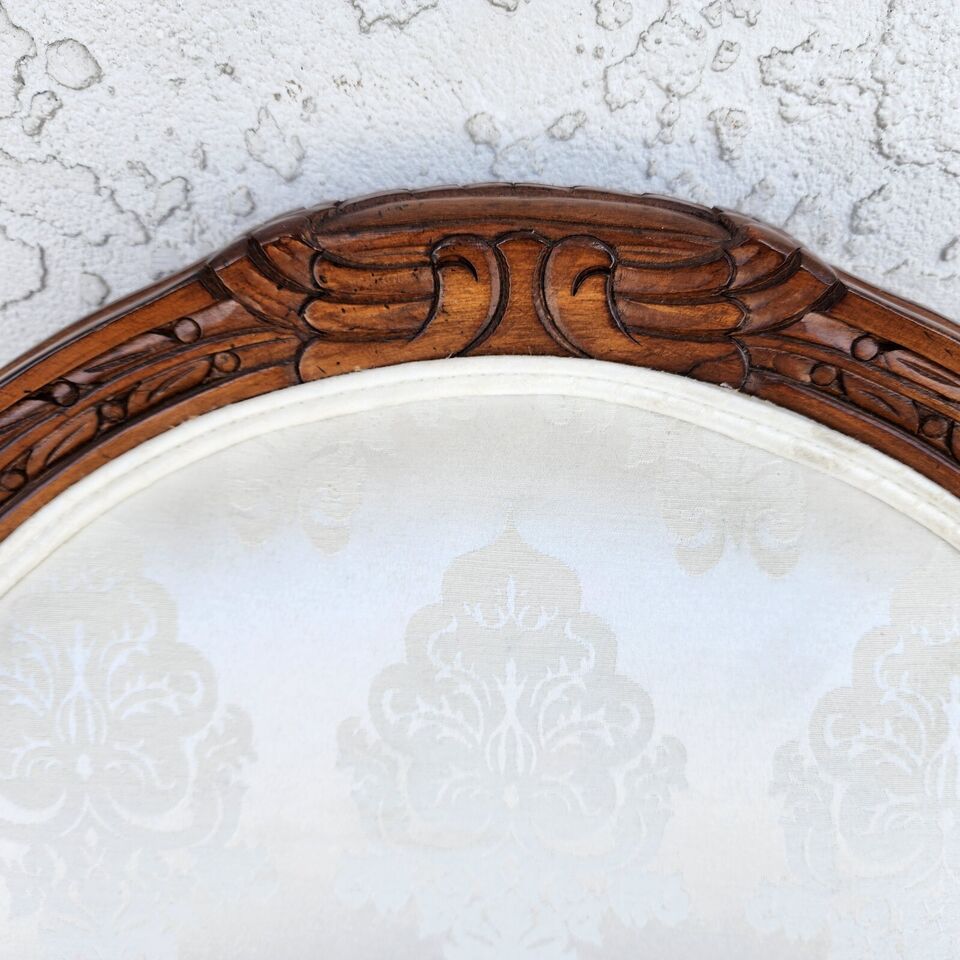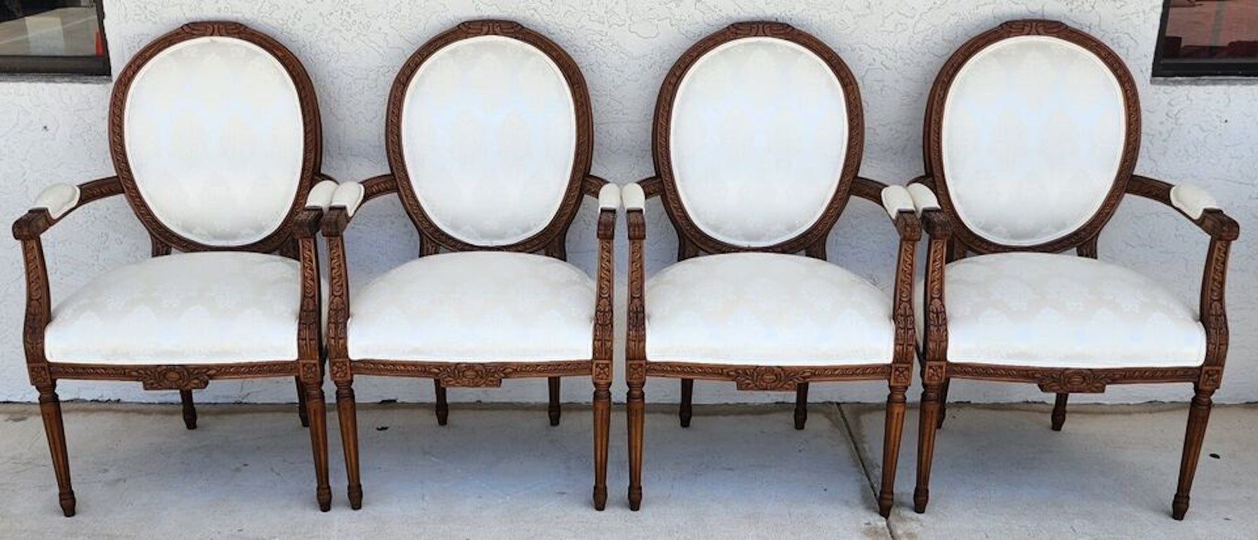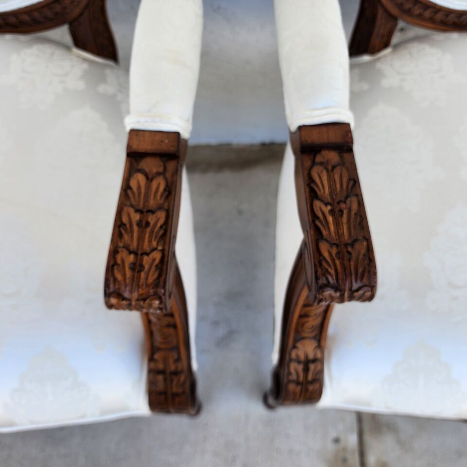In good, structurally sound, and sturdy condition with no notable damage to the carved Mahogany frames. There are 3 imperfections on the fabric. A faint pen line on 1 seat, a small mark on the back of 1 chair, and a small stain on the front top of the back of 1 chair (all as shown in the last 3 photos and video). The photos and video are an important part of the item description and condition so please use the zoom feature to view them closely.