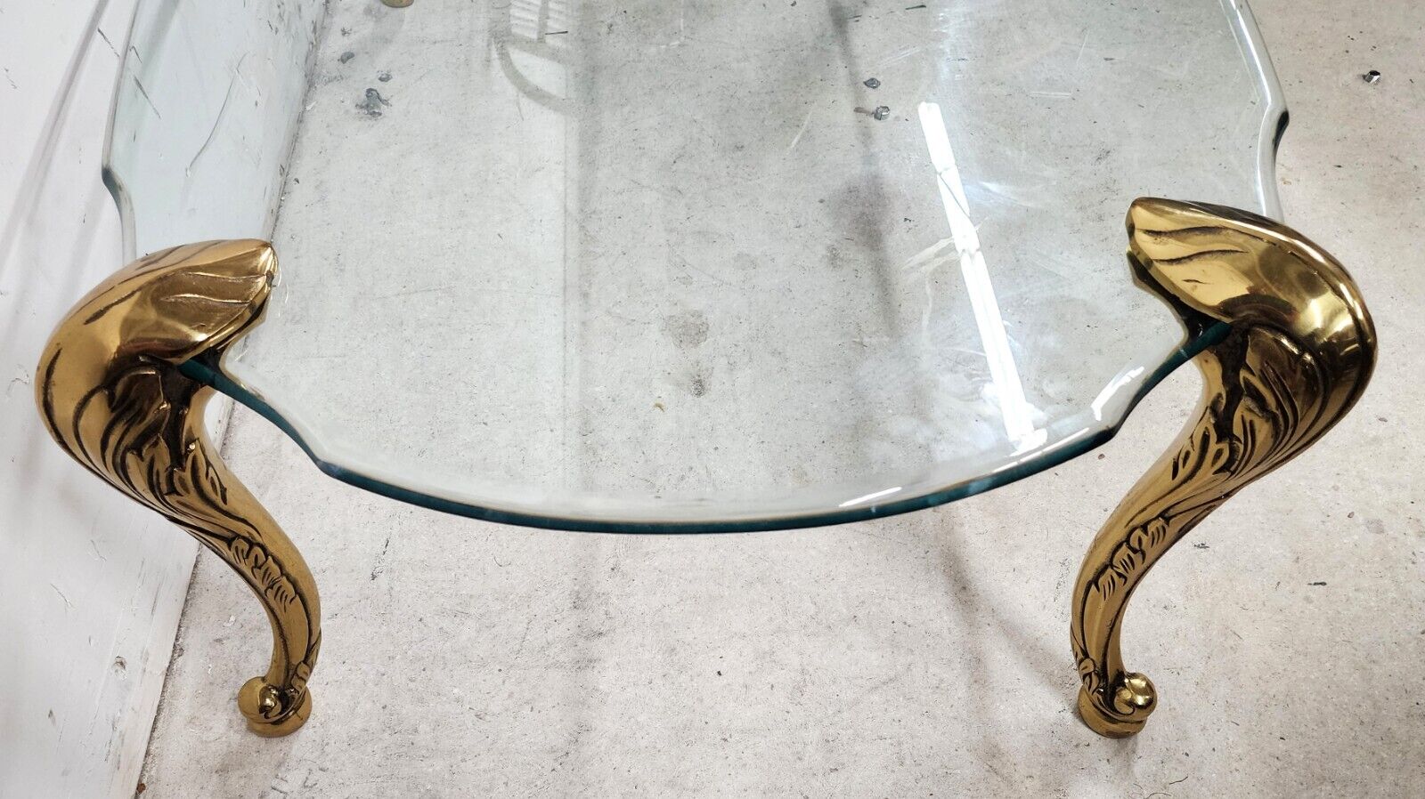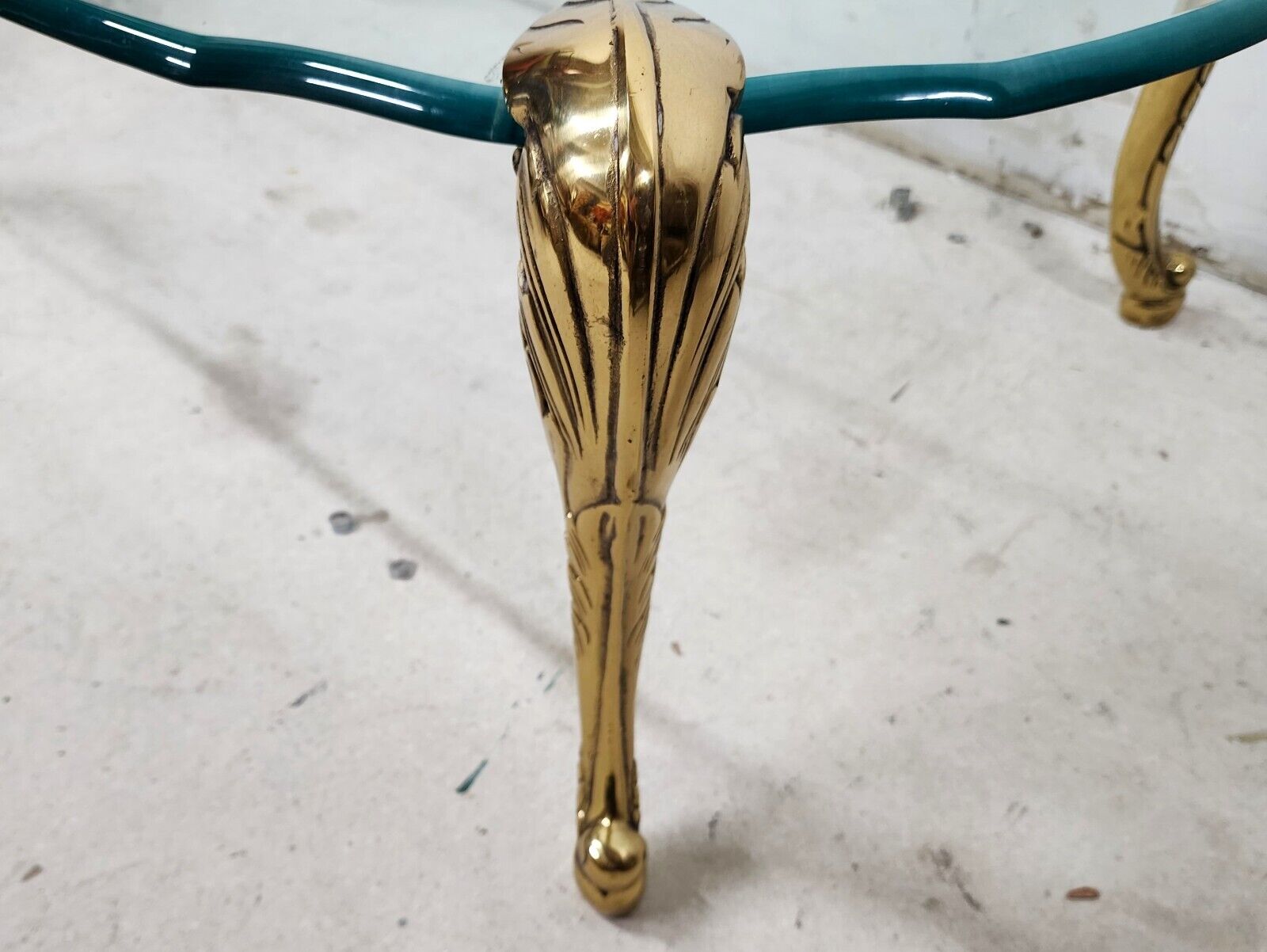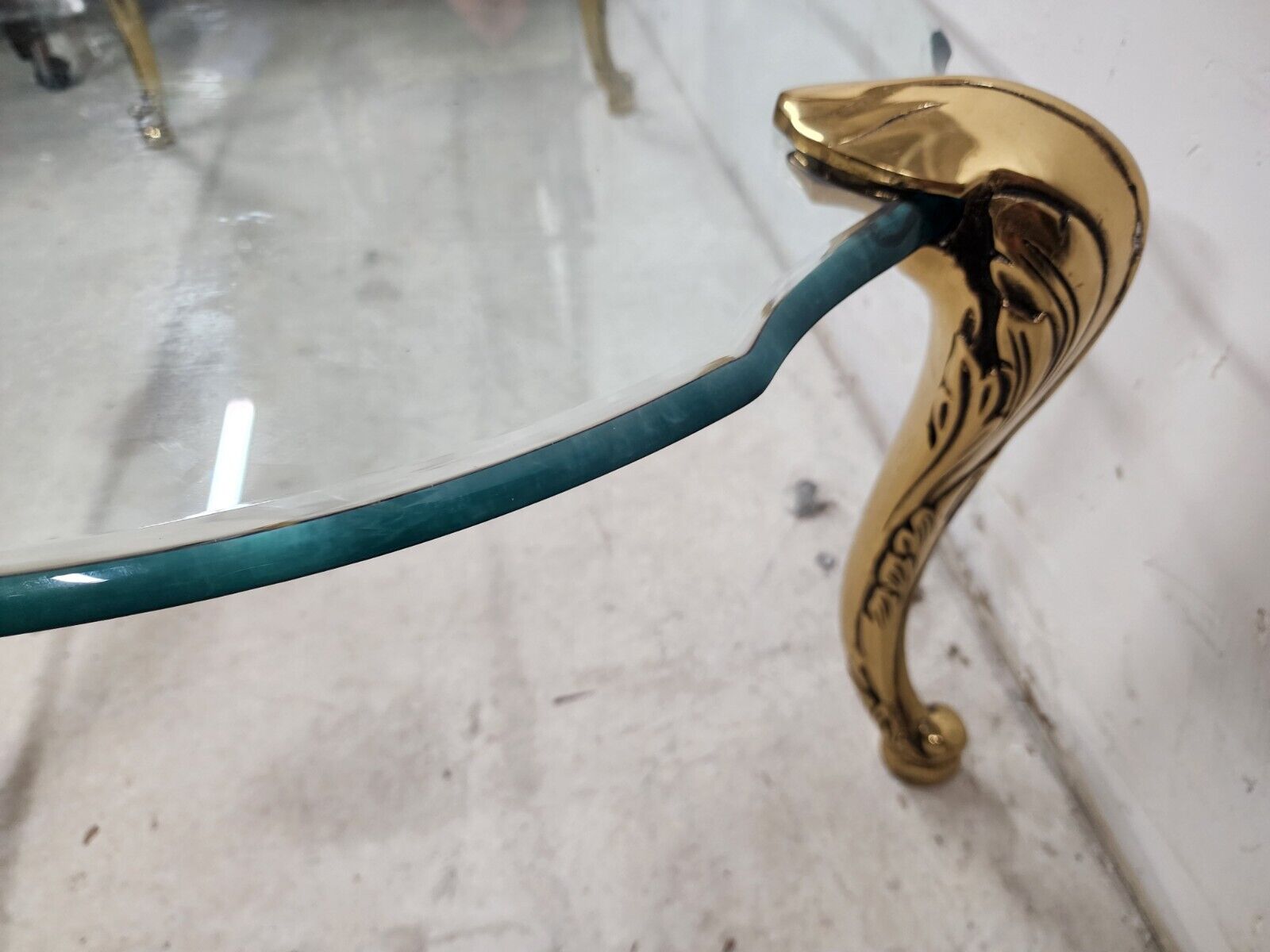 Featuring heavy brass legs with Acanthus leaf design ending in escargot feet and the original Ogee edge beveled glass top. Legs are removable and can be placed anywhere on the glass top.