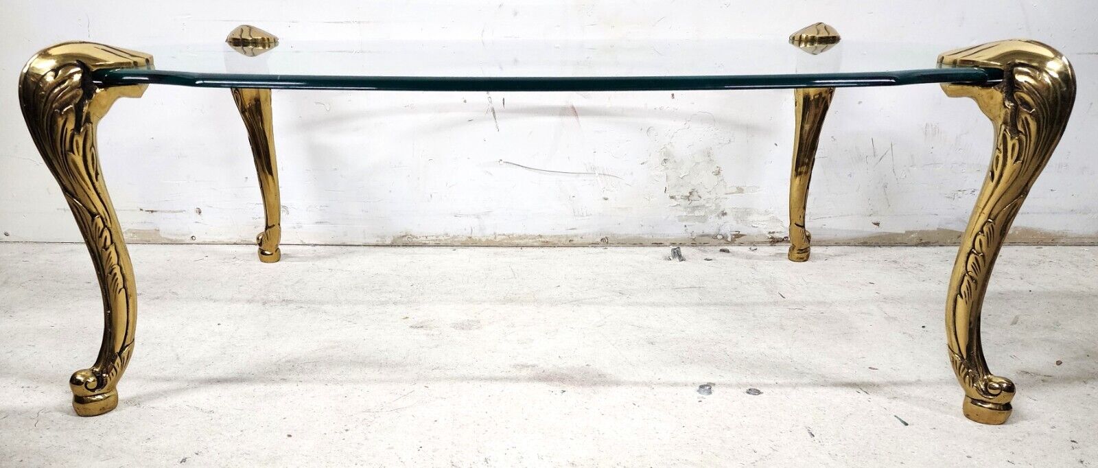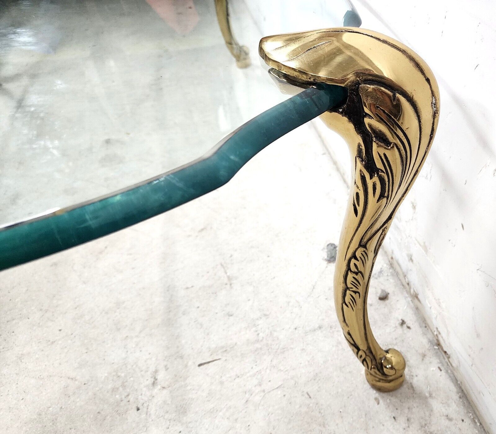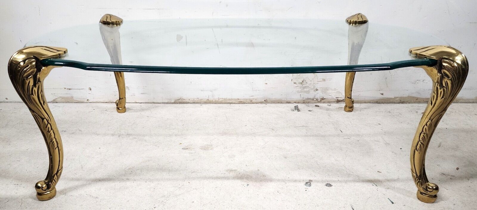 Featuring heavy brass legs with Acanthus leaf design ending in escargot feet and the original Ogee edge beveled glass top. Legs are removable and can be placed anywhere on the glass top.