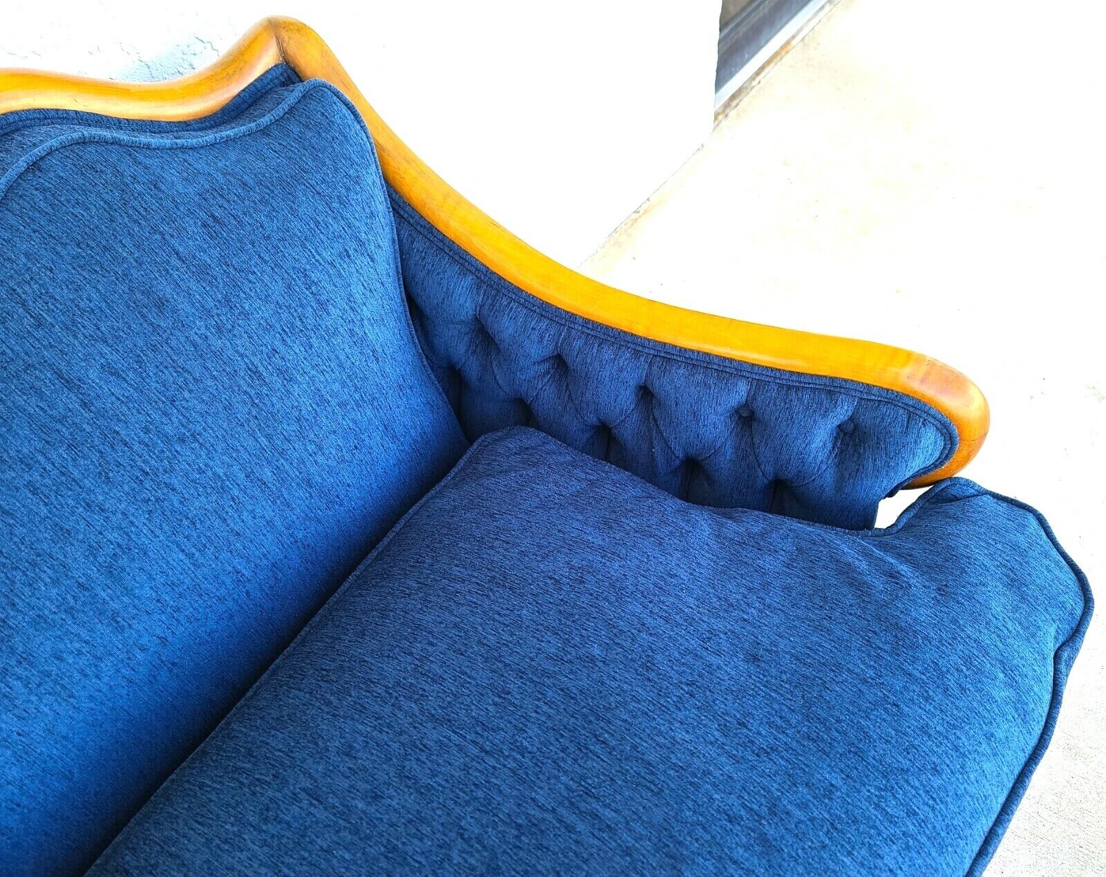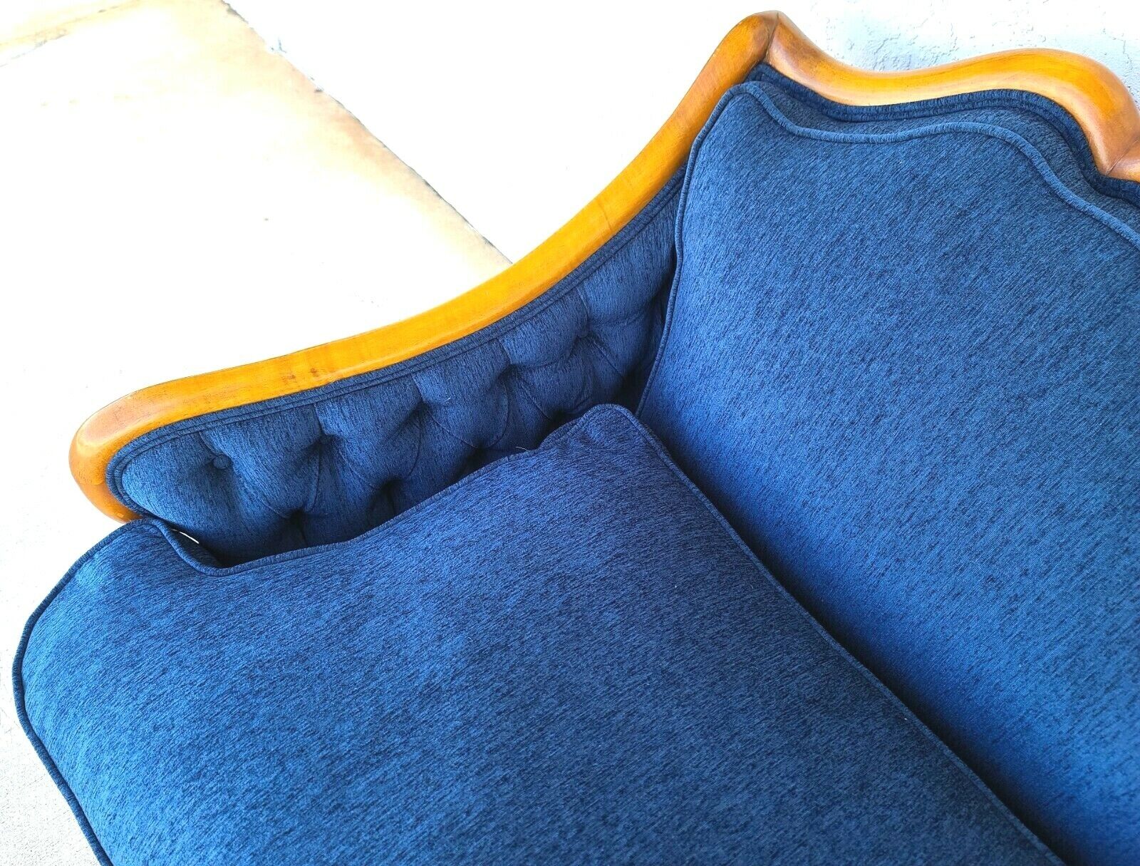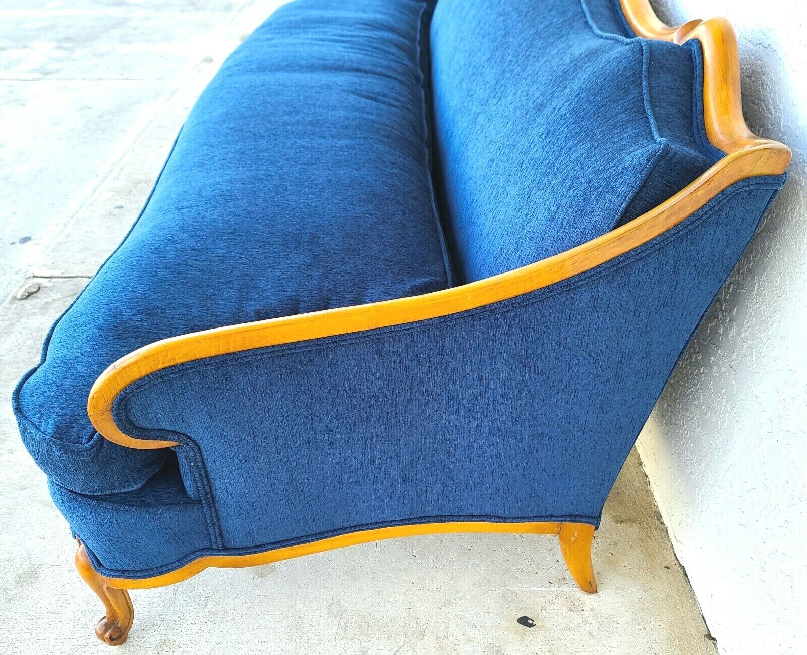In structurally sound and sturdy condition. It has been newly upholstered and the cotton fabric is spotless with no smells or other notable damage. Solid carved wood has some light wear near the bottoms of some legs.