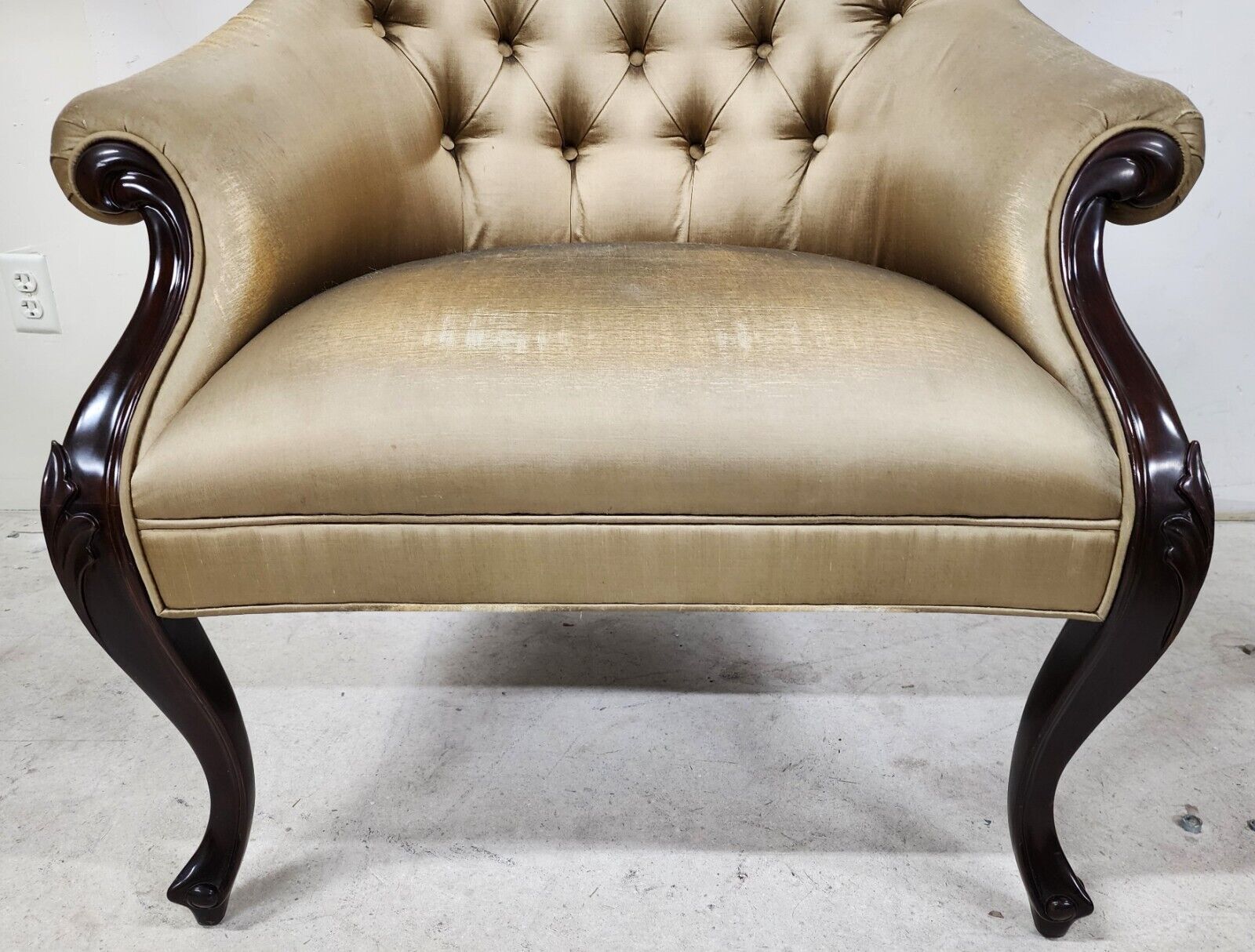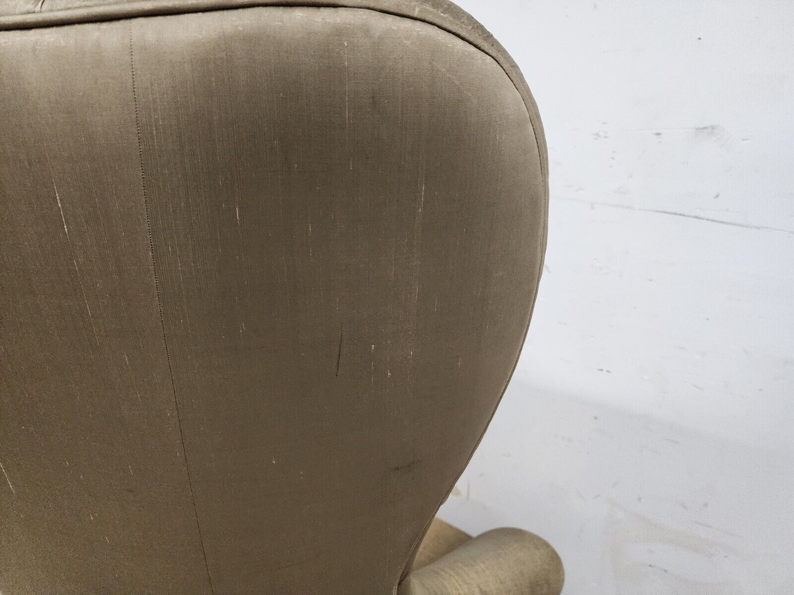 In structurally sound and sturdy condition. Fabric has a lot of wear on the front of chair and needs to be reupholstered. The photos are an important part of the item description and condition so please use the zoom feature to view them closely.