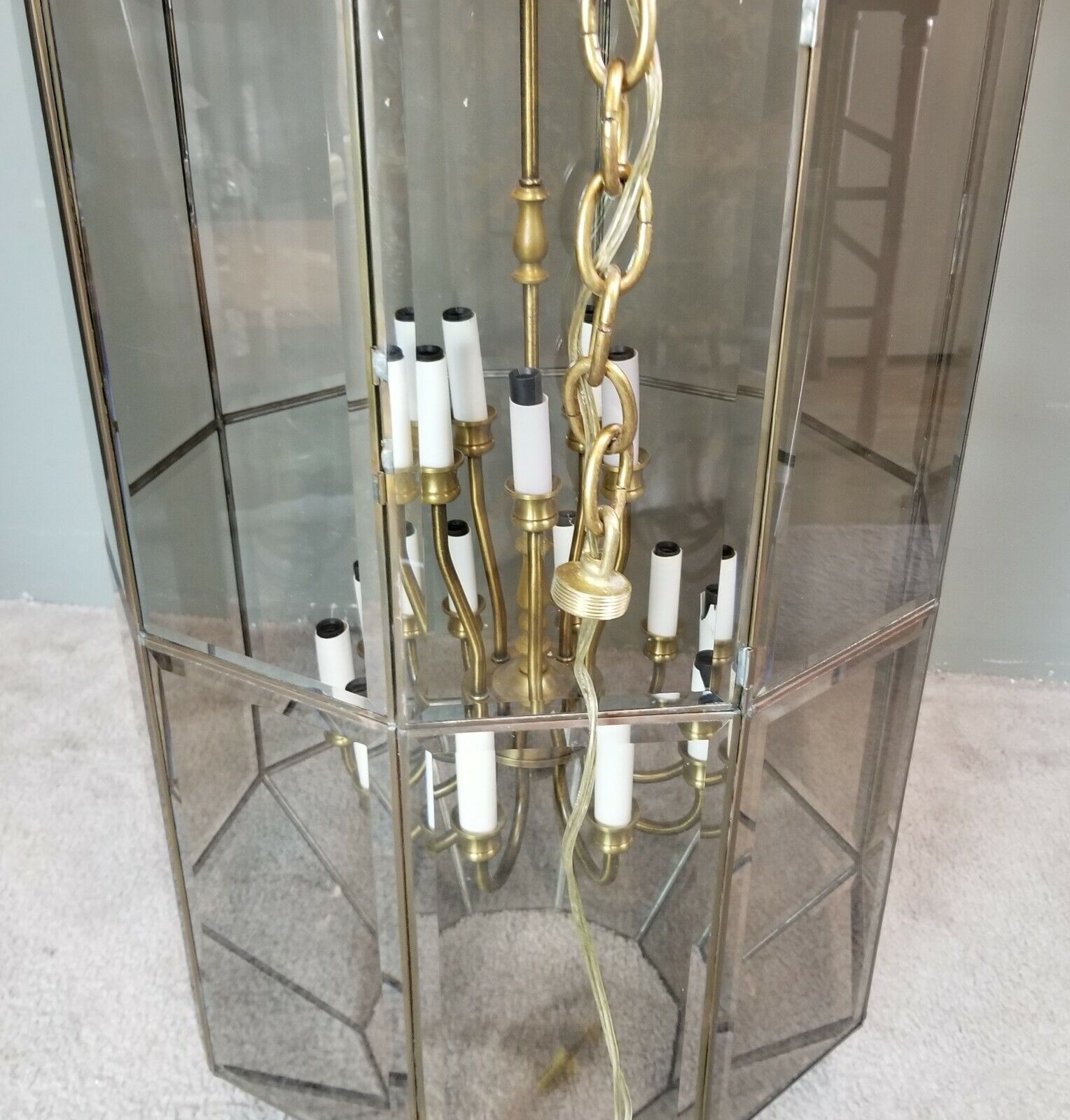 Huge 46" Beveled Leaded Clear Glass & Brass Light Pendant Chandelier 8 Sided
