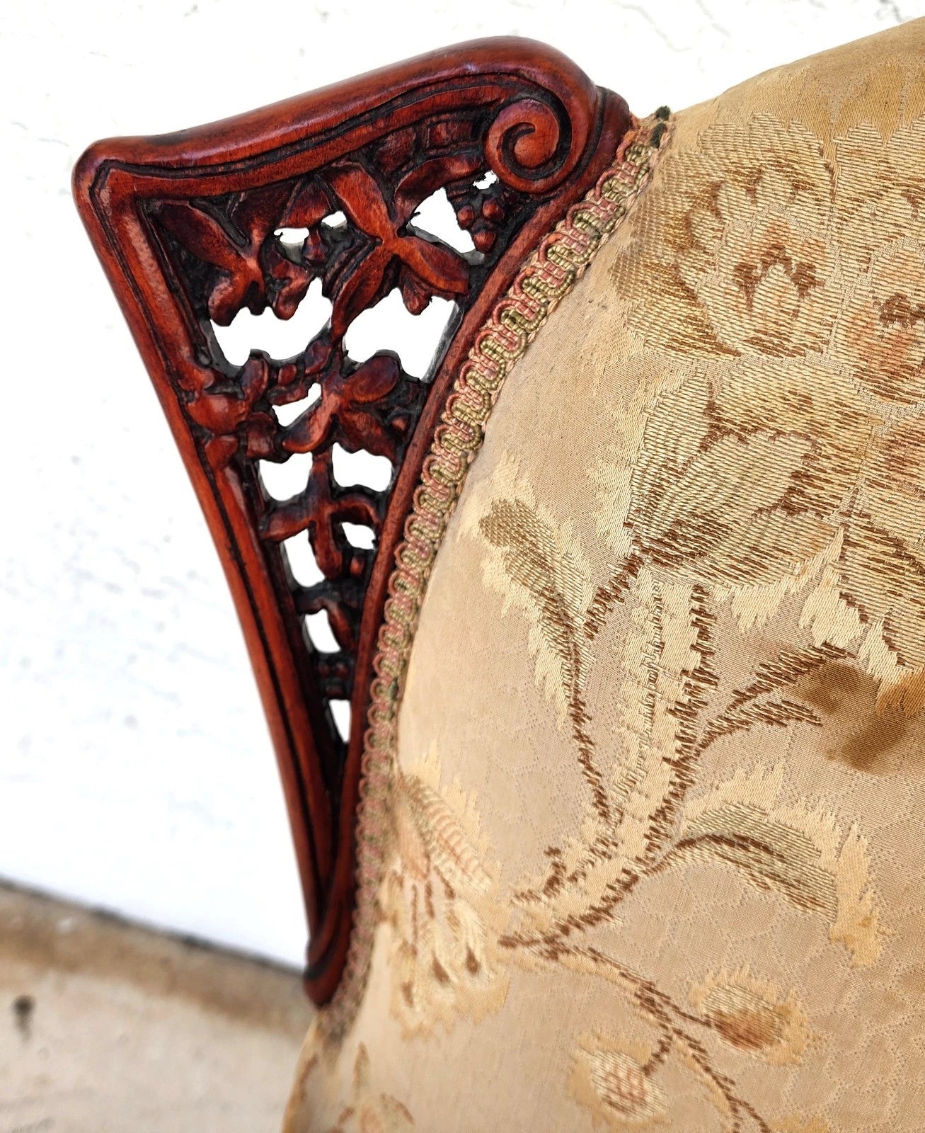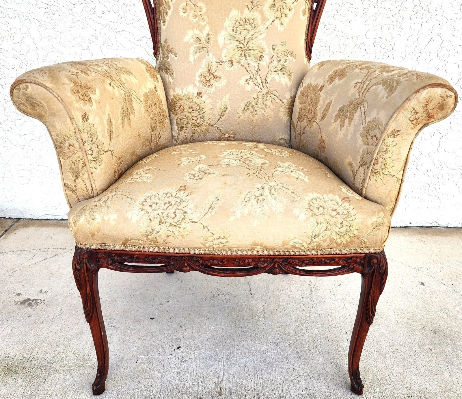 In good, structurally sound and sturdy condition. Fabric needs to be replaced. 1 front leg has a professional repair. The photos and video are an important part of the item description and condition so please use the zoom feature to view them closely.
