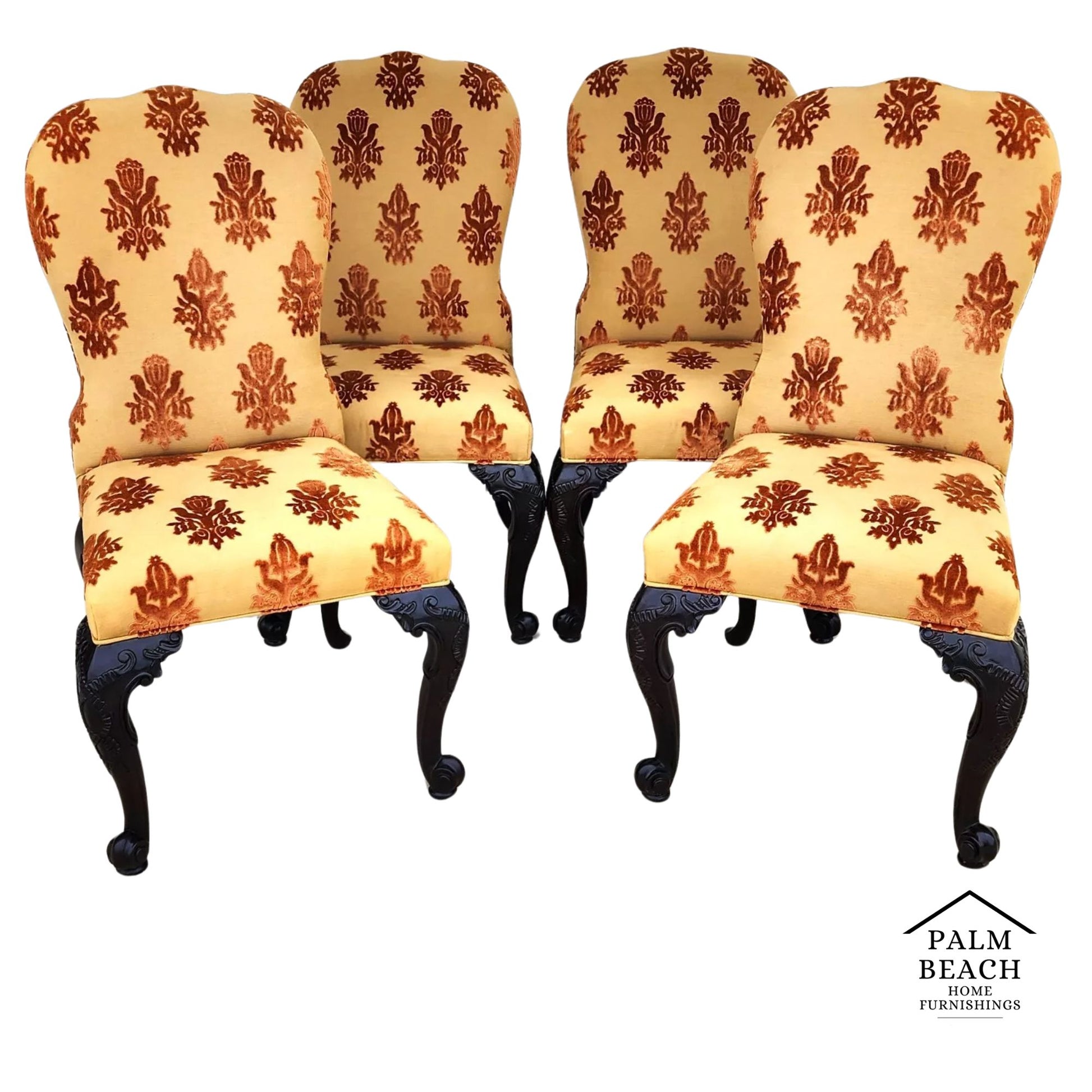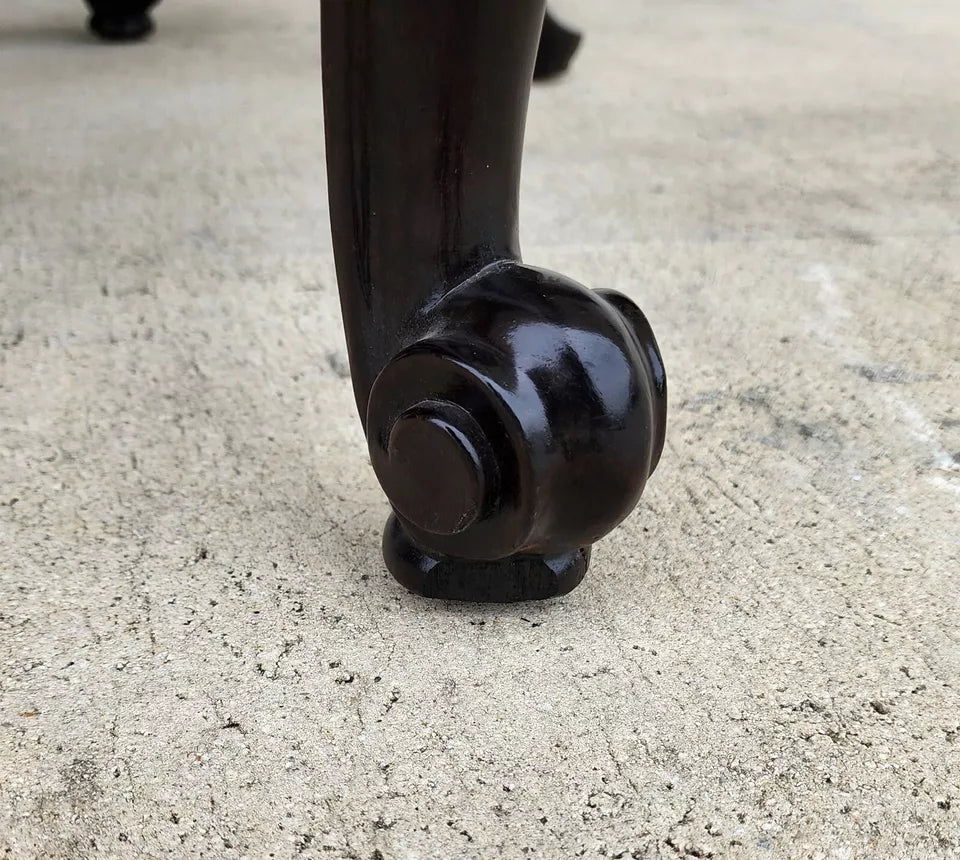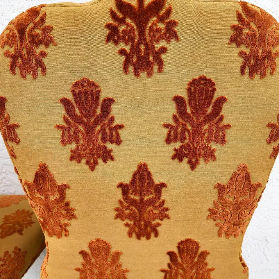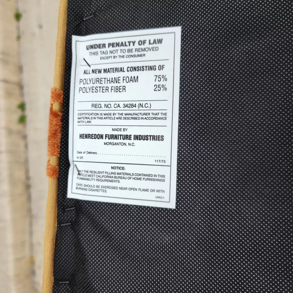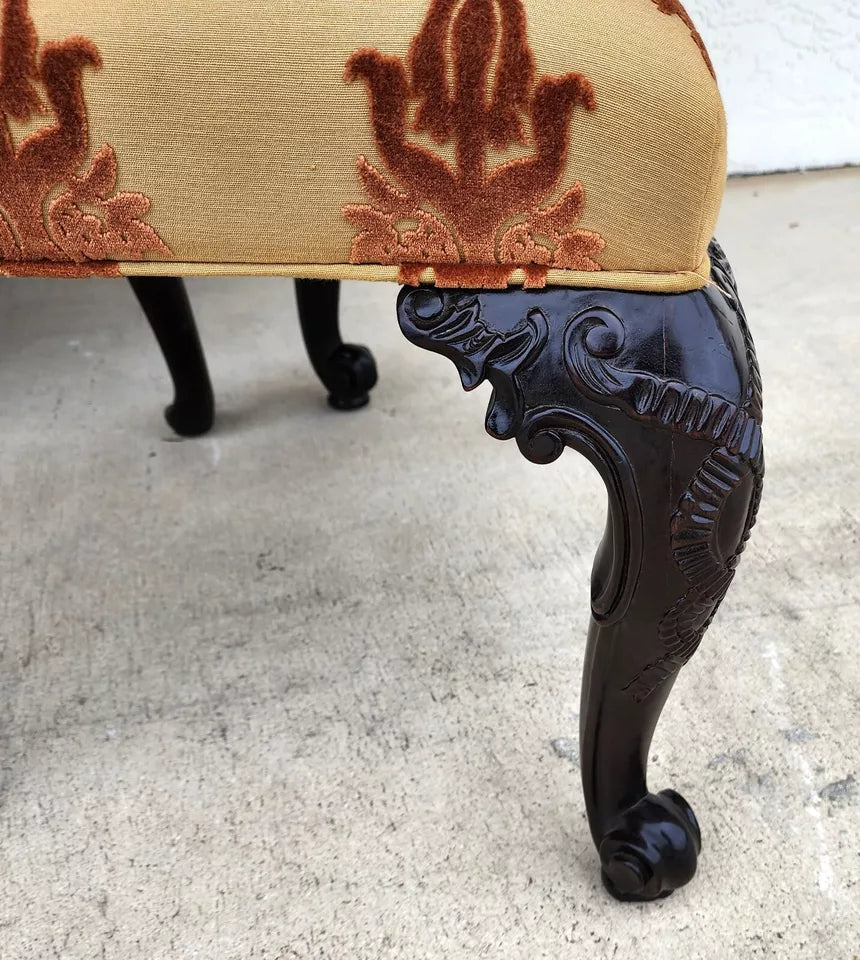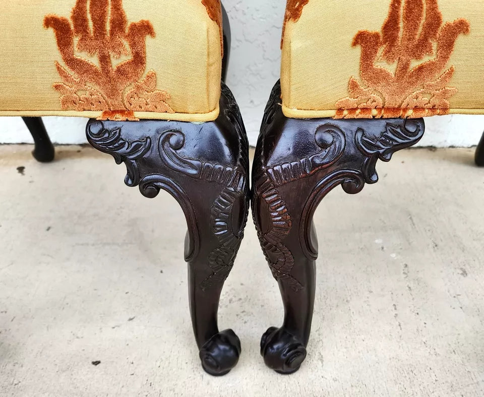 In good, structurally sound, and sturdy condition with no notable stains or other damage to fabric. Wood frames are also in great condition except the bottom of one foot has a small chip (which does not effect its stability) on it as shown in the last photo. The photos and video are an important part of the item description and condition so please use the zoom feature to view them closely.