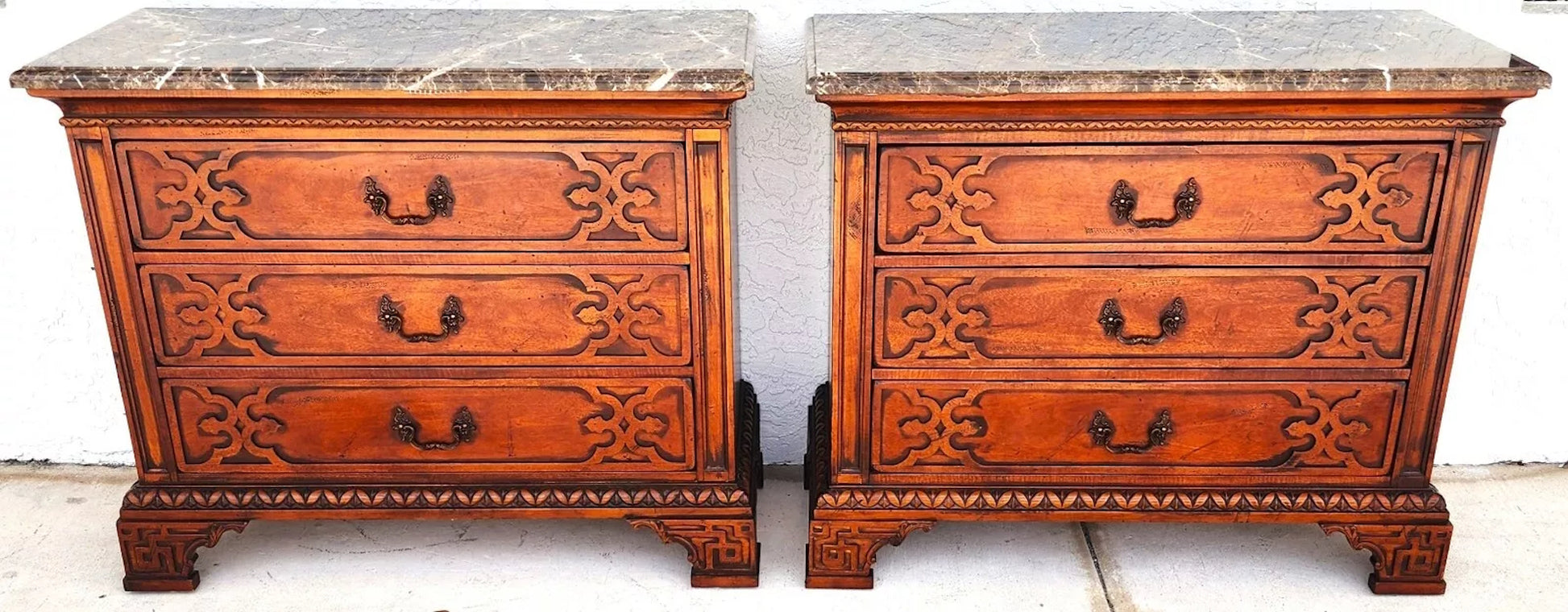 In good, structurally sound and sturdy condition with no notable damage to wood of marble tops. The photos are an important part of the item description and condition so please use the zoom feature to view them closely.