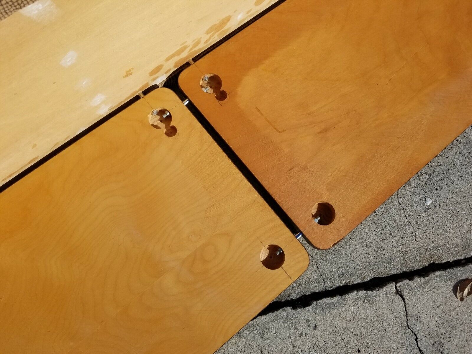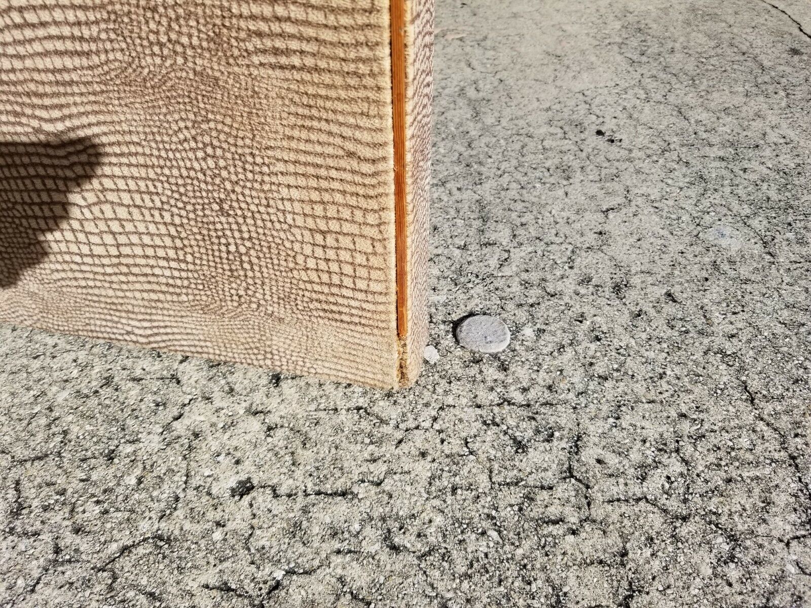 Structurally sound and sturdy. Faux Alligator skin fabric is soiled in spots and may respond well to cleaning (which we have not tried). A small piece of wood trim is missing on the bottom of leg as shown.