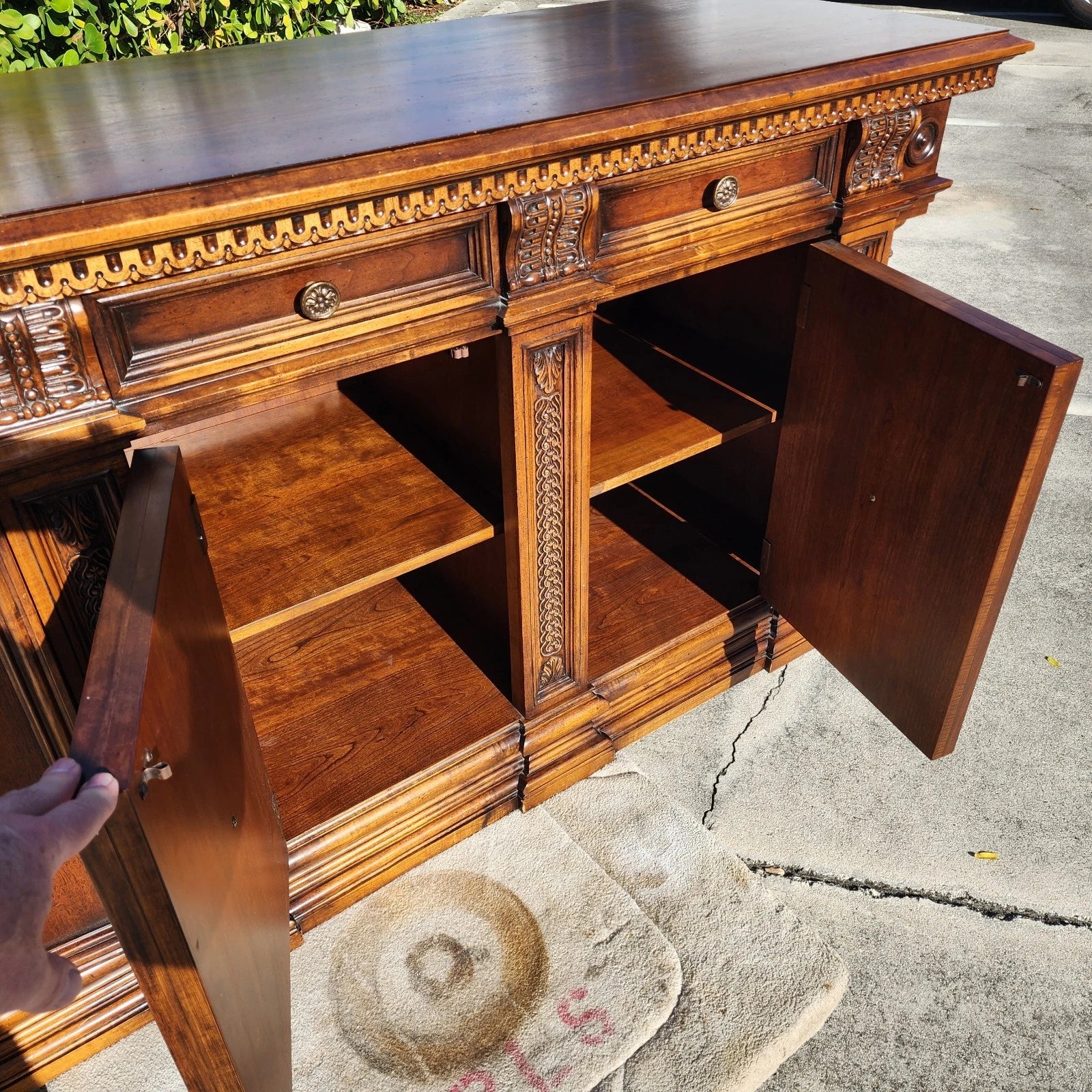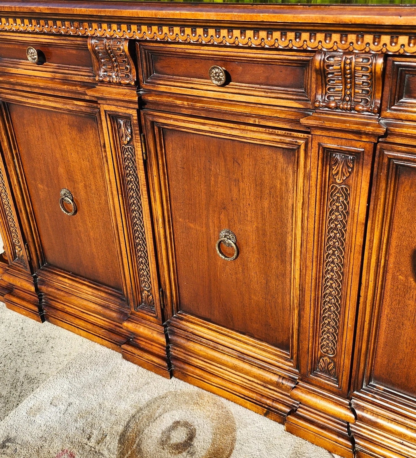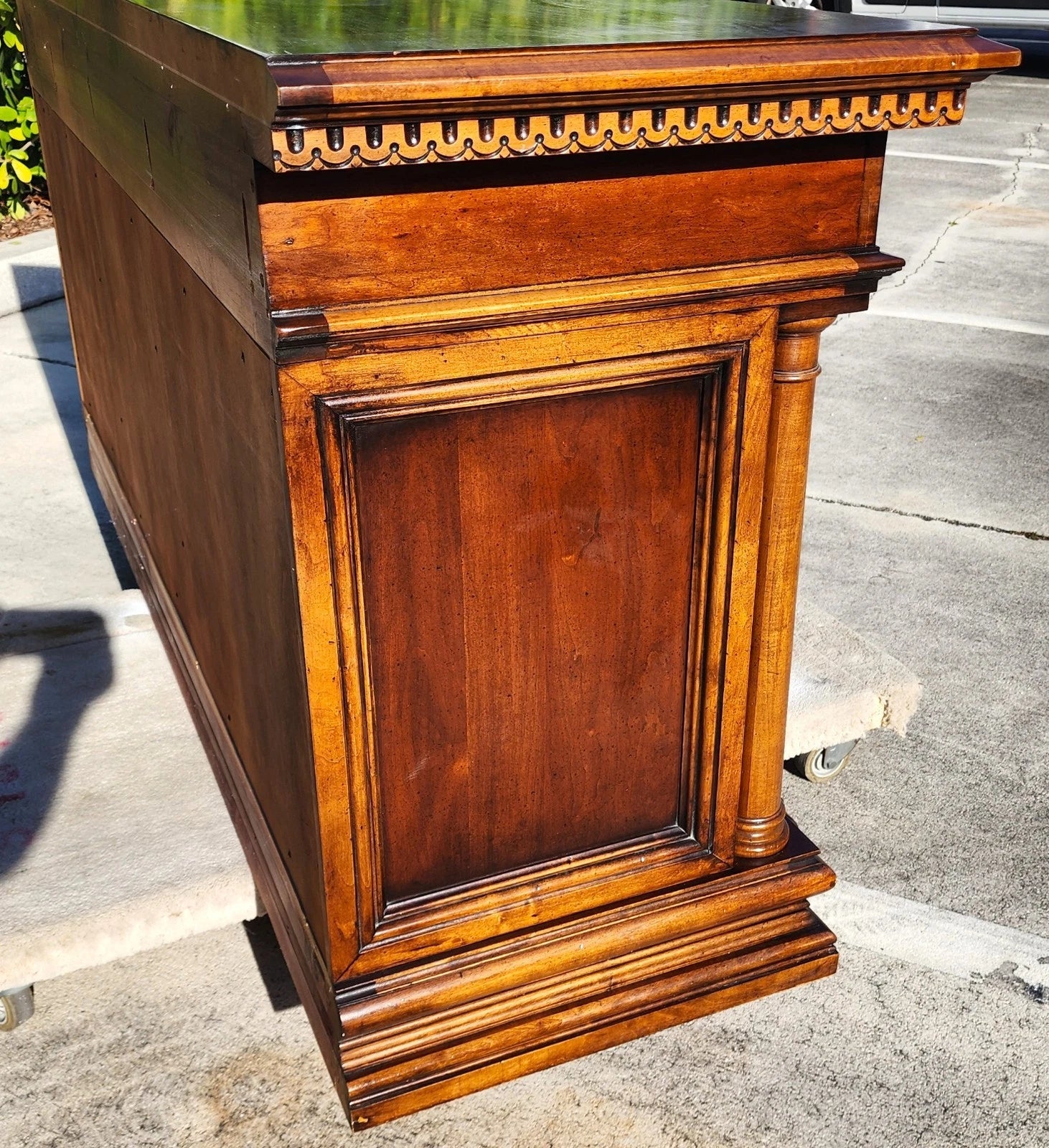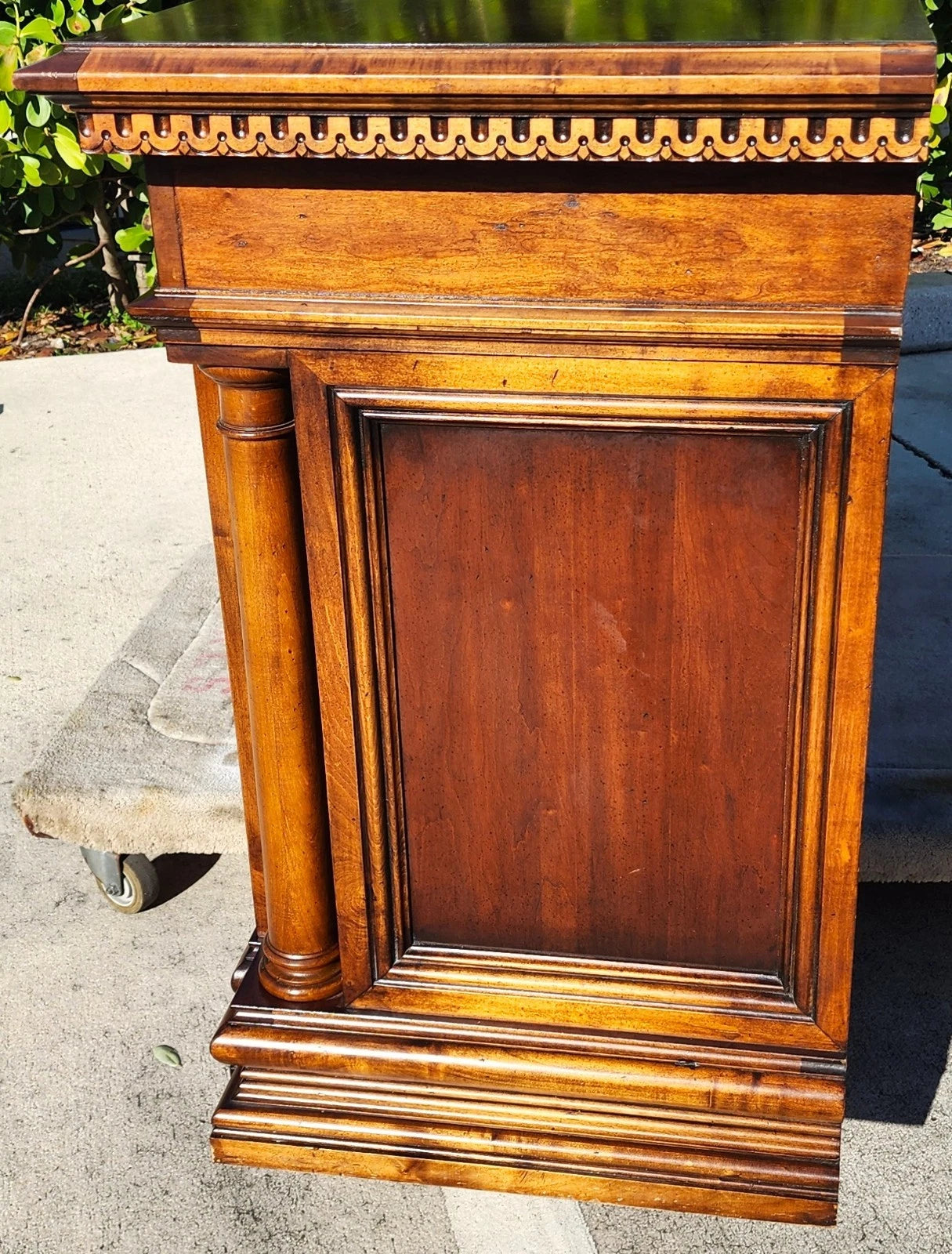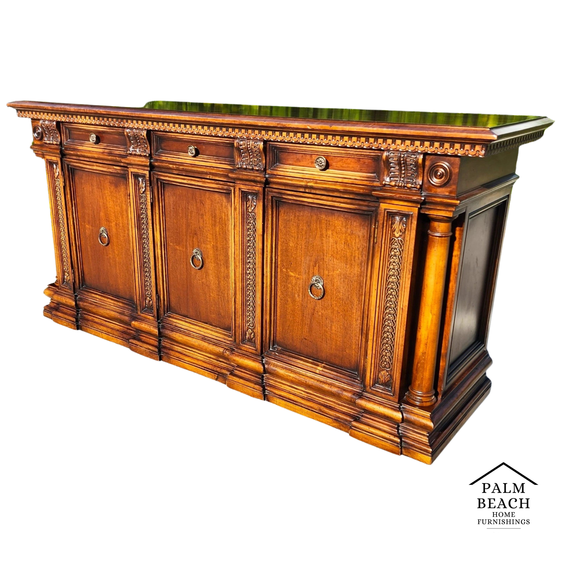 Italian Baroque revival style featuring rich, warm-toned wood, intricate detailing on the top molding and flanked by side columns.