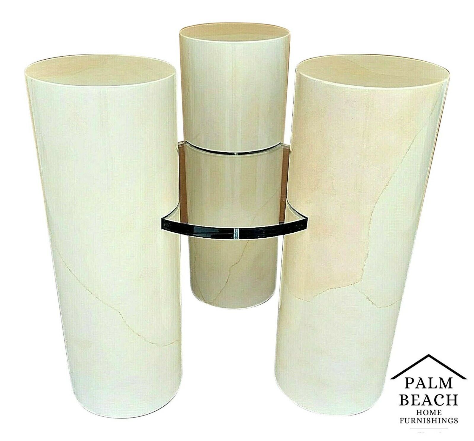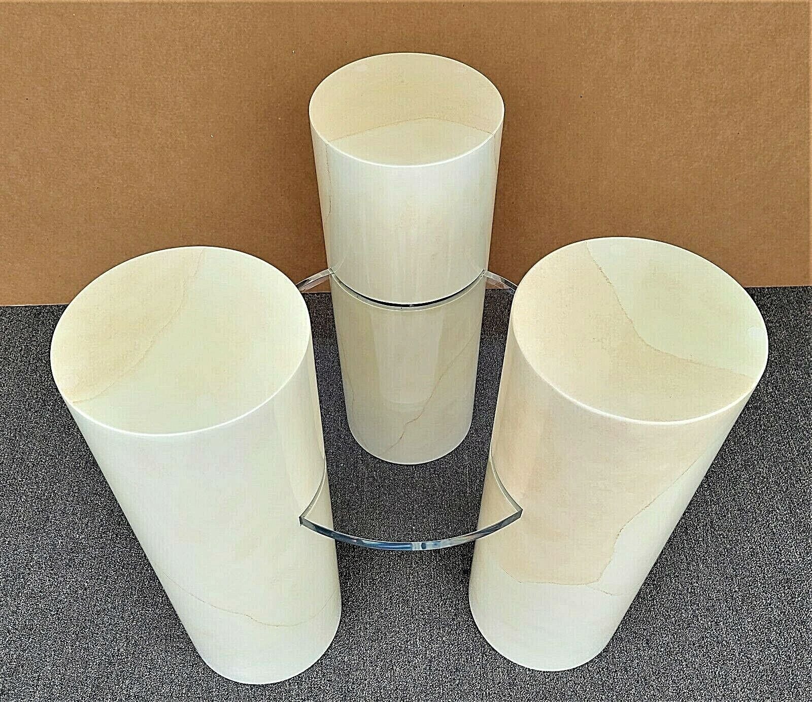 All 3 pillars are linked/secured together by the Lucite centerpiece which is not removable. Glass top is not included but we do have glass available at our showroom that would work with this base. If you decide to purchase a piece of glass from us there would be an additional charge and the shipping cost would also increase. Depending on your location, it can be easier and cheaper to find a piece of glass at a Habitat Restore or other thrift store.