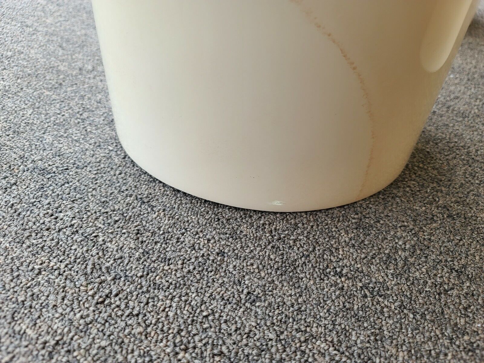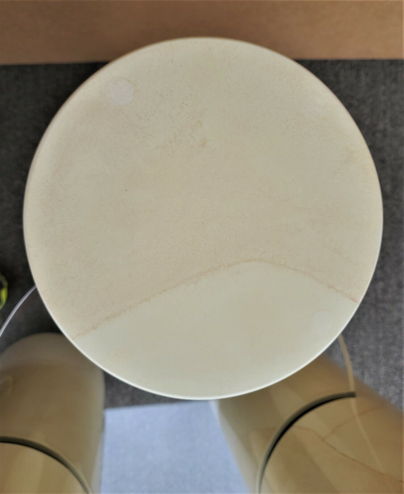 In good structurally sound and sturdy condition. The is a small touched-up spot near the base of 1 pillar and some faint small circles on the tops of the pillars from the silicone protectors that were previously there. These circles are hard to see when the tabletop is on or they can be covered up with other silicone protectors.