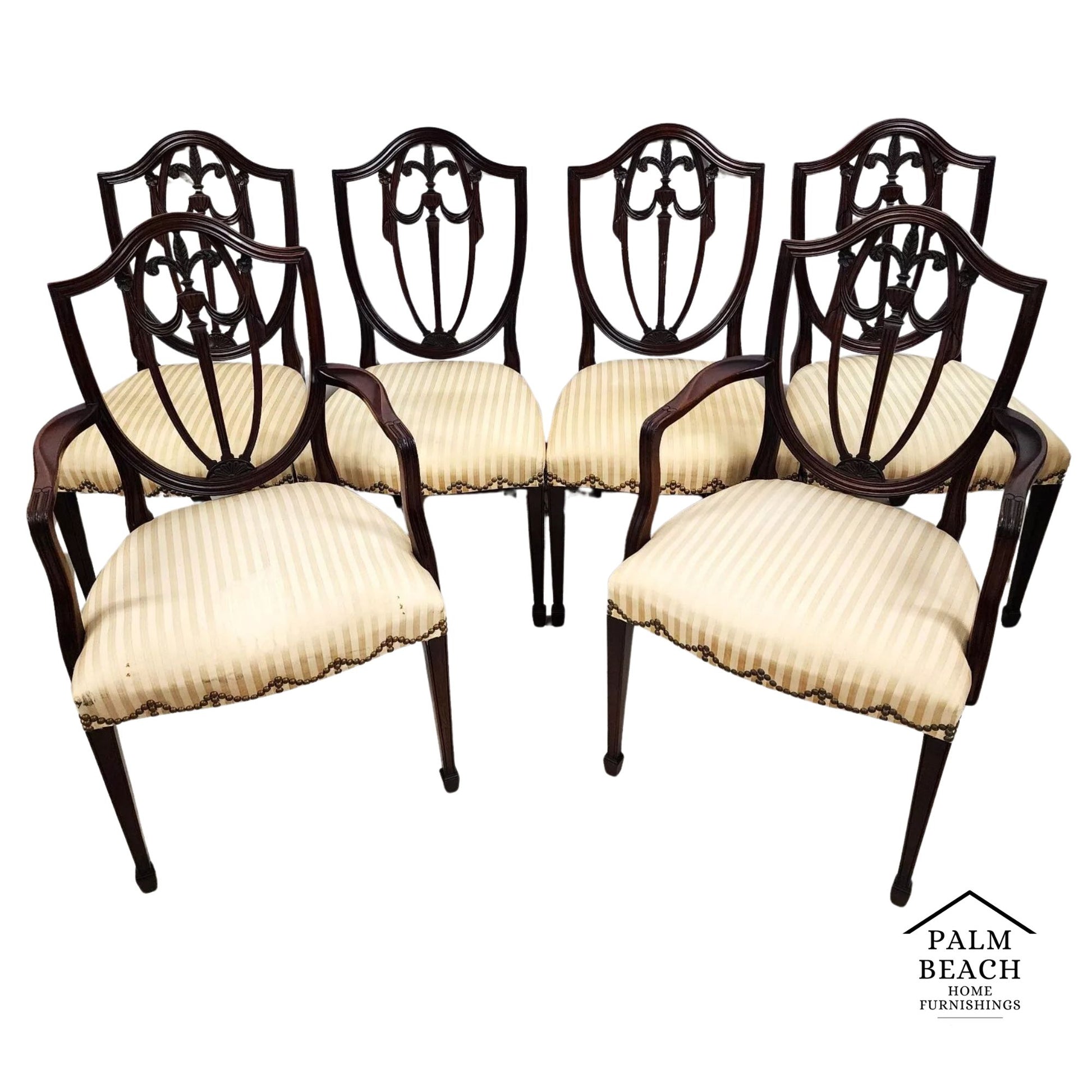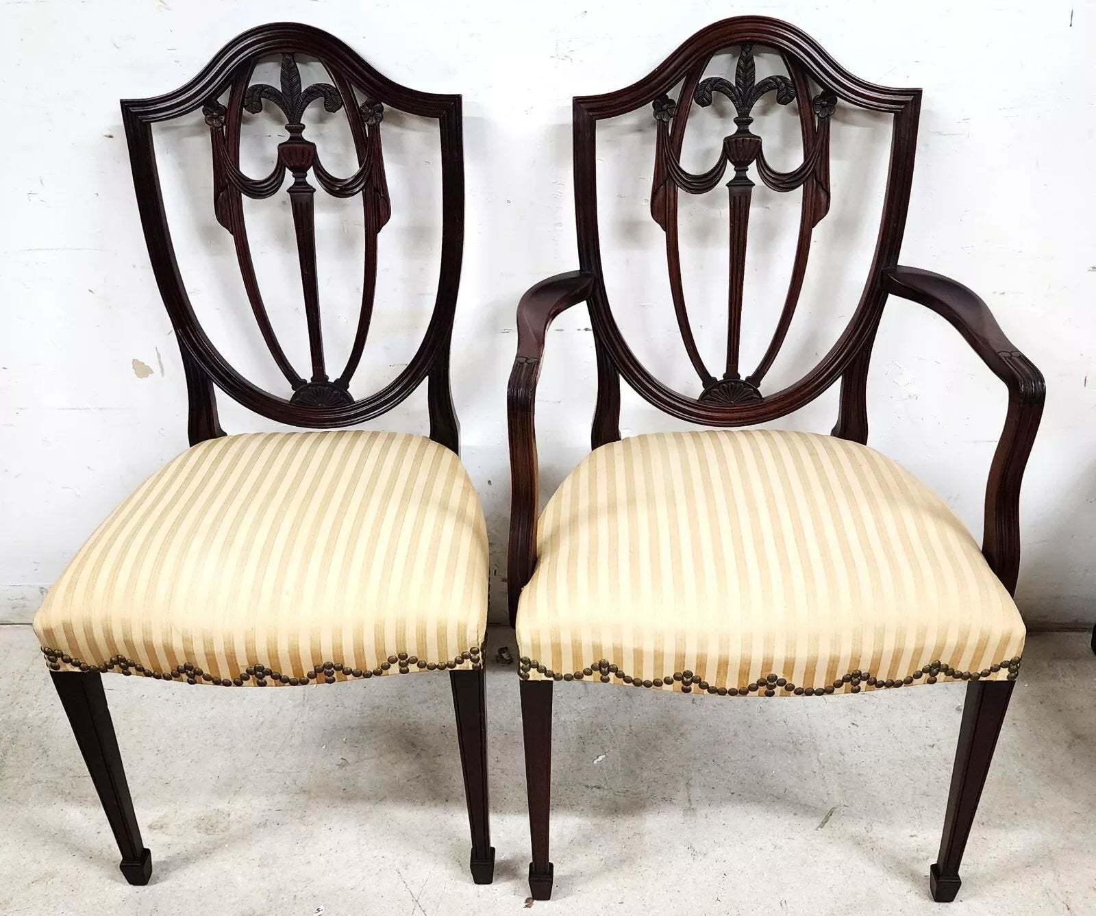 These Shield Back Dining Chairs feature hand-carved swags, rosettes, and a Prince of Wales plume which represent the best of the Federal period shield-back chairs with spring supported seats.