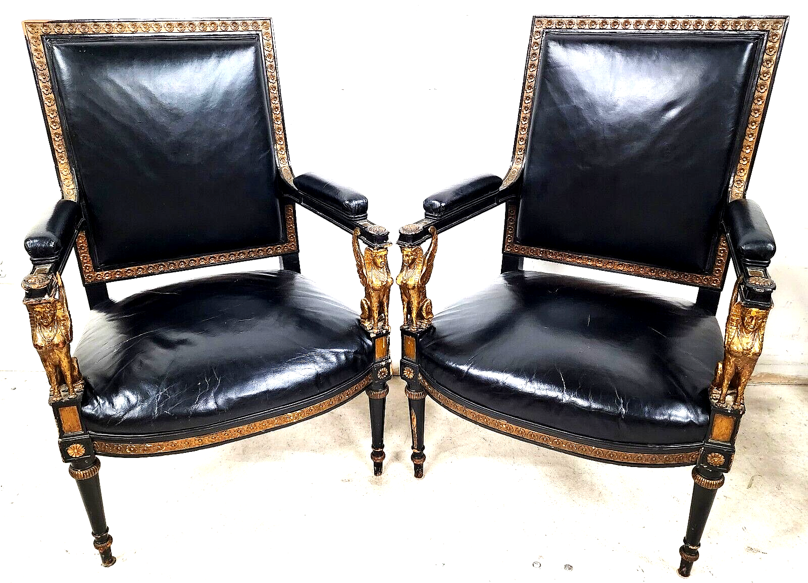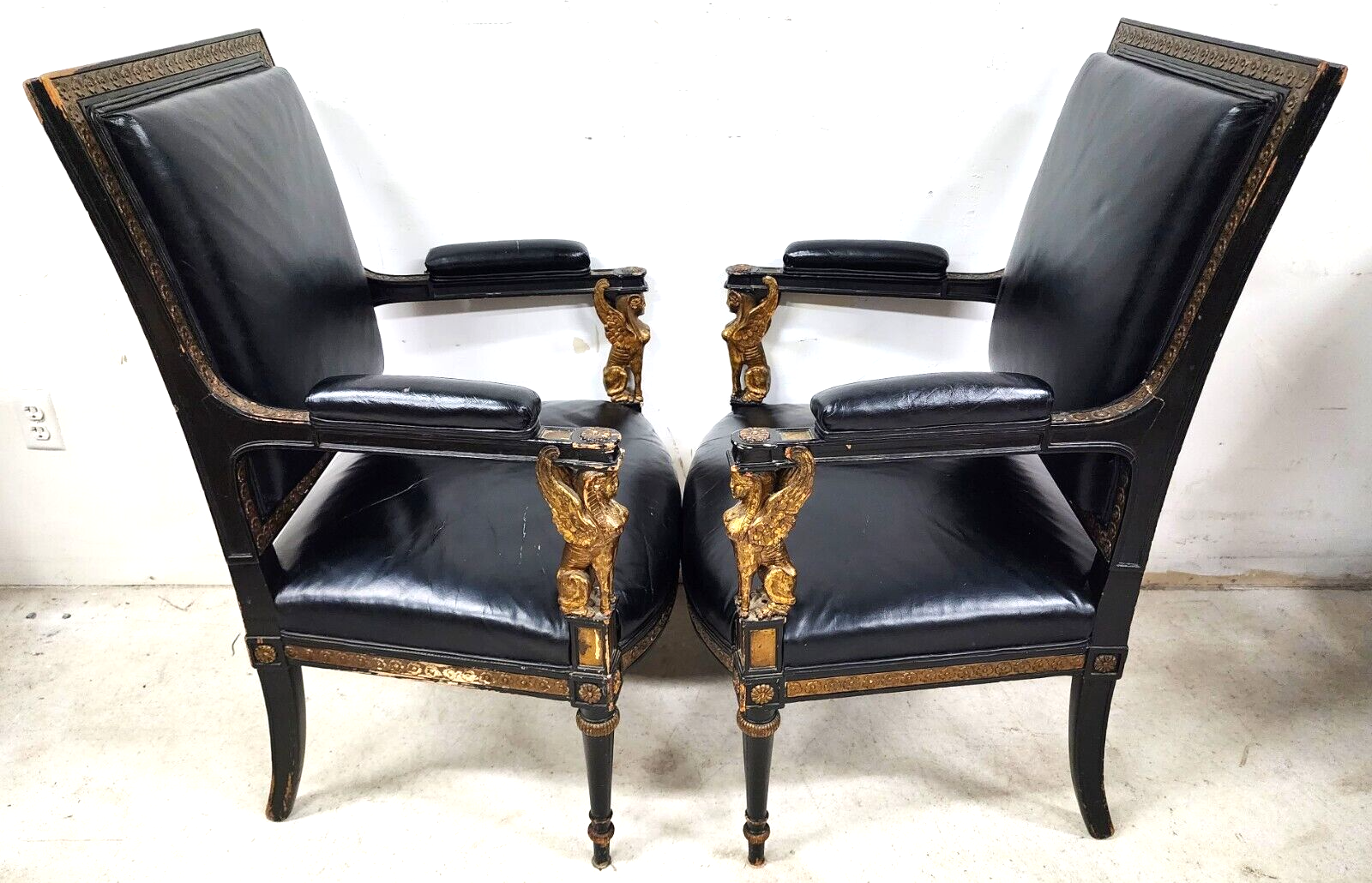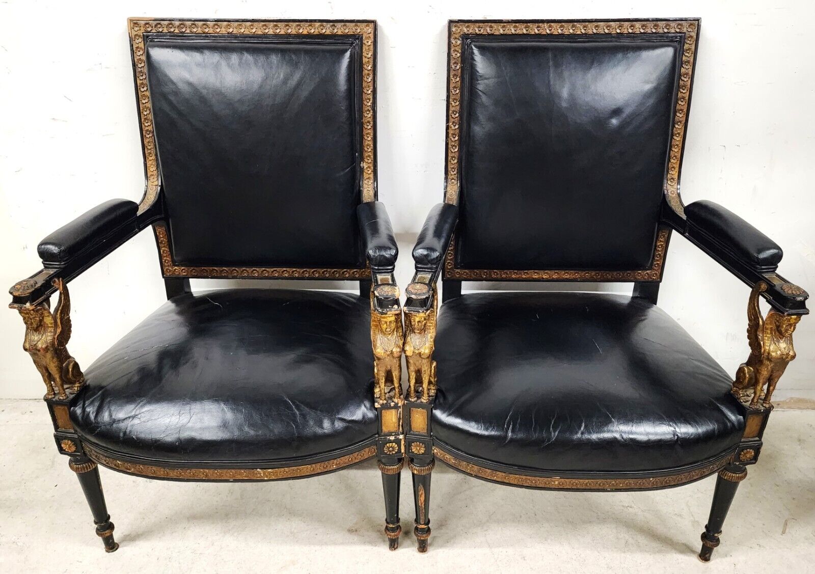 Pair of Mid Century Empire Style Leather Armchairs with Sphinx Arm Supports