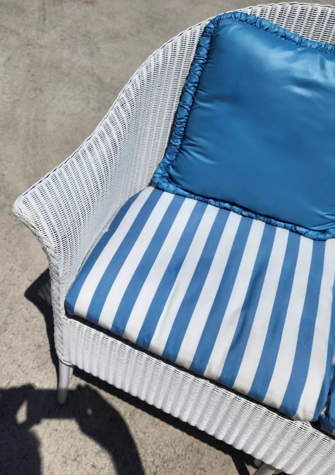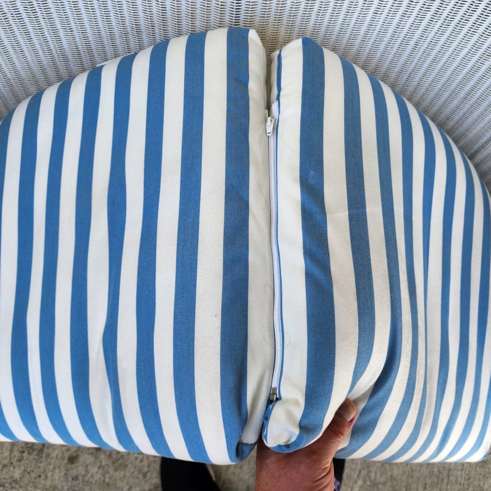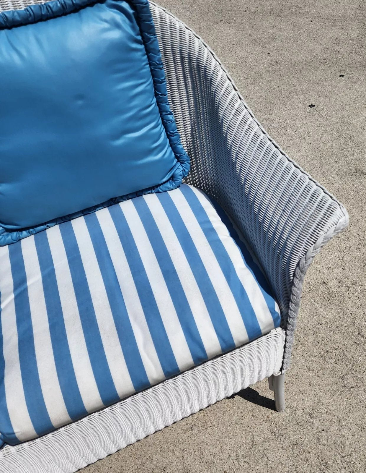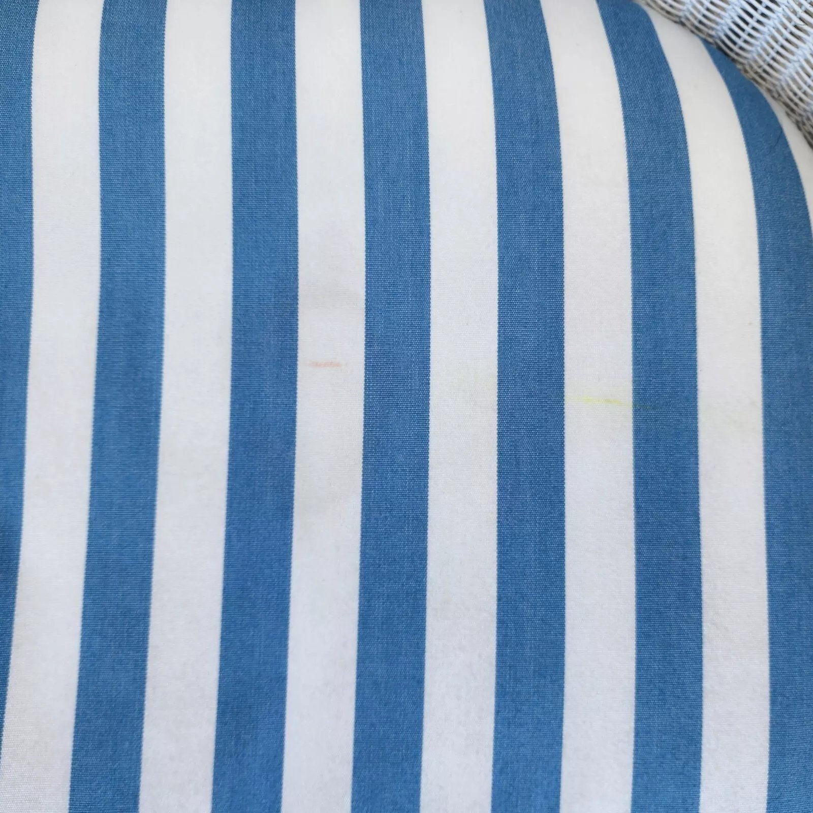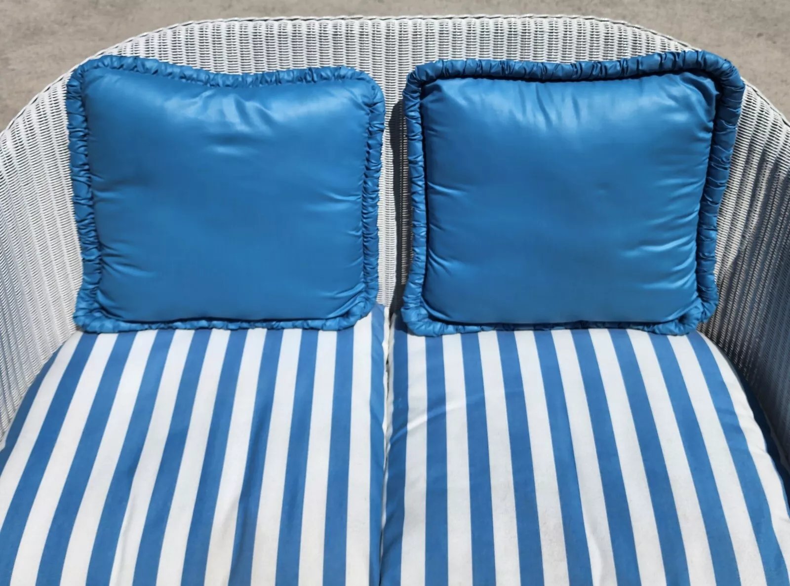 Structurally sound and sturdy with no notable damage to wicker. Pillows and cushion are very clean with a few faint small discolorations on the underside of the seat cushion (see last 2 pics). Has some scratches near the bottom of the legs. The photos and video are an important part of the item description and condition so please use the zoom feature to view them closely.