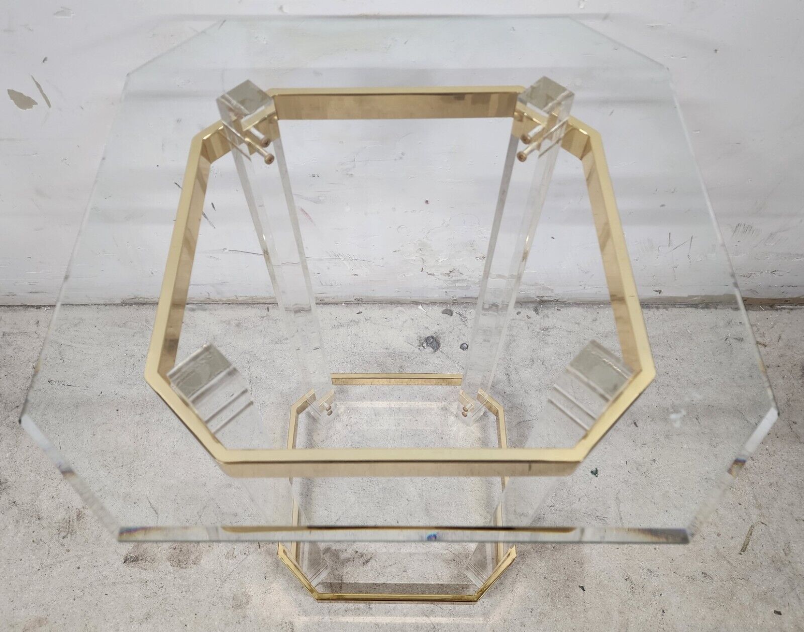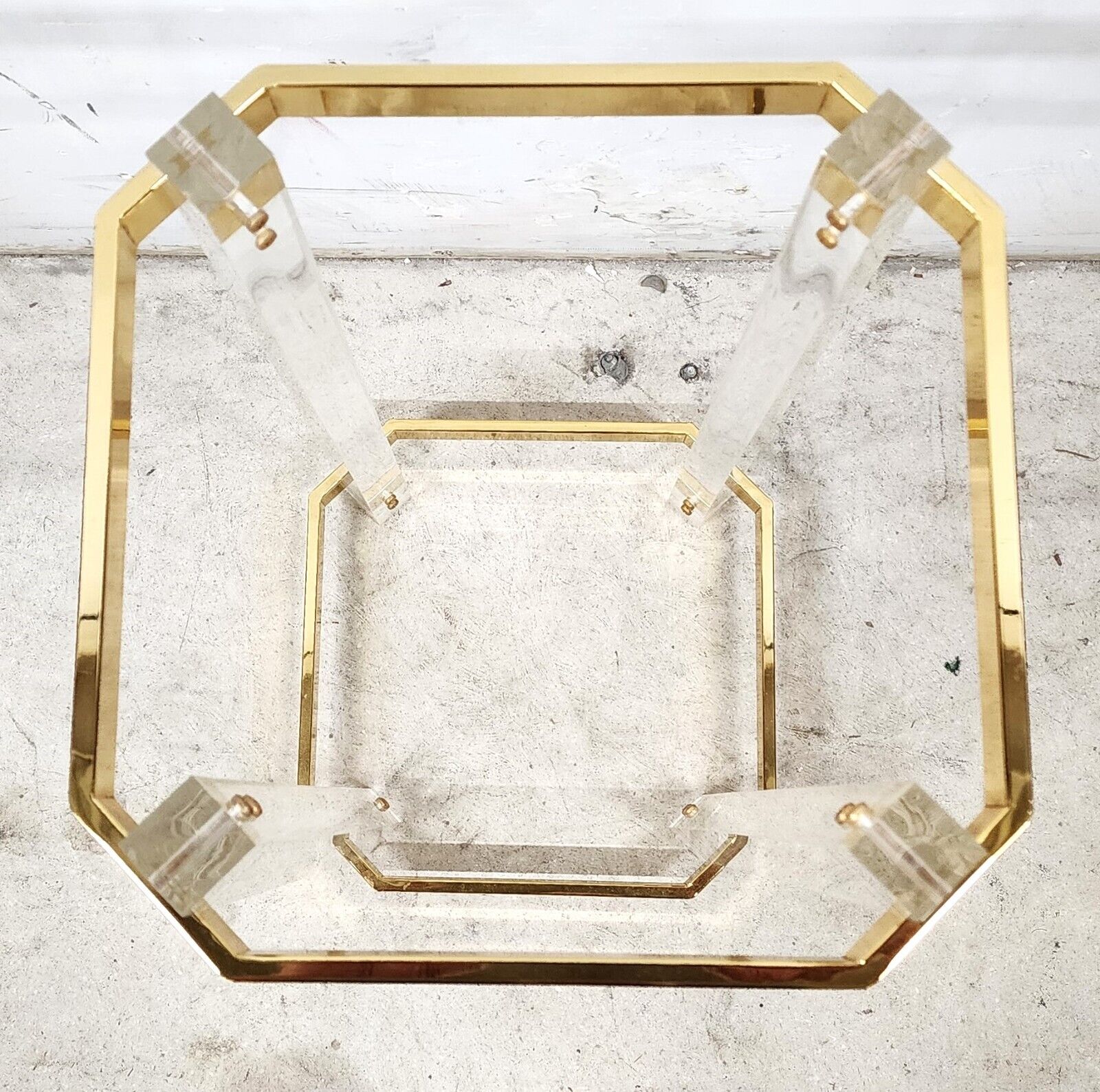 In good, structurally sound, and sturdy condition. No damage, spotting, oxidation, or other notable damage to gold plating surfaces (the darker areas on the gold in the photos are reflections). Lucite may have some very light scratches which are visible upon close inspection. The original beveled glass top has no chips but may have some light scratches. The photos are an important part of the item description and condition so please use the zoom feature to view them closely.