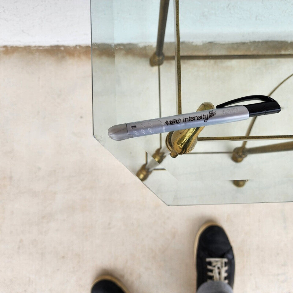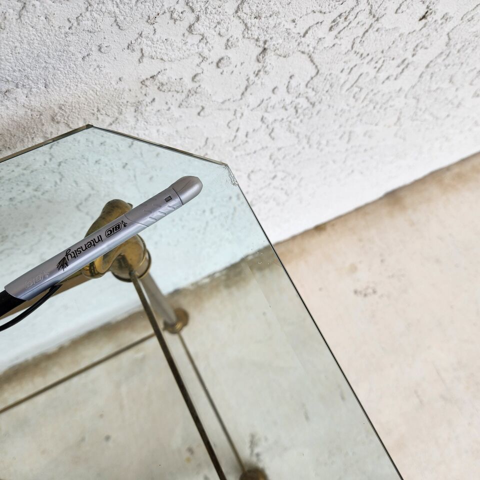 Base is in good, structurally sound, and sturdy condition with some patina as shown. The beveled glass top has 2 small chips on the underside side edges as shown in the last to photos. The photos are an important part of the item description and condition so please use the zoom feature to view them closely.