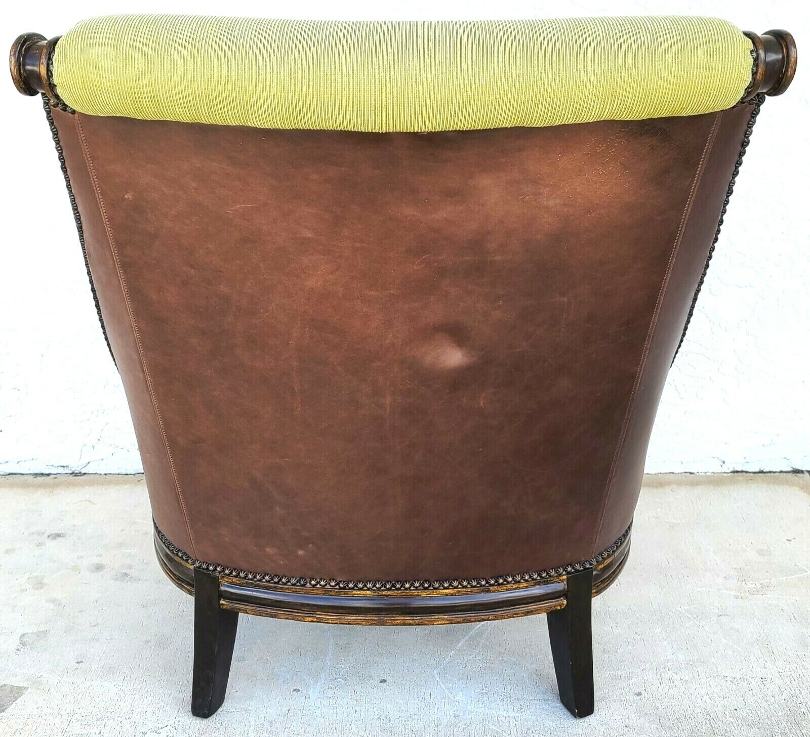 Impressively scaled with Leather back, distressed wood finish highlighted with subtle gilt accents, and French nail trim.